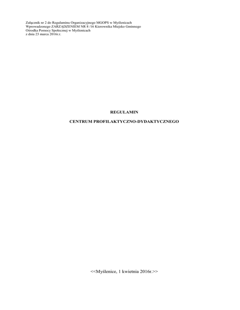 Załącznik nr 2 do Regulaminu Organizacyjnego MGOPS w Myślenicach Wprowadzonego ZARZĄDZENIEM NR 8 /16 Kierownika Miejsko Gminnego Ośrodka Pomocy Społecznej w Myślenicach z dnia 23 marca 2016r.r. REGULAMIN CENTRUM PROFILAKTYCZNO-DYDAKTYCZNEGO <<Myślenice, 1 kwietnia 2016r.>> Rozdział I Postanowienia ogólne §1 1. Niniejszy Regulamin określa szczegółową organizację i zakres działania Centrum Profilaktyczno- 2. 3. 4. 5. Dydaktycznego, będącego komórką organizacyjną Miejsko Gminnego Ośrodka Pomocy Społecznej w Myślenicach. Centrum działa na podstawie następujących przepisów: a) ustawy z dnia 9 czerwca 2011 r. o wspieraniu rodziny i systemie pieczy zastępczej (Dz. U. z 2011r. poz. 887), b) ustawie z dnia 29 lipca 2005r. o przeciwdziałaniu przemocy w rodzinie (Dz.U. z 2005r. poz. 1493), c) ustawy z dnia 26 października 1982r. o wychowaniu w trzeźwości i przeciwdziałaniu alkoholizmowi (t. j. Dz. U. z 2002r. poz. 1231 z późn. zmianami), d) ustawy z dnia 12 marca 2004r. o pomocy społecznej (t. j. Dz. U. z 2009r. poz. 1362 z późn. zmianami), e) ustawy z dnia 29 lipca 2005r. o przeciwdziałaniu narkomanii (t.j. Dz. U. z 2005r. poz. 1485), f) aktów wykonawczych do tych ustaw, g) Statutu Miejsko Gminnego Ośrodka Pomocy Społecznej w Myślenicach. W skład Centrum wchodzi: a) Punkt Konsultacyjny dla Osób Uzależnionych i Współuzależnionych, b) Środowiskowa Świetlica Socjoterapeutyczna. Celem Centrum jest kompleksowe wspieranie rodzin, dzieci i młodzieży oraz osób będących w potrzebie, a w szczególności pomoc osobom dotkniętym problemem choroby alkoholowej oraz przemocy, z terenu miasta i gminy Myślenice. Korzystanie z usług Centrum jest nieodpłatne. §2 Ilekroć w Regulaminie jest mowa o: 1. MGOPS – należy przez to rozumieć Miejsko Gminny Ośrodek Pomocy Społecznej w Myślenicach, 2. Centrum, albo CPD - należy przez to rozumieć Centrum Profilaktyczno-Dydaktyczne w Myślenicach, 3. Świetlicy – należy przez to rozumieć placówkę wsparcia dziennego, prowadzoną w formie specjalistycznej - Środowiskową Świetlicę Socjoterapeutyczną w Myślenicach, 4. Placówce - należy przez to rozumieć Środowiskową Świetlicę Socjoterapeutyczną w Myślenicach, 5. Punkcie - należy przez to rozumieć Punkt Konsultacyjny dla Osób Uzależnionych i Współuzależnionych, 6. Ośrodku – należy przez to rozumieć Miejsko Gminny Ośrodek Pomocy Społecznej w Myślenicach, 7. Kierowniku – należy przez to rozumieć Kierownika Miejsko Gminnego Ośrodka Pomocy Społecznej w Myślenicach, 8. Koordynatorze – oznacza to osobę organizującą i odpowiedzialną za pracę Centrum. Można łączyć funkcję koordynatora ze specjalistą opieki i wychowania nad dziećmi. Decyzje w tym zakresie podejmuje Kierownik. 9. Pracownikach – należy przez to rozumieć pracowników zatrudnionych w MGOPS, 10. Specjalistach – należy przez to rozumieć pracowników, wykonujących zadania w zakresie: logopedii, socjoterapii, pedagogiki, psychologii, terapii uzależnień, psychoterapii, opieki i wychowania nad dziećmi, prawa, pracy socjalnej, mediacji. 11. Wychowawcy – oznacza to osobę sprawującą opiekę i wychowanie nad dziećmi pozostającymi w Świetlicy, 12. Zespole ds. asysty rodzinnej - należy przez to rozumieć zespół pracowników składający się ze specjalistów pracujących w Punkcie Konsultacyjnym i Świetlicy, pracowników socjalnych i asystentów rodziny, powstający każdorazowo dla potrzeb rozwiązania problemów rodziny, Rozdział II Centrum Profilaktyczno-Dydaktyczne 1. 2. 3. 4. 5. §3 Centrum mieści się w budynku gminnym w Myślenicach, przy ul. H. Jordana 3; zajmuje dwie kondygnacje w budynku „Sokół”. Czynne jest od poniedziałku do piątku w godzinach dopołudniowych i popołudniowych. Szczegółowe godziny otwarcia Centrum, pracy poszczególnych specjalistów oraz godziny spotkań grup pomocowych określa zarządzenie Kierownika MGOPS w Myślenicach. Funkcjonowanie Centrum finansowane jest z budżetu Miasta i Gminy Myślenice ze środków pozyskanych z opłat za zezwolenia na sprzedaż i podawanie napojów alkoholowych, a w zakresie przeciwdziałania przemocy ze środków pochodzących z budżetu MGOPS. Zadania określone w §4 realizują pracownicy zatrudnieni na umowę o pracę lub umowę zlecenie w zależności od potrzeb. Za prawidłowe funkcjonowanie Centrum odpowiada jego Koordynator, którego wyznacza kierownik MGOPS i który jest służbowo podległy kierownikowi. §4 Do zadań Centrum należy: a) wspieranie funkcji opiekuńczej rodzin poprzez objęcie dzieci opieką i wychowaniem, w tym dzieci pochodzących z rodzin, w których występuje problem uzależnienia od alkoholu lub przemocy, bądź innym dzieciom wyrażającym chęć uczestnictwa w zajęciach, b) udzielanie wsparcia: pedagogicznego, psychologicznego, psychoterapeutycznego, logopedycznego, pomocy terapeutycznej, socjoterapeutycznej oraz prawnej i pracy socjalnej - osobom i rodzinom tego potrzebującym, zwłaszcza w przypadku osób nadużywających alkoholu, c) prowadzenie profilaktycznej działalności informacyjnej i edukacyjnej z zakresu przeciwdziałania nadużywaniu alkoholu, używania środków odurzających oraz innych zagrożeń i patologii, d) udzielanie pomocy osobom/rodzinom: - doznającym przemocy w rodzinie lub stosującym przemoc wobec członków rodziny, - uzależnionym i współuzależnionym, - niewydolnym wychowawczo, - przeżywającym trudności. e) prowadzenie mediacji, ze szczególnym uwzględnieniem mediacji zmierzającej do leczenia odwykowego osób uzależnionych od alkoholu. f) rozpoznawanie zjawiska przemocy domowej, udzielanie stosownego wsparcia i informacji o możliwości uzyskania pomocy i powstrzymania przemocy oraz terapii osobom uwikłanym w zjawisko przemocy, g) rozpoznawanie zjawiska niewydolności opiekuńczo-wychowawczej oraz prowadzenie niezbędnej terapii, h) udzielanie informacji na temat dostępnych miejsc pomocy i komp