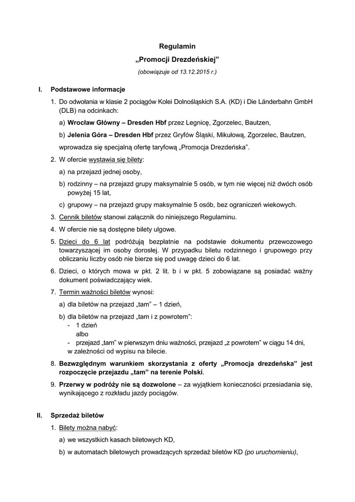 Regulamin „Promocji Drezdeńskiej” (obowiązuje od 13.12.2015 r.) I. Podstawowe informacje 1. Do odwołania w klasie 2 pociągów Kolei Dolnośląskich S.A. (KD) i Die Länderbahn GmbH (DLB) na odcinkach: a) Wrocław Główny – Dresden Hbf przez Legnicę, Zgorzelec, Bautzen, b) Jelenia Góra – Dresden Hbf przez Gryfów Śląski, Mikułową, Zgorzelec, Bautzen, wprowadza się specjalną ofertę taryfową „Promocja Drezdeńska”. 2. W ofercie wystawia się bilety: a) na przejazd jednej osoby, b) rodzinny – na przejazd grupy maksymalnie 5 osób, w tym nie więcej niż dwóch osób powyżej 15 lat, c) grupowy – na przejazd grupy maksymalnie 5 osób, bez ograniczeń wiekowych. 3. Cennik biletów stanowi załącznik do niniejszego Regulaminu. 4. W ofercie nie są dostępne bilety ulgowe. 5. Dzieci do 6 lat podróżują bezpłatnie na podstawie dokumentu przewozowego towarzyszącej im osoby dorosłej. W przypadku biletu rodzinnego i grupowego przy obliczaniu liczby osób nie bierze się pod uwagę dzieci do 6 lat. 6. Dzieci, o których mowa w pkt. 2 lit. b i w pkt. 5 zobowiązane są posiadać ważny dokument poświadczający wiek. 7. Termin ważności biletów wynosi: a) dla biletów na przejazd „tam” – 1 dzień, b) dla biletów na przejazd „tam i z powrotem”: - 1 dzień albo - przejazd „tam” w pierwszym dniu ważności, przejazd „z powrotem” w ciągu 14 dni, w zależności od wypisu na bilecie. 8. Bezwzględnym warunkiem skorzystania z oferty „Promocja drezdeńska” jest rozpoczęcie przejazdu „tam” na terenie Polski. 9. Przerwy w podróży nie są dozwolone – za wyjątkiem konieczności przesiadania się, wynikającego z rozkładu jazdy pociągów. II. Sprzedaż biletów 1. Bilety można nabyć: a) we wszystkich kasach biletowych KD, b) w automatach biletowych prowadzących sprzedaż biletów KD (po uruchomieniu), c) w pociągu u konduktora KD. 2. Przedsprzedaż biletów wynosi 30 dni. III. Zmiana/rozwiązanie umowy przewozu 1. Wymiana biletu jest możliwa przed rozpoczęciem jego terminu ważności. Po rozpoczęciu terminu ważności wymiana nie jest możliwa: należy nabyć nowy bilet, o zwrot należności za niewykorzystany bilet można wnioskować drogą reklamacji. 2. Zwrot biletu (po potrąceniu odstępnego) jest możliwy przed rozpoczęciem jego terminu ważności. Po rozpoczęciu terminu ważności o zwrot należności za niewykorzystany bilet można wnioskować drogą reklamacji. 3. Pasażer może rozpocząć lub zakończyć podróż na stacji pośredniej w ramach ważności biletu, lecz pasażerowi nie przysługuje częściowy zwrot należności za niewykorzystany odcinek. 4. W przypadku wykorzystania biletu ważnego w relacji „tam i z powrotem” wyłącznie na przejazd „tam”, pasażerowi przysługuje częściowy zwrot należności za niezrealizowany przejazd powrotny. Zwrotu należności za częściowo niewykorzystane (odpowiednio poświadczone) bilety dokonuje się w drodze reklamacji udzielając zwrotu różnicy należności pomiędzy ceną posiadanego biletu a ceną biletu na przejazd „tam” w ofercie „Promocja Drezdeńska”. 5. W przypadku wykorzystania biletu rodzinnego/grupowego przez mniejszą liczbę osób niż wynika to z niniejszego Regulaminu, nie dokonuje się częściowego zwrotu należności. 6. Przejazd do stacji położonej poza odcinkiem wskazanym na bilecie nie jest możliwy. 7. Wnioski o wymianę/zwrot biletu oraz częściowy zwrot należności rozpatrują KD. IV. Pozostałe postanowienia 1. Ofertę „Promocja Drezdeńska” łączy się wyłącznie z ofertą biletów na przewóz roweru/ psa/bagażu (bez wskazanej relacji na bilecie), wystawianych zgodnie z Taryfą Przewozową (TP-KD). Nabyty bilet na przewóz roweru/psa/ bagażu, łącznie z biletem na przejazd „tam” wystawionym w ofercie „Promocja Drezdeńska”, uprawnia do przewozu roweru/psa/bagażu do stacji Dresden Hbf. Na przejazd w relacji „tam i z powrotem” należy nabyć dwa oddzielne bilety na przewóz roweru/psa/bagażu ze wskazaniem daty przewozu „tam” i „z powrotem” 2. Na odcinkach Wrocław Główny – granica państwa i Jelenia Góra – granica państwa w sprawach nieuregulowanych w niniejszym Regulaminie stosuje się odpowiednie zapisy Regulaminu Przewozu (RP-KD) i Taryfy Przewozowej (TP-KD). Załącznik do Regulaminu „Promocji Drezdeńskiej” Cennik biletów w ofercie „Promocja Drezdeńska” 1. Bilet na przejazd 1 osoby w relacji „tam”, ważny 1 dzień: a) Wrocław Gł. – Dresden Hbf: 79,00 zł, b) Legnica – Dresden Hbf: 69,00 zł, c) Zgorzelec – Dresden Hbf: 59,00 zł, d) Zgorzelec Miasto – Dresden Hbf: 59,00 zł, e) Jelenia Góra – Dresden Hbf: 64,00 zł. 2. Bilet na przejazd 1 osoby w relacji „tam i z powrotem”, ważny 1 dzień: a) Wrocław Gł. – Dresden Hbf – Wrocław Gł.: 109,00 zł, b) Legnica – Dresden Hbf – Legnica: 89,00 zł, c) Zgorzelec – Dresden Hbf – Zgorzelec: 69,00 zł, d) Zgorzelec Miasto – Dresden Hbf – Zgorzelec Miasto: 69,00 zł, e) Jelenia Góra – Dresden Hbf – Jelenia Góra: 74,00 zł. 3. Bilet na przejazd 1 osoby w relacji „tam i z powrotem”, na przejazd powrotny ważny 14 dni: a) Wrocław Gł. – Dresden Hbf – Wrocław Gł.: 139,00 zł, b) Legnica – Dresden Hbf – Legnica: 119,00 zł, c) Zgorzelec – Dresden Hbf – Zgorzelec: 99,00 zł, d) Zgorzelec Miasto – Dresden Hbf – Zgorzelec Miasto: 99,00 zł, e) Jelenia Góra – Dresden Hbf – Jelenia Góra: 109,00 zł. 4. Bilet rodzinny w relacji „tam i z powrotem”, ważny 1 dzień: a) Wrocław Gł. – Dresden Hbf – Wrocław Gł.: 229,00 zł, b) Legnica – Dresden Hbf – Legnica: 189,00 zł, c) Zgorzelec – Dresden Hbf – Zgorzelec: 139,00 zł, d) Zgorzelec Miasto – Dresden Hbf – Zgorzelec Miasto: 139,00 zł, e) Jelenia Góra – Dresden Hbf – Jelenia Góra: 159,00 zł. 5. Bilet rodzinny w relacji „tam i z powrotem”, na przejazd powrotny ważny 14 dni: a) Wrocław Gł. 