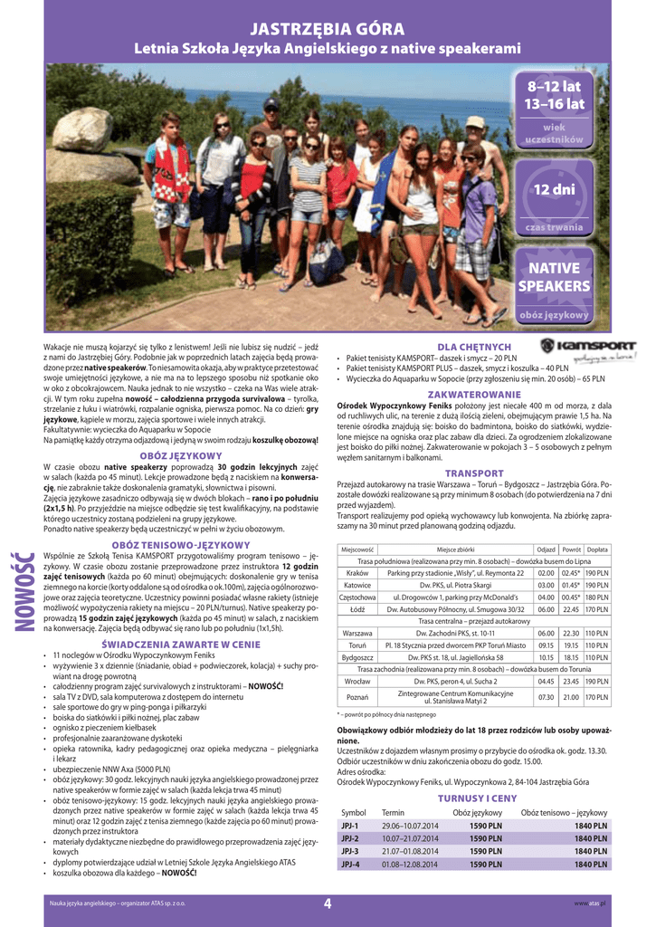 JASTRZĘBIA GÓRA Letnia Szkoła Języka Angielskiego z native speakerami 8–12 lat 13–16 lat wiek uczestników 12 dni czas trwania NATIVE SPEAKERS obóz językowy Wakacje nie muszą kojarzyć się tylko z lenistwem! Jeśli nie lubisz się nudzić – jedź z nami do Jastrzębiej Góry. Podobnie jak w poprzednich latach zajęcia będą prowadzone przez native speakerów. To niesamowita okazja, aby w praktyce przetestować swoje umiejętności językowe, a nie ma na to lepszego sposobu niż spotkanie oko w oko z obcokrajowcem. Nauka jednak to nie wszystko – czeka na Was wiele atrakcji. W tym roku zupełna nowość – całodzienna przygoda survivalowa – tyrolka, strzelanie z łuku i wiatrówki, rozpalanie ogniska, pierwsza pomoc. Na co dzień: gry językowe, kąpiele w morzu, zajęcia sportowe i wiele innych atrakcji. Fakultatywnie: wycieczka do Aquaparku w Sopocie Na pamiątkę każdy otrzyma odjazdową i jedyną w swoim rodzaju koszulkę obozową! DLA CHĘTNYCH • Pakiet tenisisty KAMSPORT– daszek i smycz – 20 PLN • Pakiet tenisisty KAMSPORT PLUS – daszek, smycz i koszulka – 40 PLN • Wycieczka do Aquaparku w Sopocie (przy zgłoszeniu się min. 20 osób) – 65 PLN ZAKWATEROWANIE OBÓZ JĘZYKOWY Ośrodek Wypoczynkowy Feniks położony jest niecałe 400 m od morza, z dala od ruchliwych ulic, na terenie z dużą ilością zieleni, obejmującym prawie 1,5 ha. Na terenie ośrodka znajdują się: boisko do badmintona, boisko do siatkówki, wydzielone miejsce na ogniska oraz plac zabaw dla dzieci. Za ogrodzeniem zlokalizowane jest boisko do piłki nożnej. Zakwaterowanie w pokojach 3 – 5 osobowych z pełnym węzłem sanitarnym i balkonami. W czasie obozu native speakerzy poprowadzą 30 godzin lekcyjnych zajęć w salach (każda po 45 minut). Lekcje prowadzone będą z naciskiem na konwersację, nie zabraknie także doskonalenia gramatyki, słownictwa i pisowni. Zajęcia językowe zasadniczo odbywają się w dwóch blokach – rano i po południu (2x1,5 h). Po przyjeździe na miejsce odbędzie się test kwalifikacyjny, na podstawie którego uczestnicy zostaną podzieleni na grupy językowe. Ponadto native speakerzy będą uczestniczyć w pełni w życiu obozowym. Przejazd autokarowy na trasie Warszawa – Toruń – Bydgoszcz – Jastrzębia Góra. Pozostałe dowózki realizowane są przy minimum 8 osobach (do potwierdzenia na 7 dni przed wyjazdem). Transport realizujemy pod opieką wychowawcy lub konwojenta. Na zbiórkę zapraszamy na 30 minut przed planowaną godziną odjazdu. TRANSPORT NOWOŚĆ OBÓZ TENISOWOJĘZYKOWY Miejscowość Wspólnie ze Szkołą Tenisa KAMSPORT przygotowaliśmy program tenisowo – językowy. W czasie obozu zostanie przeprowadzone przez instruktora 12 godzin zajęć tenisowych (każda po 60 minut) obejmujących: doskonalenie gry w tenisa ziemnego na korcie (korty oddalone są od ośrodka o ok.100m), zajęcia ogólnorozwojowe oraz zajęcia teoretyczne. Uczestnicy powinni posiadać własne rakiety (istnieje możliwość wypożyczenia rakiety na miejscu – 20 PLN/turnus). Native speakerzy poprowadzą 15 godzin zajęć językowych (każda po 45 minut) w salach, z naciskiem na konwersację. Zajęcia będą odbywać się rano lub po południu (1x1,5h). Miejsce zbiórki Odjazd Powrót Dopłata Trasa południowa (realizowana przy min. 8 osobach) – dowózka busem do Lipna Kraków Parking przy stadionie „Wisły”, ul. Reymonta 22 02.00 02.45* 190 PLN Katowice Dw. PKS, ul. Piotra Skargi 03.00 01.45* 190 PLN Częstochowa ul. Drogowców 1, parking przy McDonald’s Łódź Dw. Autobusowy Północny, ul. Smugowa 30/32 04.00 00.45* 180 PLN 06.00 22.45 170 PLN 22.30 110 PLN Trasa centralna – przejazd autokarowy Warszawa Dw. Zachodni PKS, st. 10-11 06.00 ŚWIADCZENIA ZAWARTE W CENIE Toruń Pl. 18 Stycznia przed dworcem PKP Toruń Miasto 09.15 19.15 110 PLN • 11 noclegów w Ośrodku Wypoczynkowym Feniks • wyżywienie 3 x dziennie (śniadanie, obiad + podwieczorek, kolacja) + suchy prowiant na drogę powrotną • całodzienny program zajęć survivalowych z instruktorami – NOWOŚĆ! • sala TV z DVD, sala komputerowa z dostępem do internetu • sale sportowe do gry w ping-ponga i piłkarzyki • boiska do siatkówki i piłki nożnej, plac zabaw • ognisko z pieczeniem kiełbasek • profesjonalnie zaaranżowane dyskoteki • opieka ratownika, kadry pedagogicznej oraz opieka medyczna – pielęgniarka i lekarz • ubezpieczenie NNW Axa (5000 PLN) • obóz językowy: 30 godz. lekcyjnych nauki języka angielskiego prowadzonej przez native speakerów w formie zajęć w salach (każda lekcja trwa 45 minut) • obóz tenisowo-językowy: 15 godz. lekcyjnych nauki języka angielskiego prowadzonych przez native speakerów w formie zajęć w salach (każda lekcja trwa 45 minut) oraz 12 godzin zajęć z tenisa ziemnego (każde zajęcia po 60 minut) prowadzonych przez instruktora • materiały dydaktyczne niezbędne do prawidłowego przeprowadzenia zajęć językowych • dyplomy potwierdzające udział w Letniej Szkole Języka Angielskiego ATAS • koszulka obozowa dla każdego – NOWOŚĆ! Bydgoszcz Dw. PKS st. 18, ul. Jagiellońska 58 10.15 18.15 110 PLN Nauka języka angielskiego – organizator ATAS sp. z o.o. Trasa zachodnia (realizowana przy min. 8 osobach) – dowózka busem do Torunia Wrocław Dw. PKS, peron 4, ul. Sucha 2 04.45 23.45 190 PLN Poznań Zintegrowane Centrum Komunikacyjne ul. Stanisława Matyi 2 07.30 21.00 170 PLN * – powrót po północy dnia następnego Obowiązkowy odbiór młodzieży do lat 18 przez rodziców lub osoby upoważnione. Uczestników z dojazdem własnym prosimy o przybycie do ośrodka ok. godz. 13.30. Odbiór uczestników w dniu zakończenia obozu do godz. 15.00. Adres ośrodka: Ośrodek Wypoczynkowy Feniks, ul. Wypoczynkowa 2, 84-104 Jastrzębia Góra TURNUSY I CENY Symbol JPJ-1 JPJ-2 JPJ-3 JPJ-4 4 Termin 29.06–10.07.2014 10.07–21.07.2014 21.07–01.08.2014 01.08–12.08.2014 Obóz językowy 1590 PLN 1590 PLN 