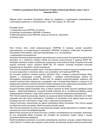 Protokół z posiedzenia Rady Działalności Pożytku Publicznego Miasta Lublin z dnia 4 listopada 2016 r. Miejsce obrad: Kancelaria Prezydenta, referat ds. współpracy z organizacjami pozarządowymi i partycypacji społecznej, ul. Bernardyńska 3, sala 109 (I piętro), 20-109 Lublin Porządek obrad: 1) Inauguracja pracy RDPPML III kadencji. 2) Dyskusja na priorytetami RDPPML III kadencji. 3) Rekomendowanie przez RDPPML osoby do Komisji ds. stypendiów. 4) Sprawy różne. Piotr Choroś, który został przewodniczącym RDPPML III kadencji, powitał wszystkich zgromadzonych na inauguracyjnym posiedzeniu RDPPML III kadencji. Oddał głos Prezydentowi Krzysztofowi Komorskiemu, który jest odpowiedzialny m.in. za współpracę z organizacjami pozarządowymi. Prezydent Komorski powitał wszystkich zgromadzonych w imieniu pana Prezydenta Krzysztofa Żuka. Zauważył, że z niektórymi osobami widział się podczas podsumowania II kadencji RDPP ML. Dzisiejsze spotkanie zostało podyktowane inauguracją nowej kadencji Rady, Prezydent Komorski wręczył nominacje nowym członkom RDPP ML. Po rozdaniu nominacji Prezydent Komorski pożegnał się ze wszystkim i opuścił posiedzenie. Piotr Choroś przedstawił porządek obrad. Podczas posiedzenia zostanie poruszona kwestia komisji do spraw stypendiów w dziedzinie kultury oraz priorytetów na III kadencję RDPP ML. Na początku spotkania zostanie wybrany sekretarz Rady i zastępca przewodniczącego Rady. Zgodnie z obowiązująca uchwałą, sekretarza i zastępcę przewodniczącego wybiera się bezwzględną większością głosów. Ważne jest, że zastępca przewodniczącego wybierany jest spośród członków Rady wskazanych w paragrafie 4 pkt 3 Uchwały Rady Miasta co oznacza to, że zastępca jest wybierany spośród osób które zostały wskazane przez organizacje pozarządowe. Piotr Choroś poprosił o propozycje kandydatów i kandydatek na te dwie funkcje. Krzysztof Kowalik zgłosił kandydata, który w trakcie wyborów do Rady otrzymał największa liczbę głosów – Bartłomieja Bałabana. Krzysztof Kowalik stwierdził, że to, że Bartłomiej Bałaban zebrał najwięcej głosów świadczy o jego dużym poparciu w środowisku organizacji pozarządowych. Piotr Choroś zapisał tą propozycję. Zapytał czy są jeszcze jakieś kandydatury. Stwierdził, że w takim przypadku jest tylko jedna kandydatura. Powiedział, że kandydata może zgłosić każdy ale sam kandydat musi być nominowany z kręgu osób z organizacji pozarządowych. Jolanta Prochowicz zdecydowała się zgłosić kandydaturę Marty Kurowskiej. Piotr Choroś zapytał czy Marta Kurowska się zgadza. Marta Kurowska wyraziła zgodę. Piotr Choroś powiedział, że przez te dwie kadencje przyjęto sposób głosowania na kartkach, gdzie zaznacza się numer kandydata/kandydatki. Marta Wcisło zwróciła się do Piotra Chorosia z prośbą o przedstawienie się kandydata. Stwierdziła, że zna kandydatkę Martę Kurowską, ale chciałaby się dowiedzieć czegoś więcej o drugim kandydacie Bartłomieju Bałabanie. Bartłomiej Bałaban powiedział, że posiada wykształcenie prawnicze, pracuje w sądzie Rejonowym Lublin Zachód. Z miastem jest związany w taki sposób, że interesuje się jego historią prowadzi dwie strony internetowe dotyczące miasta Lublin, z jego informacji wynika, że są to najpopularniejsze blogi dotyczące naszego miasta. Jest zaangażowany w działalność Fundacji Wolności, która działa na zasadzie jawności i transparentności. Bartłomiej wyraził swoja radość, że znalazł się w gronie członków RDPP ML. Głos zabrała Marta Kurowska, została wskazana na kandydatkę do RDPP ML ze Stowarzyszenia Absolwentów UMCS, ale nie jest to jedyna organizacja pozarządowa, z która kandydatka jest związana ponieważ działalności społeczna w organizacjach pozarządowych zajmuje się około 20 lat, zaczynała w Stowarzyszeniu w Stronę Sztuki, podczas przygotowywania aplikacji do ESK 2016 okazało się, że nie może społecznie zajmować się sprawami osób dorosłych ponieważ stowarzyszenie w Stronę Sztuki było skierowane wyłącznie do wspierania wybitnie uzdolnionych dzieci, dlatego założyła Fundację tu obok, którą prowadzi, koordynowała projekty dotyczące przestrzeni miejskiej oraz wolontariuszy kultury plus czyli osób aktywnych, działających na rzecz kultury, w tzw. wieku „plus”. Marta Kurowska zajmuje się również działaniem na rzecz innych organizacji pozarządowych, współpracuje z wieloma organizacjami, jest fanką trzeciego sektora a zwłaszcza partycypacji czyli udziału mieszkańców w zarządzaniu miastem. Działa również w Radzie Dzielnicy Wieniawa. Piotr Choroś rozpoczął głosowanie, każda osoba dostała kartkę do głosowania, na której ma wpisać wybrany, jeden numer kandydata na zastępcę przewodniczącego Rady; numer 1 – Bartłomiej Bałaban, numer 2 - Marta Kurowska. Głosowanie na zastępcę przewodniczącego RDPP ML przebiegło poprawnie. Piotr Choroś ogłosił wyniki: Podczas głosowania oddano 15 ważnych głosów, 5 głosów na Bartłomieja Bałabana, 10 głosów na Martę Kurowską. Marta Kurowska podziękowała za okazane zaufanie. Kolejne głosowanie dotyczyło wyboru sekretarza Rady. Marta Kurowska zgłosiła jako kandydata Bartłomieja Bałabana, on jednak odmówił uczestnictwa w kandydowaniu na sekretarza. Marcin Garbowski zgłosił kandydata na sekretarza Filipa Trubalskiego, który zgodził się kandydować. Piotr Choroś zapytał czy są jeszcze jakieś zgłoszenia kandydatów na sekretarza. Formalnie głosowanie musi być przeprowadzone nawet przy jednej kandydaturze. Piotr Choroś poprosił Filipa Trubalskiego o powiedzenie kilku słów o sobie. Filip Trubalski podziękował za kandydaturę, przez 3 lata był radnym Młodzieżowej Rady Miasta Lublin, w kadencji VI był wiceprzewodniczącym i VII był przewodniczącym Młodzieżowej Rady Miasta Lublin, przez dwa lata był członkiem pre