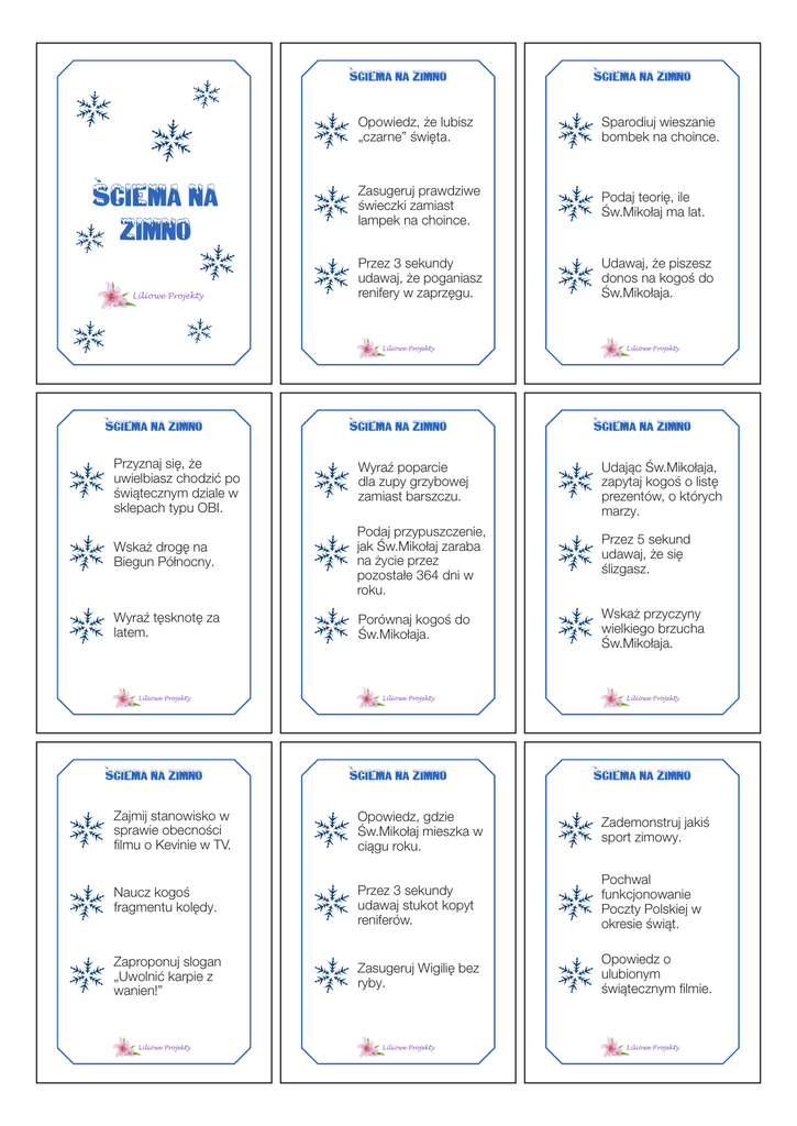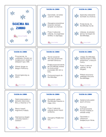`SCIEMA NA ZIMNO ` SCIEMA NA ZIMNO `SCIEMA NA ZIMNO Opowiedz, że lubisz „czarne” święta. Sparodiuj wieszanie bombek na choince. Zasugeruj prawdziwe świeczki zamiast lampek na choince. Podaj teorię, ile Św.Mikołaj ma lat. Przez 3 sekundy udawaj, że poganiasz renifery w zaprzęgu. Udawaj, że piszesz donos na kogoś do Św.Mikołaja. `SCIEMA NA ZIMNO Przyznaj się, że uwielbiasz chodzić po świątecznym dziale w sklepach typu OBI. Wyraź poparcie dla zupy grzybowej zamiast barszczu. Wskaż drogę na Biegun Północny. Podaj przypuszczenie, jak Św.Mikołaj zaraba na życie przez pozostałe 364 dni w roku. Wyraź tęsknotę za latem. Porównaj kogoś do Św.Mikołaja. `SCIEMA NA ZIMNO `SCIEMA NA ZIMNO `SCIEMA NA ZIMNO `SCIEMA NA ZIMNO Udając Św.Mikołaja, zapytaj kogoś o listę prezentów, o których marzy. Przez 5 sekund udawaj, że się ślizgasz. Wskaż przyczyny wielkiego brzucha Św.Mikołaja. `SCIEMA NA ZIMNO Zajmij stanowisko w sprawie obecności filmu o Kevinie w TV. Opowiedz, gdzie Św.Mikołaj mieszka w ciągu roku. Zademonstruj jakiś sport zimowy. Naucz kogoś fragmentu kolędy. Przez 3 sekundy udawaj stukot kopyt reniferów. Pochwal funkcjonowanie Poczty Polskiej w okresie świąt. Zaproponuj slogan „Uwolnić karpie z wanien!” Zasugeruj Wigilię bez ryby. Opowiedz o ulubionym świątecznym filmie. A AN M E I `SC `SCIEM O ZIMN A O IMN NA Z IEMA C A NA `SCIEM IMN Z A N A IMN NA Z N MNO ZI A NA IEMA `SC MNO I Z A AN A A AN `SCIEM MNO MNO `SCIEM MN ZI A N A `SCIEM IMN Z A N O A `SCIEM A IMNO `SCIEM A O ZIMN A IEMA `SC MNO `SCIEM IMN NA Z A `SCIEM MNO ZI A NA IMN NA Z N IEMA `SC MNO ZI A NA `SCIEM MNO `SCIEM MNO ZI A NA `SCIEM IMNO A `SCIEM NA O A `SCIEM MNO ZI A N A `SCIEM IMN NA Z O A `SCIEM O IMN NA Z A `SCIEM ZI A NA AZ MNO A ZI O IMN Z A N O ZI A N A AN M E I `SC ZIM MNO ZI A N A O `SCIEM `SCIEM NA IEMA `SC MNO ZI A NA `SCIEM O `SCIEM A AN M E I `SC MNO IMN NA Z IMN Z A N MNO ZI A NA `SCIEM O `SCIEM IMN Z A N ZI A N A AN M E I `SC O IMN NA Z `SCIEM O ZIMN MNO ZI A NA A A `SCIEM IMN NA Z ZI A NA O `SCIEM MNO ZI A NA `SCIEM AZ N A M O O IMN NA Z AZ AN M E I `SC MNO ZI A N A `SCIEM MA N `SCIEM `SCIEM MNO I Z A MNO A ZI MNO ZI A NA O A A `SCIEM IMN Z A N MN ZI A N A `SCIEM O `SCIEM `SCIEM N CIEM `SCIEM `SC O ZIMN MNO I Z A `SCIEM ZI A N A O `SCIEM MNO MNO ZIM NA IEMA IMNO IMN Z A N O A `SCIEM IMN Z A N IM Z A NA `SCIEMA NA ZIMNO `SCIEMA NA ZIMNO `SCIEMA NA ZIMNO Opowiedz o pierwszym Twoim spotkaniu ze Św.Mikołajem. Wyraź radość z jazdy po oblodzonej drodze. Zademonstruj, jak Mikołaj skrada się w nocy z prezentem. Opisz jakąś choinkę z wyglądu i zapachu. Udawaj, że zmarzły Ci ręce. Wymień 12 propozycji posiłków na wigilijnym stole. Głośno przypomnij sobie, że zapomniałeś sobie kupić prezent na święta. Podaj przynajmniej dwa sposoby usuwania sadzy z ubrania. Wskaż istotę noszenia kalesonów. `SCIEMA NA ZIMNO `SCIEMA NA ZIMNO `SCIEMA NA ZIMNO Uzasadnij, dlaczego Św.Mikołaj woli Coca Colę. Zasugeruj spędzenie Wigilii na tropikalnej wyspie. Przez 3 sekundy śmiej się jak Św.Mikołaj. Wznieś toast na cześć Nowego Roku. Udawaj, że oparzyłeś się od lampki na choince lub innego źródła światła. Wyraź ubolewanie, że nie jesteś już dzieckiem, które wierzy w Mikołaja. Podaj teorię uzasadniającą, jak Mikołaj zdąża odwiedzić wszystkie dzieci. Udawaj zwierzę przemawiające ludzkim głosem w wigilijną noc. Pokaż jak robi się śnieżki. `SCIEMA NA ZIMNO `SCIEMA NA ZIMNO Zasugeruj nietypowy kształt pierniczków. Opowiedz o Twoim marzeniu przejechania się świąteczną ciężarówką Coca Coli. Wyraź ubolewanie nad rachunkiem za pranie ubrania Św.Mikołaja ubrudzone sadzą. Ponarzekaj na wszechobecne dekoracje w sklepach i na ulicy. Podaj swój sposób na rozgrzanie się, gdy zimno. Opisz swój ulubiony sweter. `SCIEMA NA ZIMNO Przez 5 sekund udawaj, że jest Ci zimno. Ponarzekaj na świąteczną muzyczkę w centrach handlowych. Podaj przepis na gorącą czekoladę. A AN M E I `SC A O IMN NA Z IEMA `SCIEM A `SCIEM MNO ZI A NA O A `SCIEM MNO I Z A MNO `SCIEM MN ZI A N A AN A MNO ZI A NA `SCIEM O ZIMN A AN `SCIEM `SCIEM IMNO AZ IMN Z A N O A `SCIEM A IMNO MNO `SCIEM A O ZIMN A `SC MNO A `SCIEM MNO ZI A NA IMN NA Z `SC MNO `SCIEM MNO ZI A NA `SCIEM A `SCIEM NA O A `SCIEM MNO ZI A N A `SCIEM IMN NA Z O A `SCIEM O IMN NA Z `SCIEM ZI A NA AZ N IEMA MNO ZI A NA IMNO AN M E I `SC MNO A ZI A IMN Z A N O ZI A N A `SCIEM `SCIEM IMN NA Z O `SCIEM O IEMA ZIM MNO ZI A N A `SCIEM IMN NA Z NA IEMA `SC MNO ZI A NA `SCIEM O `SCIEM A AN M E I `SC ZI A N A AN M E I `SC IMN Z A N MNO ZI A NA `SCIEM O `SCIEM IMN Z A N O ZIMN MNO ZI A NA `SCIEM O `SCIEM IMN NA Z ZI A NA O IMN NA Z AZ AN M E I `SC MNO ZI A N A `SCIEM `SC A `SCIEM `SCIEM N IEMA CIEM MNO ZI A NA O IMN NA Z MNO I Z A MA N AZ N A M A IMN Z A N MN ZI A N A `SCIEM O `SCIEM A MNO A ZI AN M E I C `SCIEM IMN Z A N `SCIEM O A NA ZI A N A `SC O ZIMN A NA IMN NA Z `SCIEM MNO ZIM NA IEMA O `SCIEM C A `SCIEM O ZIMN IMNO IMN Z A N O A `SCIEM IMN Z A N IM Z A NA `SCIEMA NA ZIMNO `SCIEMA NA ZIMNO `SCIEMA NA ZIMNO Udawaj, że jedziesz saniami. Przez 5 sekund nuć dowolną kolędę lub świąteczną piosenkę. Włącz lub zaśpiewaj jakąś kolędę. Wymyśl teorię, jak Mikołaj wchodzi do domów bez komina. Opisz pierwszą stajenkę. Opisz najlepszy prezent pod słońcem ze sklepu „wszystko za 2,99”. Opowiedz o najgorszym prezencie pod choinkę. Pochwal świąteczny wystrój pomieszczenia. Zademonstruj, jak trzymać kierownicę podczas poślizgu. `SCIEMA NA ZIMNO `SCIEMA NA ZIMNO `SCIEMA NA ZIMNO Powiedz, że co roku piszesz list do Św.Mikołaja. Przez 3 sekundy wydawaj dźwięk dzwonków w saniach. Przez 5 sekund drap się po niewidzialnej wielkiej białej brodzie. Zaproponuj tradyjcę ważenia się przed i po Wigilii. Udawaj, że odliczasz ostatnie 5 sekund do północy. Zaproponuj wspólne kolędowanie od drzwi do drzwi. Zaproponuj zamianę z kimś na czapki/ szaliki/rękawiczki. Z