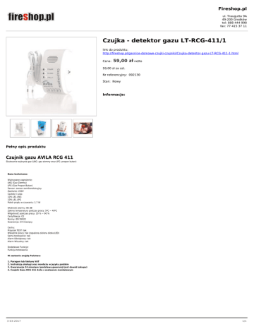 Fireshop.pl ul. Traugutta 9A 49-200 Grodków tel: 888 444 998 fax: 77 415 37 11 Czujka - detektor gazu LT-RCG-411/1 link do produktu: http://fireshop.pl/gasnice-domowe-czujki-czujniki/Czujka-detektor-gazu-LT-RCG-411-1.html Cena: 59,00 zł netto 59,00 zł za szt. Nr referencyjny: 092130 Stan: Nowy Informacje: Pełny opis produktu Czujnik gazu AVILA RCG 411 Skutecznie wykrywa gaz (LNG- gaz ziemny oraz LPG- propan butan) Dane techniczne: Wykrywane zagrożenie: LNG (Gaz Ziemny) LPG (Gaz Propan-Butan) Sensor: sensor semikondukcyjny Zasilanie: 230V Czułość i czas: 10% LEL LNG 10% LEL LPG Pobór prądu w czuwaniu: 1,7 W Głośność alarmu: 85 dB Zakres temperatury podczas pracy: 5ºC ~ 40ºC Wilgotność podczas pracy: 20 % ~ 90 % Certyfikacja: CE Normy: EN 55022 Gwarancja: 24 miesięcy Cechy: Przycisk TEST: tak Wskaźnik pracy: tak (zapalona zielona dioda LED) Samo-testowanie: tak Alarm Dźwiękowy: tak Alarm Wizualny: tak Dodatkowe Funkcje: Funkcja testowania W zestawie znajdą Państwo: 1. 2. 3. 4. Paragon lub fakturę VAT Instrukcję obsługi oraz montażu w języku polskim Gwaranacja 24 miesiące (podstawą gwarancji jest dowód zakupu) Czujnik Gazu RCG 411 Avila z zestawem montażowym 3-03-2017 1/1