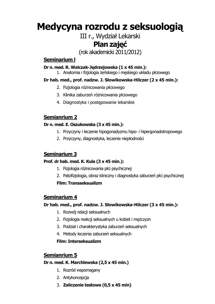 Medycyna rozrodu z seksuologią III r., Wydział Lekarski Plan zajęć (rok akademicki 2011/2012) Seminarium l Dr n. med. R. Walczak-Jędrzejowska (1 x 45 min.): 1. Anatomia i fizjologia żeńskiego i męskiego układu płciowego Dr hab. med., prof. nadzw. J. Słowikowska-Hilczer (2 x 45 min.): 2. Fizjologia różnicowania płciowego 3. Klinika zaburzeń różnicowania płciowego 4. Diagnostyka i postępowanie lekarskie Semianrium 2 Dr n. med. E. Oszukowska (3 x 45 min.): 1. Przyczyny i leczenie hipogonadyzmu hipo- i hipergonadotropowego 2. Przyczyny, diagnostyka, leczenie niepłodności Seminarium 3 Prof. dr hab. med. K. Kula (3 x 45 min.): 1. Fizjologia różnicowania płci psychicznej 2. Patofizjologia, obraz kliniczny i diagnostyka zaburzeń płci psychicznej Film: Transseksualizm Seminarium 4 Dr hab. med., prof. nadzw. J. Słowikowska-Hilczer (3 x 45 min.): 1. Rozwój relacji seksualnych 2. Fizjologia reakcji seksualnych u kobiet i mężczyzn 3. Podział i charakterystyka zaburzeń seksualnych 4. Metody leczenia zaburzeń seksualnych Film: Interseksualizm Semianrium 5 Dr n. med. K. Marchlewska (2,5 x 45 min.) 1. Rozród wspomagany 2. Antykoncepcja 3. Zaliczenie testowe (0,5 x 45 min)