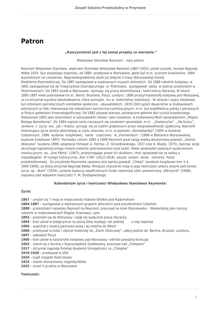 Zespół Szkolno-Przedszkolny w Przyrowie Patron „Rzeczywistość jest z tej samej przędzy co marzenia.” Władysław Stanisław Reymont – nasz patron Reymont Władysław Stanisław, właściwie Stanisław Władysław Rejment (1867-1925), polski prozaik, laureat Nagrody Nobla 1924. Syn wiejskiego organisty, od 1880 przebywał w Warszawie, gdzie był m.in. uczniem krawieckim, 1884 wyzwolonym na czeladnika. Najprawdopodobniej ukończył jedynie 3 klasy Warszawskiej Szkoły Niedzielno-Rzemieślniczej. Do 1887 występował w wędrownych trupach aktorskich. Od 1888 robotnik kolejowy, w 1891 zaangażował się do Towarzystwa Dramatycznego w Piotrkowie, występował także w teatrze amatorskim w Skierniewicach. Od 1893 osiadł w Warszawie, zajmując się pracą dziennikarską i twórczością literacką. W latach 1895-1897 wiele podróżował (m.in.: Berlin, Bruksela, Paryż, Londyn). 1890 przeżył katastrofę kolejową pod Warszawą, za co otrzymał wysokie odszkodowanie, które pomogło mu w materialnej stabilizacji. W okresie I wojny światowej był członkiem patriotycznych komitetów społeczno – obywatelskich. 1919-1920 gościł dwukrotnie w środowiskach polonijnych w USA. Interesował się nowościami techniczno-cywilizacyjnymi, m.in. był współtwórcą jednej z pierwszych w Polsce spółdzielni kinematograficznej. Od 1882 pisywał wiersze, poświęcone głównie doli ucznia krawieckiego. Debiutował 1892 jako dziennikarz w warszawskim Głosie i jako nowelista w krakowskiej Myśli opowiadaniem „Wigilia Bożego Narodzenia”. Do 1894 napisał serię cieszących się uznaniem opowiadań, m.in. „Zawierucha”, „Na bruku”, zarówno z życia wsi, jak i miasta, ujmując się za ludźmi gnębionymi przez niesprawiedliwość społeczną. Nakreślił interesująco życie świata aktorskiego w cyklu utworów, m.in. w powieści „Komediantka” (1895 w Kurierze Codziennym, 1896 wydanie książkowe), także częściowo w „Fermentach” (1896 w Bibliotece Warszawskiej, wydanie książkowe 1897). Pomiędzy rokiem 1895 a 1899 Reymont pisał swoją wielką dwutomową powieść „Ziemia obiecana” (wydana 1899, adaptacje filmowe: A. Hertza i Z. Gniazdowskiego, 1927 oraz A. Wajdy, 1975), tworząc wizję okrutnego kapitalistycznego miasta-molocha (pierwowzorem była Łódź). Wiele opowiadań poświęcił wydarzeniom rewolucyjnym, np. „Ave Patria” (1907), przestrzegając przed ich skutkami, choć opowiadał się za walką o niepodległość. W trylogii historycznej „Rok 1794″ (1913-1918) ukazał ostatni okres istnienia Polski przedrozbiorowej. Za arcydzieło Reymonta uważana jest epicka powieść „Chłopi” (wydanie książkowe tom 1-4, 1904-1909), za którą otrzymał Nagrodę Nobla. Mniejsze znaczenie mają w jego twórczości utwory pisane pod koniec życia, np. „Bunt” (1924), uznanie badaczy współczesnych budzi natomiast szkic powieściowy „Marzyciel” (1908), napisany pod wpływem twórczości F. M. Dostojewskiego. Kalendarium życia i twórczości Władysława Stanisława Reymonta: Życie: 1867 – urodził się 7 maja w miejscowości Kobiele Wielkie pod Radomskiem 1884-1887 – występował w wędrownych grupach aktorskich pod pseudonimem Urbański 1888 – przekształcił nazwisko Rejmont na Reymont, pracował na kolei Warszawsko – Wiedeńskiej jako starszy robotnik w miejscowościach Rogów, Krasnowa, Lipie 1893 – przeniósł się do Warszawy i zajął się wyłącznie pracą literacką 1894 – brał udział w pielgrzymce na Jasną Górę wydając rok później o niej reportaż 1895 – wyjechał z siostrą Jakimowiczową i jej rodziną do Włoch 1896 – przebywał w Łodzi i zbierał materiały do „Ziemi Obiecanej”, odbył podróż do Berlina, Brukseli, Londynu. 1897 – odwiedził Paryż 1900 – brał udział w katastrofie kolejowej pod Warszawą i odniósł poważną kontuzję 1902 – ożenił się z Aurelią z Szacsznajdrów Szabłowską, pracował nad „Chłopami” 1917 – otrzymał nagrodę Polskiej Akademii Umiejętności za „Chłopów” 1919-1920 – przebywał w USA 1920 – kupił majątek Kołaczkowo 1924 – został uhonorowany nagrodą Nobla 1925 – zmarł 5 grudnia w Warszawie Twórczość: 1 Zespół Szkolno-Przedszkolny w Przyrowie 1895 – „Pielgrzymka do Jasnej Góry” 1896 – „Komediantka” 1897 – „Fermenty” 1899 – „Sprawiedliwie”, „Lili”, „Ziemia obiecana” 1902 – „Z pamiętnika” 1902-1909 – „Chłopi” 1907 – „Na krawędzi” 1911 – „Wampir” 1913-1918 – „Rok 1794″ 1919 – „Za frontem” 1921-1924 – „Księżniczka”, „Powrót”, „Spowiedź”, „Bunt” Reymont napisał także wiele nowel, opowiadań, reportaży: „Tomek Baran”, „Śmierć”, „Suka”, „Spotkania”, „W jesienną noc”, „Z ziemi chełmskiej”, „Za frontem”,„Osądzona”, „Przysięga”, „Szczęśliwi”, „Franek”, „Na bruku”, „Pewnego dnia”, „Z konstytucyjnych dni”, „Jaśkowe ambicje”, „Na Niemca”, „Historia, która by mogła się stać”, „Wspomnienia lat dziecięcych”, „Legenda”. Jak to się stało, że tak wielki Polak został patronem naszej szkoły? ● ● Uczniowie klasy III- rocznik 1999 – 2002 wyszli z inicjatywą wyboru patrona dla gimnazjum. Do imienia szkoły pretendowali: Henryk Sienkiewicz, Władysław Stanisław Reymont, Wisława Szymborska, Juliusz Słowacki, Jan Kochanowski, Stanisław Wyspiański. W wyniku głosowania, w którym oprócz uczniów i nauczycieli wzięli udział również rodzice oraz przedstawiciele władz samorządowych, patronem został Władysław Stanisław Reymont, który urodził się niedaleko Przyrowa- w Kobielach Wielkich, pisał o wsi, a w swoim największym dziele „Chłopi” wspomina o zakonnicach z klasztoru w Przyrowie. Miał na myśli klasztor sióstr zakonnych w Aleksandrówce. Cóż mogło być bardziej przekonywującego! Okazało się, że twórczość wybitnego prozaika