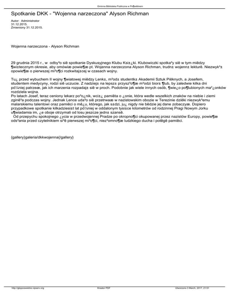 ¶wi±tecznym okresie, aby omówiæ powie¶æ pt. Wojenna narzeczona Alyson Richman, trudn± wojenn± lekturê. Niezwyk³±