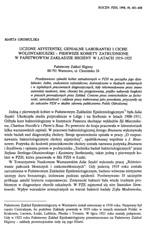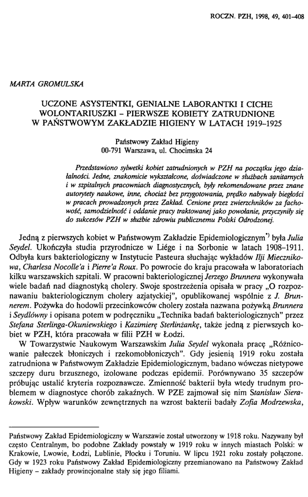 ROCZN. PZH, 1998, 49, 401-408 MARTA GROMULSKA U C Z O N E A SY STEN TK I, G E N IA L N E L A B O R A N TK I I C IC H E W O L O N T A R IU S Z K I - P IE R W S Z E K O B IE T Y Z A T R U D N IO N E W PA Ń ST W O W Y M Z A K Ł A D Z IE H IG IE N Y W L A T A C H 1919-1925 Państwowy Zakład Higieny 00-791 Warszawa, ul. Chocimska 24 Przedstawiono sylwetki kobiet zatrudnionych w PZH na początku jego dzia łalności Jedne, znakomicie wykształcone, doświadczone w służbach sanitarnych i w szpitalnych pracowniach diagnostycznych, były rekomendowane przez znane autorytety naukowe, inne, chociaż bez przygotowania, prędko nabywały biegbści w pracach prowadzonych przez Zakład. Cenione przez zwierzchników za facho wość, samodzielność i oddanie pracy traktowanej jako powołanie, przyczyniły się do sukcesów PZH w służbie zdrowiu publicznemu Polski Odrodzonej. Je d n ą z pierwszych kobiet w Państwowym Zakładzie Epidem iologicznym ^ była Julia Seydel. U kończyła studia przyrodnicze w Liege i na Sorbonie w latach 1908-1911. O dbyła kurs bakteriologiczny w Instytucie Pasteura słuchając wykładów Ilji M ieczniko wa, Charlesa N ocolle’a i Pierre’a Roux. Po powrocie do kraju pracow ała w laboratoriach kilku warszawskich szpitali. W pracow ni bakteriologicznej Jerzego Brunnera wykonywała wiele badań nad diagnostyką cholery. Swoje spostrzeżenia opisała w pracy „O rozpoz naw aniu bakteriologicznym cholery azjatyckiej”, opublikowanej wspólnie z J. Brunnerem. Pożywka do hodowli przecinkowców cholery została nazw ana pożywką Brunnera i Seydlówny i opisana potem w podręczniku „Technika badań bakteriologicznych” przez Stefana Sterlinga-Okuniewskiego i Kazimierę Sterlinżankę, także jed n ą z pierwszych ko biet w P Z H , któ ra pracow ała w filii P Z H w Łodzi. W Towarzystwie Naukowym W arszawskim Julia Seydel wykonała pracę „R óżnico w anie pałeczek błoniczych i rzekom obłoniczych”. Gdy jesienią 1919 roku została zatrudniona w Państwowym Zakładzie Epidemiologicznym, badano wówczas nietypowe szczepy duru brzusznego, izolowane podczas epidem ii. Porównywano 35 szczepów próbując ustalić kryteria rozpoznawcze. Zm ienność bakterii była wtedy trudnym p ro blem em w diagnostyce chorób zakaźnych. W P Z E zajmował się nim Stanisław Siera kowski. Wpływ w arunków zewnętrznych na wzrost bakterii badały Zofia Modrzewska, Państwowy Zakład Epidemiologiczny w Warszawie został utworzony w 1918 roku. Nazywany był często Centralnym, bo podobne Zakłady powstały w 1919 roku w innych miastach Polski: w Krakowie, Lwowie, Łodzi, Lublinie, Płocku i Toruniu. W lipcu 1921 roku zostały połączone. Gdy w 1923 roku Państwowy Zakład Epidemiologiczny przemianowano na Państwowy Zakład Higieny - zakłady prowincjonalne stały się jego filiami. 402 M. Gromulska Nr 4 Helena Rabinowiczówna i E. Salamonówna. N iektóre gatunki bakterii m ożna było selekcjonować za pom ocą stężenia i grubości warstwy pożywki. Julia Seydel uczestniczyła w tych badaniach i w krótce stała się znawczynią bakterii zakażeń jelitowych [1]. Kiedy pow stał Z akład B adania Surowic Szczepionek Julia Seydel została asystentką Ludwika Hirszfelda. Uczestniczyła m.in. w badaniach wykonywanych na zlecenie Ligi N arodów nad standaryzacją surowic przeciwczerwonkowych. Jako pierwsza w P Z H uzyskała stopień adiunkta w 1925 roku. Powracając do wcześniejszych zainteresow ań błonicą ogłosiła kilka prac na tem at biologii i zm ienności maczugowców błonicy w „M e dycynie Doświadczalnej i Społecznej” i w „W arszawskim Czasopiśm ie L ekarskim ”. Wciąż pojawiały się nowe epidem ie tej groźnej choroby, dlatego w powstałym w 1927 roku Dziale Bakteriologii i Medycyny D oświadczalnej P Z H wydzielono pracow nię błoniczą, którą prow adziła Julia Seydel. Prace Julii Seydel ukazywały się w czasopism ach zagranicznych: „C om ptes R endus des Seances de la Societe de B iologie”, „A nnales de 1’Institut P asteu r” i „Zeitschift fiir Hygiene und Infektionkrankheiten”. W czasie okupacji niem ieckiej Julia Seydel nadal pracow ała w P Z H . Ew akuow ana w czasie Pow stania W arszawskiego, wróciła do filii w Kielcach, a potem do Działu Bakteriologii i Medycyny Doświadczalnej w W arszawie. Znów kierow ała pracow nią błoniczą i opublikow ała rozdział „M aczugowce” w podręczniku „M ikrobiologia lekar ska” wydanym w 1947 roku pod red. Feliksa Przesmyckiego. D ostosow ała do polskich pracowni mikrobiologicznych nową, płytkową m etodę określania toksyczności szczepów błoniczych. Prow adziła też badania nad uzjadliwieniem ich przez dodanie faga. Julia Seydel opublikow ała około 40 prac naukowych. Po w prow adzeniu nowych przepisów m usiała nostryfikować dyplom i uzyskała tytuł m agistra filozofii w zakresie biologii. N ie mogła pogodzić się z pseudonaukow ym i teoriam i wprowadzanym i w bio logii. Pracow nię błoniczą prow adziła do 1953 roku. Potem została usunięta. Z m arła w 1954 r. W spom inana przez profesora Kazimierza Lachowicza jako „surowa, ale uczynna i życzliwa” [2]. Seydel była uczoną obeznaną z literaturą i życiem naukowym w Polsce i na świecie. Jej publikacje zadziwiają erudycją. W iedzę o najnowszych osiągnięciach w bakteriologii wykorzystywała do prow adzenia polemiki na łam ach czasopism. T łu maczyła artykuły zagraniczne, a ich streszczenia um ieszczała w „Przeglądzie E pidem io logicznym”, przekształconym później w „Medycynę Dośw iadczalną i Społeczną” pierwszych czasopism ach, wydawanych przez PZH . O dznaczała się zdolnościam i dy daktycznymi prow adząc kursy bakteriologiczne, organizow ane przez PZH . Rozpoczęłam rozważania od postaci Julii Seydel, jednej z najstarszych kobiet-bakteriologów w PZ H . R eprezentow ała charakterystyczny dla tam tych czasów typ kobietysawantki, zafascynowanej osiągnięciam i naukowymi