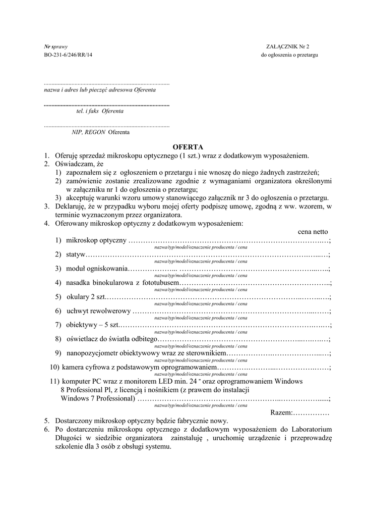 Nr sprawy BO-231-6/246/RR/14 ZAŁĄCZNIK Nr 2 do ogłoszenia o przetargu .................................................................................. nazwa i adres lub pieczęć adresowa Oferenta .................................................................................. tel. i faks Oferenta .................................................................................. NIP, REGON Oferenta 1. 2. 3. 4. OFERTA Oferuję sprzedaż mikroskopu optycznego (1 szt.) wraz z dodatkowym wyposażeniem. Oświadczam, że 1) zapoznałem się z ogłoszeniem o przetargu i nie wnoszę do niego żadnych zastrzeżeń; 2) zamówienie zostanie zrealizowane zgodnie z wymaganiami organizatora określonymi w załączniku nr 1 do ogłoszenia o przetargu; 3) akceptuję warunki wzoru umowy stanowiącego załącznik nr 3 do ogłoszenia o przetargu. Deklaruję, że w przypadku wyboru mojej oferty podpiszę umowę, zgodną z ww. wzorem, w terminie wyznaczonym przez organizatora. Oferowany mikroskop optyczny z dodatkowym wyposażeniem: cena netto 1) mikroskop optyczny …………………………………………………………………….…; nazwa/typ/model/oznaczenie producenta / cena 2) statyw……………………………………………………………………………….…...…; nazwa/typ/model/oznaczenie producenta / cena 3) moduł ogniskowania………………... ………………………………………………...…..; nazwa/typ/model/oznaczenie producenta / cena 4) nasadka binokularowa z fototubusem……………………………………………………..; nazwa/typ/model/oznaczenie producenta / cena 5) okulary 2 szt.……………………………………………………………………..……..….; nazwa/typ/model/oznaczenie producenta / cena 6) uchwyt rewolwerowy ………………………………………………………………...……; nazwa/typ/model/oznaczenie producenta / cena 7) obiektywy – 5 szt.…………………………………………………………………….….…; nazwa/typ/model/oznaczenie producenta / cena 8) oświetlacz do światła odbitego…………………………………………………...….….…; nazwa/typ/model/oznaczenie producenta / cena 9) nanopozycjometr obiektywowy wraz ze sterownikiem……………….………………...…; nazwa/typ/model/oznaczenie producenta / cena 10) kamera cyfrowa z podstawowym oprogramowaniem………….………...…………….……; nazwa/typ/model/oznaczenie producenta / cena 11) komputer PC wraz z monitorem LED min. 24 ” oraz oprogramowaniem Windows 8 Professional Pl, z licencją i nośnikiem (z prawem do instalacji Windows 7 Professional)”…………………………………………………..……………......; nazwa/typ/model/oznaczenie producenta / cena Razem:…………… 5. Dostarczony mikroskop optyczny będzie fabrycznie nowy. 6. Po dostarczeniu mikroskopu optycznego z dodatkowym wyposażeniem do Laboratorium Długości w siedzibie organizatora zainstaluję , uruchomię urządzenie i przeprowadzę szkolenie dla 3 osób z obsługi systemu. 7. Cena całkowita, obejmująca wszystkie koszty związane z dostawą, instalacją, uruchomieniem i szkoleniem oraz serwisem gwarancyjnym mikroskopu optycznego, w tym również koszty transportu, wynosi: cena netto - ............................. zł; podatek VAT - ............................. zł; cena brutto - ............................. zł; słownie: .......................................................................złotych i ….. /100. 9. Termin realizacji: 14 tygodni (w tym 12 tygodni na dostawę i instalację) od dnia podpisania umowy. 10. Miejsce wykonania umowy: Główny Urząd Miar, 00-139 Warszawa, ul. Elektoralna 2, Laboratorium Długości, Zakładu Długości i Kąta. 11. Parametry oferowanego mikroskopu optycznego z dodatkowym wyposażeniem: Minimalne parametry wymagane przez Zamawiającego Oferowane parametry* MIKROSKOP OPTYCZNY - mikroskop optyczny – pracujący w świetle odbitym, w jasnym i ciemnym polu; - statyw – umożliwiający badanie próbek o wysokości co najmniej 190 mm, bez stolika przedmiotowego; - moduł ogniskowania –montowany na statywie, z współosiowymi śrubami ogniskowania zgrubnego i dokładnego; - nasadka binokularowa z fototubusem – uchylna nasadka binokularowa z regulacją rozstawu okularów oraz nasadką do zamontowania kamery cyfrowej; - okulary 2 sztuki – szerokopolowe o powiększeniu 10x i polu widzenia min. 22 mm z regulacją ostrości +/- 5 dioptrii min. W jednym okularze; - uchwyt rewolwerowy – min. na 5 obiektywów do jasnego i ciemnego pola; - obiektywy 5 sztuk – optyka korygowania do nieskończoności, do światła odbitego, jasnego i ciemnego pola: pow. 10x/NA min. 0,25; pow. 20x/NA min.0,40; pow. 20x/WD min. 11 mm; pow. 50x/NA min. 0,75; pow. 100x/NA min. 0,80; - oświetlacz do światła odbitego – halogenowy do obserwacji jasnopolowych i ciemnopolowych z centrowanymi przesłonami polową i aperturową z regulacją intensywności oświetlenia, z min. 2 m kablem połączeniowym; - nanopozycjometr obiektywowy wraz ze sterownikiem – współpracujący z zastosowanymi obiektywami, o zakresie przesuwu co najmniej 0,1 mm i rozdzielczości nie większej niż 5 nm, sterowany komputerowo; - kamera cyfrowa – matryca CCD 2/3”, rozdzielczość min. 5 Mpikseli, zakres dynamiki 12 bit, szybkość transmisji obrazów min. 15fps, łącznik kamery z mikroskopem, podstawowe oprogramowanie do archiwizacji obrazu z licencją; - komputer PC wraz z monitorem LED min. 24” oraz oprogramowaniem Windows 8 Professional Pl, z licencją i nośnikiem (z prawem do instalacji Windows 7 Professional)”, zapewniający prawidłową współpracę oprogramowania z kamerą cyfrową i nanopozycjometrem obiektywowym oraz współpracy ze środowiskiem sieciowym i aplikacjami funkcjonującymi w polskiej administracji państwowej oraz umożliwiający optymalne w