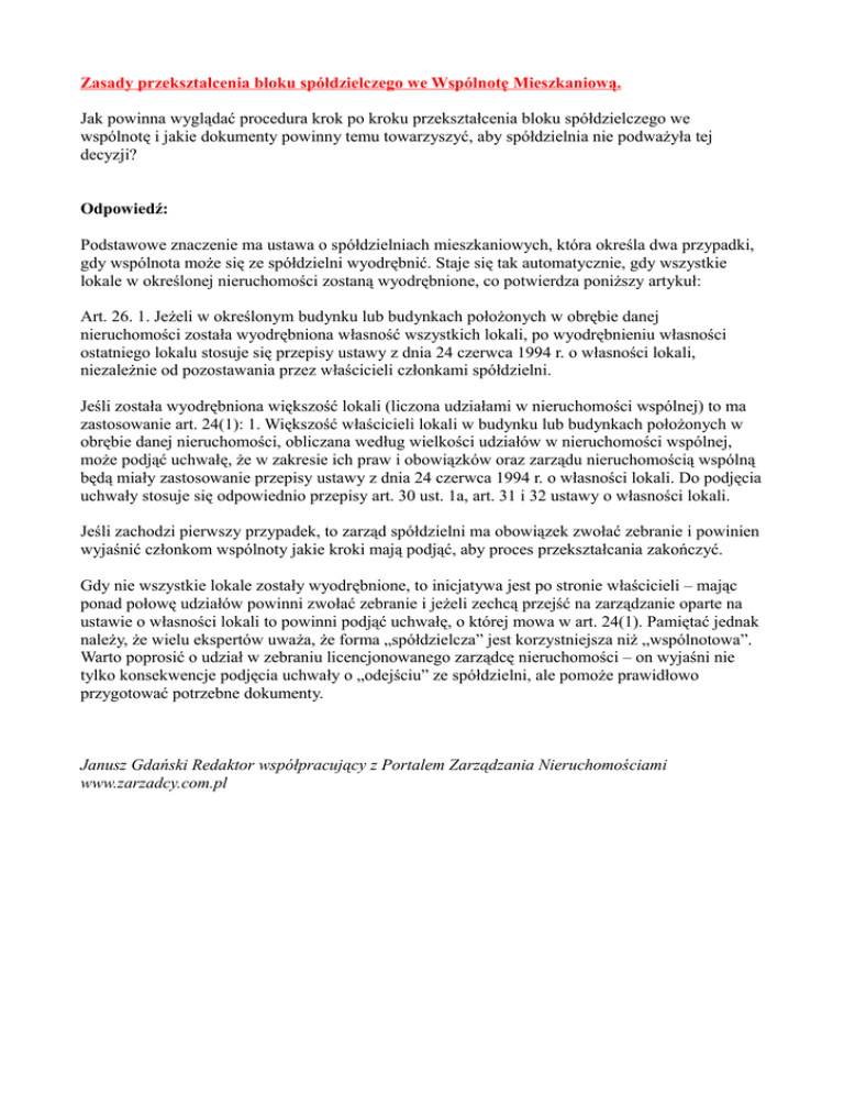 Zasady przekształcenia bloku spółdzielczego we Wspólnotę Mieszkaniową. Jak powinna wyglądać procedura krok po kroku przekształcenia bloku spółdzielczego we wspólnotę i jakie dokumenty powinny temu towarzyszyć, aby spółdzielnia nie podważyła tej decyzji? Odpowiedź: Podstawowe znaczenie ma ustawa o spółdzielniach mieszkaniowych, która określa dwa przypadki, gdy wspólnota może się ze spółdzielni wyodrębnić. Staje się tak automatycznie, gdy wszystkie lokale w określonej nieruchomości zostaną wyodrębnione, co potwierdza poniższy artykuł: Art. 26. 1. Jeżeli w określonym budynku lub budynkach położonych w obrębie danej nieruchomości została wyodrębniona własność wszystkich lokali, po wyodrębnieniu własności ostatniego lokalu stosuje się przepisy ustawy z dnia 24 czerwca 1994 r. o własności lokali, niezależnie od pozostawania przez właścicieli członkami spółdzielni. Jeśli została wyodrębniona większość lokali (liczona udziałami w nieruchomości wspólnej) to ma zastosowanie art. 24(1): 1. Większość właścicieli lokali w budynku lub budynkach położonych w obrębie danej nieruchomości, obliczana według wielkości udziałów w nieruchomości wspólnej, może podjąć uchwałę, że w zakresie ich praw i obowiązków oraz zarządu nieruchomością wspólną będą miały zastosowanie przepisy ustawy z dnia 24 czerwca 1994 r. o własności lokali. Do podjęcia uchwały stosuje się odpowiednio przepisy art. 30 ust. 1a, art. 31 i 32 ustawy o własności lokali. Jeśli zachodzi pierwszy przypadek, to zarząd spółdzielni ma obowiązek zwołać zebranie i powinien wyjaśnić członkom wspólnoty jakie kroki mają podjąć, aby proces przekształcania zakończyć. Gdy nie wszystkie lokale zostały wyodrębnione, to inicjatywa jest po stronie właścicieli – mając ponad połowę udziałów powinni zwołać zebranie i jeżeli zechcą przejść na zarządzanie oparte na ustawie o własności lokali to powinni podjąć uchwałę, o której mowa w art. 24(1). Pamiętać jednak należy, że wielu ekspertów uważa, że forma „spółdzielcza” jest korzystniejsza niż „wspólnotowa”. Warto poprosić o udział w zebraniu licencjonowanego zarządcę nieruchomości – on wyjaśni nie tylko konsekwencje podjęcia uchwały o „odejściu” ze spółdzielni, ale pomoże prawidłowo przygotować potrzebne dokumenty. Janusz Gdański Redaktor współpracujący z Portalem Zarządzania Nieruchomościami www.zarzadcy.com.pl