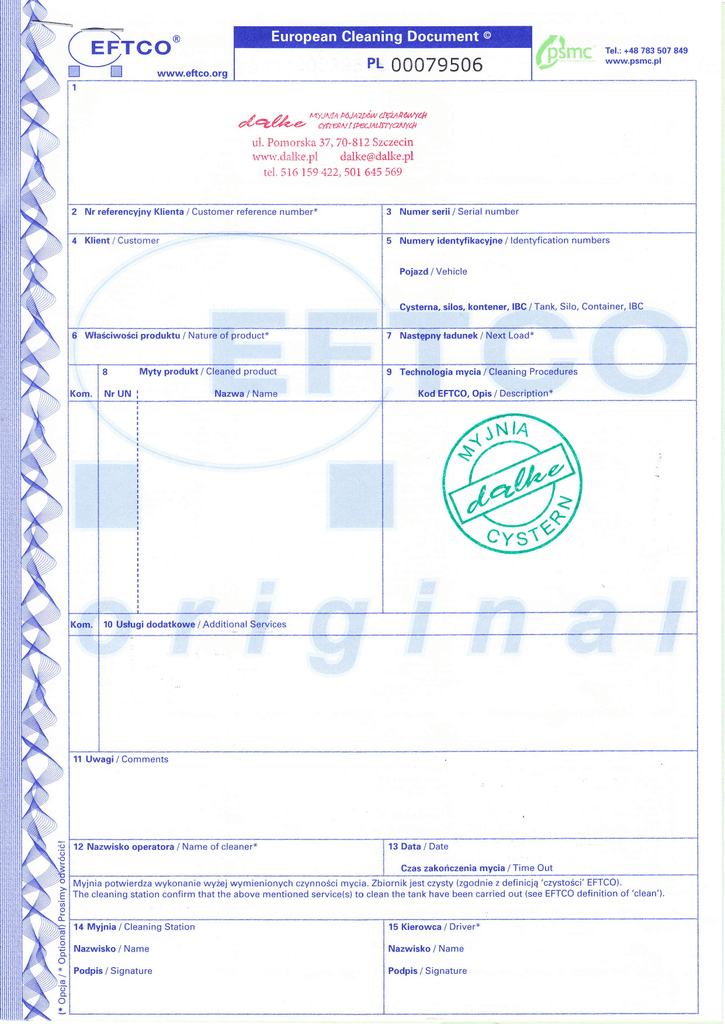 PL WWW.eftco,org .J _ ,, &Ę,&ł<-ę 00079506 MyJNrĄ bóJAząiLu dFŻłAałyrł łrżEpN l rpełJĄL|Wć2^ł/ćł ul. Poirrorska 37,70-812 Szczecin rwnv.dalke.pl [email protected] tei. 516 1,59 422,501 645 569 F rt. ret"i"*vl"v rll*tł ąlrt"rn"l. ,"t..r rrt i; Numer serii / serial number I i L-,-_.-_ i4 Klient/Customer Numery identyfikacyjne / ldentyf ication numbers ! l l l Pojazd / Vehicle ! Cysterna, silos, kontener, lBQ i 6 produktu / Nature of product* Właściwości / 7 Następny ładunek / Neit Load* 9 Technólogia mycia Tank, Silo, Container, lBC l l 8 Myty produkt / Cleaned product Nr UN i 10 Usfugi dodatkowe Nazwa / Name / Cleaning Pr9cedures Kod EFTCO, Opis / Description* /Additional Services 11 Uwagi / Comments ;a ,6 12 Nazwisko operatora / Name of cleanerx 13 Data / Date Czas zakończenia mycia / Time Out Myjnia potwierdza wykonanie wyżej wymienionych czynności mycia, Zbiornik jest czysty (zgodnie z definicją'czystości' EFTCO). E The cleaning station confirm thatthe above mentioned service(s) to clean the tank have been carried out (see EFTco definition of'clean'). ,6 b .b ^3 o o- ,C ,F o- o o O o- 14 Myjnia / Cleaning Station 15 Kierowca / Driver* Nazwisko / Name Nazwisko / Name Podpis / Signature Podpis / Signature