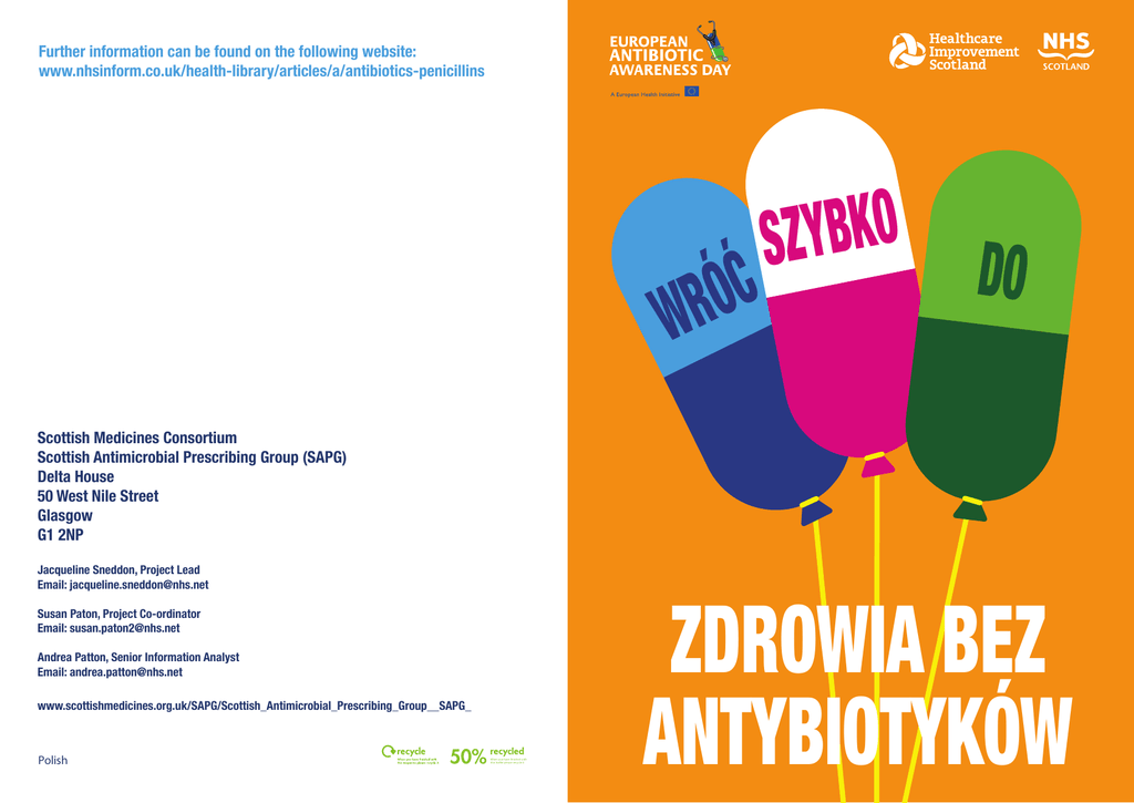 Further information can be found on the following website: www.nhsinform.co.uk/health-library/articles/a/antibiotics-penicillins O K B Y Z S D O Ć Ó R W Scottish Medicines Consortium Scottish Antimicrobial Prescribing Group (SAPG) Delta House 50 West Nile Street Glasgow G1 2NP Jacqueline Sneddon, Project Lead Email: [email protected] Susan Paton, Project Co-ordinator Email: [email protected] Andrea Patton, Senior Information Analyst Email: [email protected] www.scottishmedicines.org.uk/SAPG/Scottish_Antimicrobial_Prescribing_Group__SAPG_ Polish 50% When you have finished with this leaflet please recycle it ZDROWIA BEZ ANTYBIOTYKÓW Wróć do zdrowia bez antybiotyków Niniejsza ulotka wyjaśnia potrzebę sięgania po odpowiednie leki na powszednie choroby – takie jak przeziębienia i kaszel – unikając wtórnego uodpornienia na antybiotyki. Jak należy leczyć przeziębienie? Najlepsza metoda leczenia większości przeziębień, kaszlu czy bólu gardła to przyjmowanie dużej ilości płynów i odpoczynek. Przeziębienie może trwać około dwóch tygodni i może zakończyć się kaszlem z flegmą. Wiele leków na takie objawy – na przykład paracetamol – dostępnych jest bez recepty. Poproś aptekarza o poradę. Pójdź do lekarza, jeśli przeziębienie trwa dłużej niż trzy tygodnie, lub jeśli dostajesz zadyszki czy masz bóle w klatce piersiowej, albo cierpisz na chorobę dróg oddechowych. A co z moimi dziećmi, które często się przeziębiają? Dzieci bardzo często łapią przeziębienia i kaszel, szczególnie gdy zaczną szkołę i stykają się z innymi dziećmi. Poproś aptekarza o poradę. Jeśli objawy nie ustępują i niepokoisz się, zaprowadź dzieci do lekarza, ale nie oczekuj, że otrzymasz receptę na antybiotyk. Co to są antybiotyki? Antybiotyki to ważne lekarstwa wykorzystywane do leczenia infekcji bakteryjnych. Bakterie mogą się adaptować, aby przetrwać efekty antybiotyku. Stają się ‘odporne na antybiotyk’ – antybiotyk przestaje wtedy działać. Im częściej używamy antybiotyki, tym bardziej prawdopodobne, że bakteria się na nie uodporni. Niektóre bakterie powodujące infekcje w szpitalach, takie jak MRSA, uodpornione są na szereg antybiotyków. Dlaczego nie należy używać antybiotyków do leczenia przeziębień? Wszystkie przeziębienia oraz większość przypadków kaszlu i bólów gardła spowodowane są przez wirusy. Antybiotyki nie są skuteczne przeciw infekcjom takim jak przeziębienia, które są spowodowane przez wirusy. Infekcje wirusowe są dużo bardziej powszechne, niż infekcje bakteryjne. Dlaczego nie można używać innych antybiotyków? Można, ale mogą być one mniej skuteczne, mogą też mieć więcej skutków ubocznych. A bakterie także się w końcu na nie uodpornią. Nie mamy pewności, że zawsze będziemy w stanie odkryć nowe antybiotyki, aby zastąpić stare. W ostatnich latach odkryto mniej antybiotyków. Jak można uniknąć uodpornienia na antybiotyki? Możemy zwolnić powstawanie uodpornienia poprzez rzadsze używanie antybiotyków. Zatrzymanie tego procesu nie jest możliwe, ale jego spowolnienie ogranicza rozpowszechnienie się odporności na antybiotyki, a także daje więcej czasu na rozwinięcie nowych rodzajów antybiotyków. Co mogę zrobić w kwestii uodpornienia na antybiotyki? Możesz zażywać antybiotyki tylko wtedy, gdy jest to konieczne. Wiemy już, że większość przeziębień równie szybko przechodzi bez użycia antybiotyków. Kiedy są przepisane należy zażyć całą dawkę w celu całkowitego pozbycia się bakterii. W przypadku nie ukończenia całego przepisanego leczenia, mogą pozostać w organizmie bakterie, które uodpornią się na dany antybiotyk. Kiedy więc mogę otrzymać receptę na antybiotyk? Lekarz przepisze antybiotyki tylko wtedy, gdy ich potrzebujesz, na przykład na zapalenie nerek czy zapalenie płuc. Antybiotyki mogą uratować życie w przypadku takich infekcji jak zapalenie opon mózgowych. Jeśli nie będziemy ich używać niepotrzebnie, będą mogły skuteczniej działać wtedy, kiedy ich będziemy potrzebować. Można znaleźć więcej informacji na stronie internetowej: www.nhs.uk/antibiotics