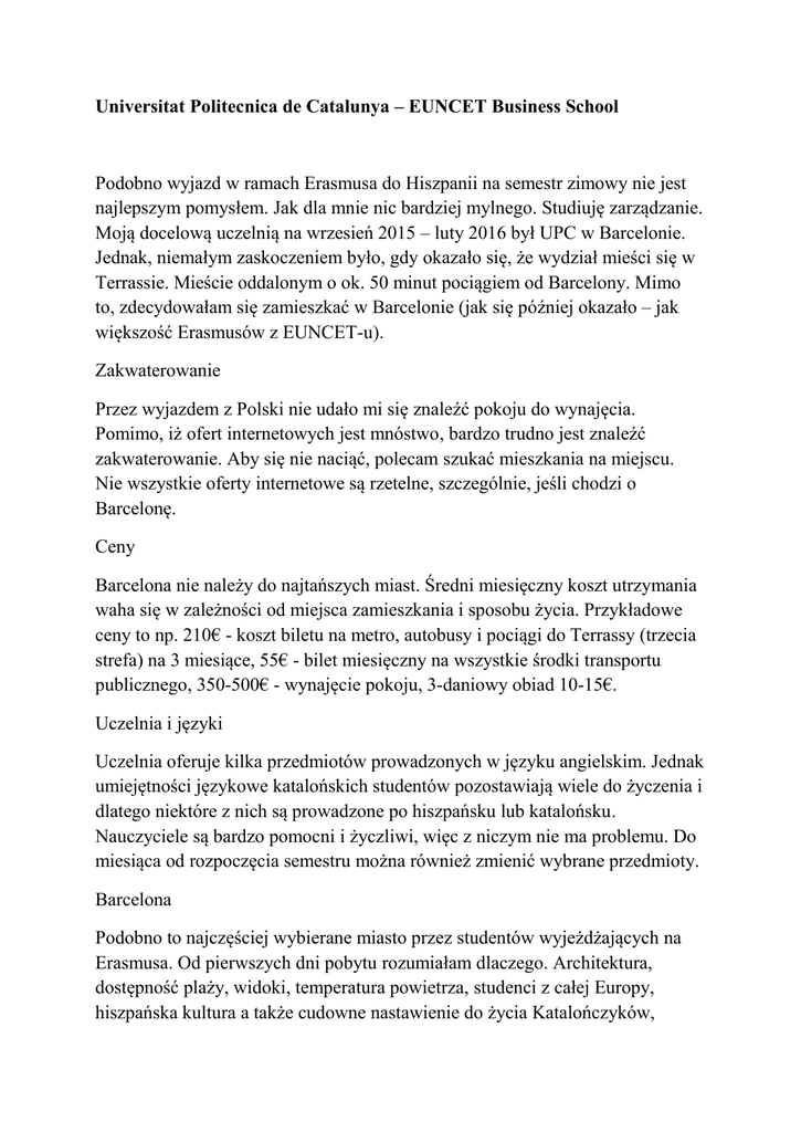 Universitat Politecnica de Catalunya – EUNCET Business School Podobno wyjazd w ramach Erasmusa do Hiszpanii na semestr zimowy nie jest najlepszym pomysłem. Jak dla mnie nic bardziej mylnego. Studiuję zarządzanie. Moją docelową uczelnią na wrzesień 2015 – luty 2016 był UPC w Barcelonie. Jednak, niemałym zaskoczeniem było, gdy okazało się, że wydział mieści się w Terrassie. Mieście oddalonym o ok. 50 minut pociągiem od Barcelony. Mimo to, zdecydowałam się zamieszkać w Barcelonie (jak się później okazało – jak większość Erasmusów z EUNCET-u). Zakwaterowanie Przez wyjazdem z Polski nie udało mi się znaleźć pokoju do wynajęcia. Pomimo, iż ofert internetowych jest mnóstwo, bardzo trudno jest znaleźć zakwaterowanie. Aby się nie naciąć, polecam szukać mieszkania na miejscu. Nie wszystkie oferty internetowe są rzetelne, szczególnie, jeśli chodzi o Barcelonę. Ceny Barcelona nie należy do najtańszych miast. Średni miesięczny koszt utrzymania waha się w zależności od miejsca zamieszkania i sposobu życia. Przykładowe ceny to np. 210€ - koszt biletu na metro, autobusy i pociągi do Terrassy (trzecia strefa) na 3 miesiące, 55€ - bilet miesięczny na wszystkie środki transportu publicznego, 350-500€ - wynajęcie pokoju, 3-daniowy obiad 10-15€. Uczelnia i języki Uczelnia oferuje kilka przedmiotów prowadzonych w języku angielskim. Jednak umiejętności językowe katalońskich studentów pozostawiają wiele do życzenia i dlatego niektóre z nich są prowadzone po hiszpańsku lub katalońsku. Nauczyciele są bardzo pomocni i życzliwi, więc z niczym nie ma problemu. Do miesiąca od rozpoczęcia semestru można również zmienić wybrane przedmioty. Barcelona Podobno to najczęściej wybierane miasto przez studentów wyjeżdżających na Erasmusa. Od pierwszych dni pobytu rozumiałam dlaczego. Architektura, dostępność plaży, widoki, temperatura powietrza, studenci z całej Europy, hiszpańska kultura a także cudowne nastawienie do życia Katalończyków, otwartość sprawiają, że bardzo szybko się klimatyzujemy i wcale nie mamy ochoty wracać. Dzięki świetnie rozwiniętej działalności ESN -u studenci nigdy się nie nudzą. Barcelona nigdy nie śpi (no może oprócz sjesty). Myśląc o Erasmusie, żałuję tylko jednego – że tak późno się na niego zdecydowałam. Anna Czapla