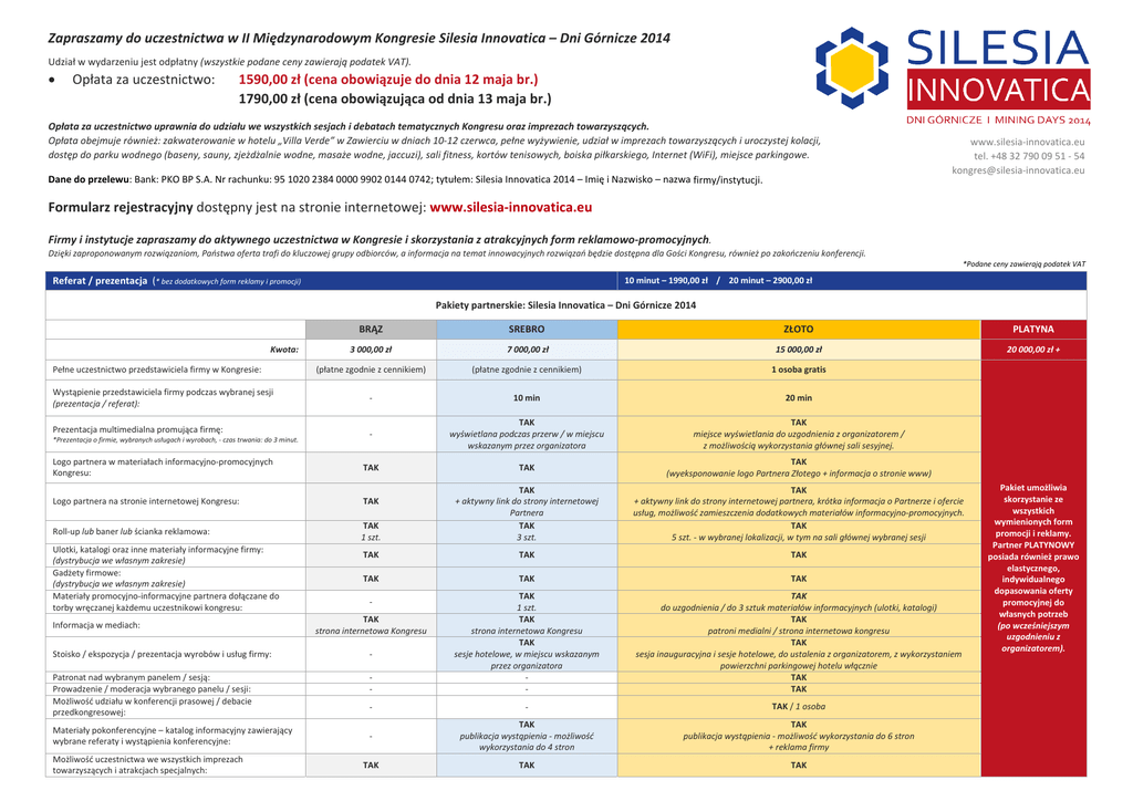 Zapraszamy do uczestnictwa w II Międzynarodowym Kongresie Silesia Innovatica – Dni Górnicze 2014 Udział w wydarzeniu jest odpłatny (wszystkie podane ceny zawierają podatek VAT). Opłata za uczestnictwo: 1590,00 zł (cena obowiązuje do dnia 12 maja br.) 1790,00 zł (cena obowiązująca od dnia 13 maja br.) Opłata za uczestnictwo uprawnia do udziału we wszystkich sesjach i debatach tematycznych Kongresu oraz imprezach towarzyszących. Opłata obejmuje również: zakwaterowanie w hotelu „Villa Verde” w Zawierciu w dniach 10‐12 czerwca, pełne wyżywienie, udział w imprezach towarzyszących i uroczystej kolacji, dostęp do parku wodnego (baseny, sauny, zjeżdżalnie wodne, masaże wodne, jaccuzi), sali fitness, kortów tenisowych, boiska piłkarskiego, Internet (WiFi), miejsce parkingowe. Dane do przelewu: Bank: PKO BP S.A. Nr rachunku: 95 1020 2384 0000 9902 0144 0742; tytułem: Silesia Innovatica 2014 – Imię i Nazwisko – nazwa firmy/instytucji. www.silesia‐innovatica.eu tel. +48 32 790 09 51 ‐ 54 kongres@silesia‐innovatica.eu Formularz rejestracyjny dostępny jest na stronie internetowej: www.silesia‐innovatica.eu Firmy i instytucje zapraszamy do aktywnego uczestnictwa w Kongresie i skorzystania z atrakcyjnych form reklamowo‐promocyjnych. Dzięki zaproponowanym rozwiązaniom, Państwa oferta trafi do kluczowej grupy odbiorców, a informacja na temat innowacyjnych rozwiązań będzie dostępna dla Gości Kongresu, również po zakończeniu konferencji. *Podane ceny zawierają podatek VAT Referat / prezentacja (* bez dodatkowych form reklamy i promocji) 10 minut – 1990,00 zł / 20 minut – 2900,00 zł Pakiety partnerskie: Silesia Innovatica – Dni Górnicze 2014 BRĄZ SREBRO ZŁOTO PLATYNA 3 000,00 zł 7 000,00 zł 15 000,00 zł 20 000,00 zł + (płatne zgodnie z cennikiem) (płatne zgodnie z cennikiem) 1 osoba gratis Wystąpienie przedstawiciela firmy podczas wybranej sesji (prezentacja / referat): ‐ 10 min 20 min Prezentacja multimedialna promująca firmę: ‐ TAK wyświetlana podczas przerw / w miejscu wskazanym przez organizatora TAK miejsce wyświetlania do uzgodnienia z organizatorem / z możliwością wykorzystania głównej sali sesyjnej. Logo partnera w materiałach informacyjno‐promocyjnych Kongresu: TAK TAK TAK (wyeksponowanie logo Partnera Złotego + informacja o stronie www) Logo partnera na stronie internetowej Kongresu: TAK Roll‐up lub baner lub ścianka reklamowa: TAK 1 szt. TAK + aktywny link do strony internetowej Partnera TAK 3 szt. TAK + aktywny link do strony internetowej partnera, krótka informacja o Partnerze i ofercie usług, możliwość zamieszczenia dodatkowych materiałów informacyjno‐promocyjnych. TAK 5 szt. ‐ w wybranej lokalizacji, w tym na sali głównej wybranej sesji TAK TAK TAK TAK TAK TAK TAK do uzgodnienia / do 3 sztuk materiałów informacyjnych (ulotki, katalogi) TAK patroni medialni / strona internetowa kongresu TAK sesja inauguracyjna i sesje hotelowe, do ustalenia z organizatorem, z wykorzystaniem powierzchni parkingowej hotelu włącznie TAK TAK Kwota: Pełne uczestnictwo przedstawiciela firmy w Kongresie: *Prezentacja o firmie, wybranych usługach i wyrobach, ‐ czas trwania: do 3 minut. Ulotki, katalogi oraz inne materiały informacyjne firmy: (dystrybucja we własnym zakresie) Gadżety firmowe: (dystrybucja we własnym zakresie) Materiały promocyjno‐informacyjne partnera dołączane do torby wręczanej każdemu uczestnikowi kongresu: Stoisko / ekspozycja / prezentacja wyrobów i usług firmy: ‐ Patronat nad wybranym panelem / sesją: Prowadzenie / moderacja wybranego panelu / sesji: Możliwość udziału w konferencji prasowej / debacie przedkongresowej: ‐ ‐ TAK 1 szt. TAK strona internetowa Kongresu TAK sesje hotelowe, w miejscu wskazanym przez organizatora ‐ ‐ ‐ ‐ TAK / 1 osoba ‐ TAK publikacja wystąpienia ‐ możliwość wykorzystania do 4 stron TAK publikacja wystąpienia ‐ możliwość wykorzystania do 6 stron + reklama firmy TAK TAK TAK Informacja w mediach: Materiały pokonferencyjne – katalog informacyjny zawierający wybrane referaty i wystąpienia konferencyjne: Możliwość uczestnictwa we wszystkich imprezach towarzyszących i atrakcjach specjalnych: ‐ TAK strona internetowa Kongresu Pakiet umożliwia skorzystanie ze wszystkich wymienionych form promocji i reklamy. Partner PLATYNOWY posiada również prawo elastycznego, indywidualnego dopasowania oferty promocyjnej do własnych potrzeb (po wcześniejszym uzgodnieniu z organizatorem).