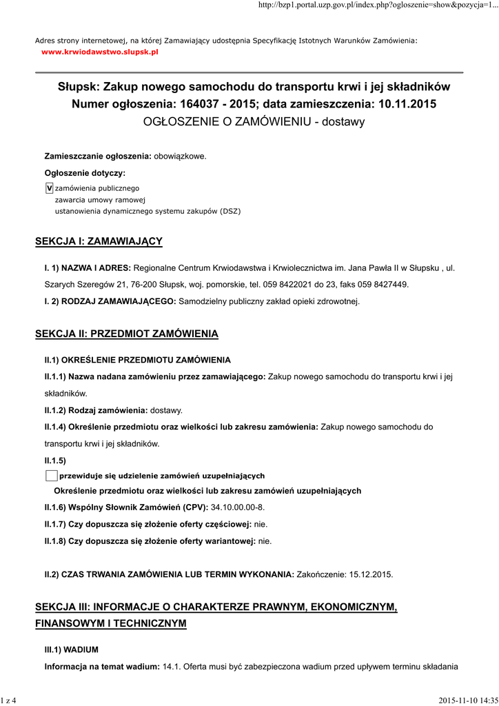 http://bzp1.portal.uzp.gov.pl/index.php?ogloszenie=show&pozycja=1... Adres strony internetowej, na której Zamawiający udostępnia Specyfikację Istotnych Warunków Zamówienia: www.krwiodawstwo.slupsk.pl Słupsk: Zakup nowego samochodu do transportu krwi i jej składników Numer ogłoszenia: 164037 - 2015; data zamieszczenia: 10.11.2015 OGŁOSZENIE O ZAMÓWIENIU - dostawy Zamieszczanie ogłoszenia: obowiązkowe. Ogłoszenie dotyczy: V zamówienia publicznego zawarcia umowy ramowej ustanowienia dynamicznego systemu zakupów (DSZ) SEKCJA I: ZAMAWIAJĄCY I. 1) NAZWA I ADRES: Regionalne Centrum Krwiodawstwa i Krwiolecznictwa im. Jana Pawła II w Słupsku , ul. Szarych Szeregów 21, 76-200 Słupsk, woj. pomorskie, tel. 059 8422021 do 23, faks 059 8427449. I. 2) RODZAJ ZAMAWIAJĄCEGO: Samodzielny publiczny zakład opieki zdrowotnej. SEKCJA II: PRZEDMIOT ZAMÓWIENIA II.1) OKREŚLENIE PRZEDMIOTU ZAMÓWIENIA II.1.1) Nazwa nadana zamówieniu przez zamawiającego: Zakup nowego samochodu do transportu krwi i jej składników. II.1.2) Rodzaj zamówienia: dostawy. II.1.4) Określenie przedmiotu oraz wielkości lub zakresu zamówienia: Zakup nowego samochodu do transportu krwi i jej składników. II.1.5) przewiduje się udzielenie zamówień uzupełniających Określenie przedmiotu oraz wielkości lub zakresu zamówień uzupełniających II.1.6) Wspólny Słownik Zamówień (CPV): 34.10.00.00-8. II.1.7) Czy dopuszcza się złożenie oferty częściowej: nie. II.1.8) Czy dopuszcza się złożenie oferty wariantowej: nie. II.2) CZAS TRWANIA ZAMÓWIENIA LUB TERMIN WYKONANIA: Zakończenie: 15.12.2015. SEKCJA III: INFORMACJE O CHARAKTERZE PRAWNYM, EKONOMICZNYM, FINANSOWYM I TECHNICZNYM III.1) WADIUM Informacja na temat wadium: 14.1. Oferta musi być zabezpieczona wadium przed upływem terminu składania 1z4 2015-11-10 14:35 http://bzp1.portal.uzp.gov.pl/index.php?ogloszenie=show&pozycja=1... ofert w wysokości: 1.743,00 zł, słownie: tysiąc siedemset czterdzieści trzy złote, III.2) ZALICZKI III.3) WARUNKI UDZIAŁU W POSTĘPOWANIU ORAZ OPIS SPOSOBU DOKONYWANIA OCENY SPEŁNIANIA TYCH WARUNKÓW III. 3.1) Uprawnienia do wykonywania określonej działalności lub czynności, jeżeli przepisy prawa nakładają obowiązek ich posiadania Opis sposobu dokonywania oceny spełniania tego warunku Zamawiający nie wyznacza szczegółowego warunku w tym zakresie III.3.2) Wiedza i doświadczenie Opis sposobu dokonywania oceny spełniania tego warunku Zamawiający nie wyznacza szczegółowego warunku w tym zakresie III.3.3) Potencjał techniczny Opis sposobu dokonywania oceny spełniania tego warunku Zamawiający nie wyznacza szczegółowego warunku w tym zakresie III.3.4) Osoby zdolne do wykonania zamówienia Opis sposobu dokonywania oceny spełniania tego warunku Zamawiający nie wyznacza szczegółowego warunku w tym zakresie III.3.5) Sytuacja ekonomiczna i finansowa Opis sposobu dokonywania oceny spełniania tego warunku Zamawiający nie wyznacza szczegółowego warunku w tym zakresie III.4) INFORMACJA O OŚWIADCZENIACH LUB DOKUMENTACH, JAKIE MAJĄ DOSTARCZYĆ WYKONAWCY W CELU POTWIERDZENIA SPEŁNIANIA WARUNKÓW UDZIAŁU W POSTĘPOWANIU ORAZ NIEPODLEGANIA WYKLUCZENIU NA PODSTAWIE ART. 24 UST. 1 USTAWY III.4.1) W zakresie wykazania spełniania przez wykonawcę warunków, o których mowa w art. 22 ust. 1 ustawy, oprócz oświadczenia o spełnianiu warunków udziału w postępowaniu należy przedłożyć: III.4.2) W zakresie potwierdzenia niepodlegania wykluczeniu na podstawie art. 24 ust. 1 ustawy, należy przedłożyć: oświadczenie o braku podstaw do wykluczenia; aktualny odpis z właściwego rejestru lub z centralnej ewidencji i informacji o działalności gospodarczej, jeżeli odrębne przepisy wymagają wpisu do rejestru lub ewidencji, w celu wykazania braku podstaw do wykluczenia w oparciu o art. 24 ust. 1 pkt 2 ustawy, wystawiony nie wcześniej niż 6 miesięcy przed upływem terminu składania wniosków o dopuszczenie do udziału w postępowaniu o udzielenie zamówienia albo składania ofert; III.4.3) Dokumenty podmiotów zagranicznych Jeżeli wykonawca ma siedzibę lub miejsce zamieszkania poza terytorium Rzeczypospolitej Polskiej, przedkłada: III.4.3.1) dokument wystawiony w kraju, w którym ma siedzibę lub miejsce zamieszkania potwierdzający, 2z4 2015-11-10 14:35 http://bzp1.portal.uzp.gov.pl/index.php?ogloszenie=show&pozycja=1... że: nie otwarto jego likwidacji ani nie ogłoszono upadłości - wystawiony nie wcześniej niż 6 miesięcy przed upływem terminu składania wniosków o dopuszczenie do udziału w postępowaniu o udzielenie zamówienia albo składania ofert; III.4.4) Dokumenty dotyczące przynależności do tej samej grupy kapitałowej lista podmiotów należących do tej samej grupy kapitałowej w rozumieniu ustawy z dnia 16 lutego 2007 r. o ochronie konkurencji i konsumentów albo informacji o tym, że nie należy do grupy kapitałowej; III.6) INNE DOKUMENTY Inne dokumenty niewymienione w pkt III.4) albo w pkt III.5) 7.5. W celu potwierdzenia, że oferowane usługi odpowiadają wymaganiom określonym przez zamawiającego należy złożyć: 7.5.1. Kopię wyciągu ze świadectwa homologacji dla pojazdu bazowego. 7.5.2. Certyfikat/oświadczenie producenta/polskiego przedstawiciela aktywnych urządzeń, iż oferowanie w niniejszym postępowaniu aktywne pojemniki do transportu krwi i jej składników pracują we wskazanym przez Zamawiającego zakresie temperaturowym oraz posiadają stosowny certyfikat CE. 7.5.3. Prospekt, folder lub kartę katalogową dla oferowanych aktywnych pojemników do transportu krwi i jej składników. 7.5.4. Dokumentację techniczną zawierającą m.in. schematy instalacji elektrycznych, instrukcję obsługi pojazdu i zamontowanych urządzeń oraz dokumenty gwarancji 7.5.5. Firmowy materiał informacyjny, potwierdzający posiadanie przez przedmiot zamówienia danego parametru z formularza oferty lub stosowne oświadczenie. 7.6. Dokumenty, o których mowa w powyżej 