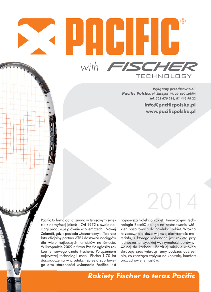 Wyłączny przedstawiciel: Pacific Polska, ul. Skrajna 14, 20-802 Lublin tel. 502 670 218, 81 446 98 22 info@pacificpolska.pl www.pacificpolska.pl 2014 Pacific to firma od lat znana wtenisowym świecie znajw znajwyższej jakości. Od 1972r. swoje naciągi produkuje prod głównie wNiemczech iNowej Zelandii, g gdzie posiada własne fabryki. To przez lata oficja cjalny partner ATP idostawca naciągów dla wielu najlepszych tenisistów na świecie. Wlistopad Wlistopadzie 2009 r. firma Pacific ogłosiła zatenisowego działu Fischera. Połączeniem kup teniso najwyższe najwyższej technologii marki Fischer i 70 lat doświadcz doświadczenia w produkcji sprzętu sportowego oraz sstaranności wykonania Pacifica jest najnowsza kolekcja rakiet. Innowacyjna technologia BasaltX polega na zastosowaniu włókien bazaltowych do produkcji rakiet. Włókna te zapewniają dużo większą elastyczność materiału, z którego wykonana jest rakieta przy jednoczesnej wysokiej wytrzymałości porównywalnej do karbonu. Bardziej miękkie włókna skracają czas wibracji ramy podczas uderzenia, co znacząco wpływa na kontrolę, komfort oraz zdrowie tenisistów. Rakiety Fischer to teraz Pacific RAKIETYZAWODNICZE TM Technologia BasaltX® to najwyższe osiągniecie europejskich naukowców, stworzone do zastosowań wnajnowocześniejszym procesie produkcji rakiet na zlecenie firmy PACIFIC. Zastosowane wstrategicznie najważniejszych miejscach rakiety włókna bazaltowe wpływają na poprawę czucia, stabilności, komfortu imocy, czyli czterech kluczowych właściwości każdej rakiety. X Force Co warte odnotowania, Pacific nie pozwolił sobie na stosowanie włókien bazaltowych pochodzących z Chin. Materiał powstaje w firmie technologicznej ASA.Tec w Austrii, co przesądza o wyjątkowej jakości rakiet Pacific Fischer Technology. Ostateczne włókna BasaltX® użyte do produkcji rakiet Pacific to wynik wyjątkowego procesu technologicznego firmy. Podstawowym problemem innych włókien bazaltowych używanych w przemyśle jest ich niejednolita jakość, przez co materiał ten różni się swoimi właściwościami, a w efekcie powoduje powstanie niejednolitych jakościowo produktów. Instytut technologiczny ASA.Tec opracował natomiast proces otrzymania włókien w najwyższej możliwej jakości, zgodnej z wymogami konstrukcyjnymi samolotów i pojazdów kosmicznych, gdzie jakość i jednolitość materiałów musi być najwyższa. GŁÓWKA: 98 SQ.IN. 685 MM DŁUGOŚĆ: WAGA: 295 G BALANS: 325 MM RAMA: 25/23/20 16/20 WZÓR NACIĄGU: 63 SZTYWNOŚĆ: 759 zł Najpopularniejszy, zawodniczy model odel wkolekcji BX2. Rakieta stworzona dla zaawansowanych awansowanych graczy odobrej technice. Zaprojektowana jektowana tak, by umożliwić wykonywanie szybkich kich imocnych obrej kontroli. uderzeń przy zachowaniu dobrej Dzięki systemowi PSS zapewnia stabilność na ca popularnej zawodniczym poziomie. Następca ne. rakiety Fischer M Pro Number One. BEAM zróżnicowana szerokość ramy. Wnewralgicznych miejscach, istotnych dla kontroli i stabilności, rama jest szersza, natomiast winnych, ważnych pod kątem elastyczności iczucia, jest węższa. Dlatego właśnie zcałą odpowiedzialnością można powiedzieć, że rakiety Pacific to produkt nawet dla najbardziej wymagających klientów. Doświadczenie marki Fischer jako lidera wprodukcji sprzętu sportowego wpołączeniu znajnowszymi technologiami gwarantuje najwyższe zaawansowanie sprzętu znanego teraz pod marką Pacific. Kolekcja rakiet zawiera zarówno modele będące kontynuacją modeli Fischer, jak icałkiem nowe propozycje. Z ero tm tolerance X Force Comp X Force Lite GŁÓWKA: 105 SQ.IN. 685 MM DŁUGOŚĆ: WAGA: 292 G BALANS: 330 MM RAMA: 25/23/20 16/19 WZÓR NACIĄGU: 62 SZTYWNOŚĆ: GŁÓWKA: 98 SQ.IN. 685 MM DŁUGOŚĆ: WAGA: 260 G BALANS: 345 MM RAMA: 25/23/20 16/20 WZÓR NACIĄGU: 61 SZTYWNOŚĆ: 599 zł 559 zł Rakieta przeznaczona dla szerokiej grupy tenisistów. Idealna zarówno dla zaawansowanych, jak idla dobrze grających graczy klubowych o poprawnej technice. Konstrukcja taka sama jak wwersji zawodniczej X Force oraz zachowana cienka rama zapewniają agresywny charakter rakiety i duże czucie. Lekko zmniejszona waga i powiększona główka zwiększają natomiast komfort iprzyjemność gry. Najlżejsza zawodnicza rakieta w kolekcji Pacific. Zapewnia niezwykłą manewrowość, pozwalając na poprawne technicznie wykonywanie uderzeń. Przy tym zachowuje dużą moc iprecyzję uderzeń dzięki bardzo cienkiej ramie oraz niedużej powierzchni główki. Rakieta idealna dla młodych zawodników, juniorów iwszystkich szukających lekkiej rakiety ocharakterze zawodniczym. Vacuum Technology® – próżniowy proces produkcji ram rakiet gwarantujący 100% identyczność rakiet zarówno pod kątem parametrów , jak i odczuwalnych właściwości. Teraz możesz mieć wtermobagu dwie identyczne rakiety, spełniające najwyższe standardy. Zaprojektowany dla Pacifica i opatentowany system Speed++Zone zapewniający nadawanie piłce maksymalnej szybkości podczas uderzenia przy największej kontroli. Teraz nie musisz już przejmować się niecentrycznymi uderzeniami. Rakiety Pacific „wybaczą” Ci wszystko. BasaltX2® to już kolejna, druga, jeszcze bardziej udoskonalona odsłona naszej technologii. 30% więcej włókien bazaltowych wtej samej ilości materiału 28% większa wytrzymałość 20% mniejsza waga włókien 20% X Feel Tour X Feel Pro.95 GŁÓWKA: 100 SQ.IN. 685 MM DŁUGOŚĆ: WAGA: 295 G BALANS: 325 MM 22 RAMA: 16/19 WZÓR NACIĄGU: 59 SZTYWNOŚĆ: GŁÓWKA: DŁUGOŚĆ: WAGA: BALANS: RAMA: WZÓR NACIĄGU: SZTYWNOŚĆ: 759 zł 699 zł Rakieta zawodnicza dla agresywnych tenisistów, stworzona tak, by dostarczyć unikalnego czucia przy grze na profesjonalnym poziomie, charakterystycznego dla rakiet produkowanych w technologii „Constant Beam”. Jednocześnie zapewnia bardzo dużą kontrolę. Ilość strun oraz wielkość główki dodają mocy iłatwości na