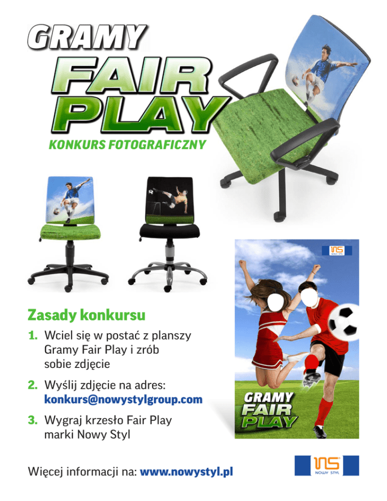 GRAMY KONKURS FOTOGRAFICZNY Zasady konkursu 1. Wciel się w postać z planszy Gramy Fair Play i zrób sobie zdjęcie 2. Wyślij zdjęcie na adres: [email protected] 3. Wygraj krzesło Fair Play marki Nowy Styl Więcej informacji na: www.nowystyl.pl GRAMY