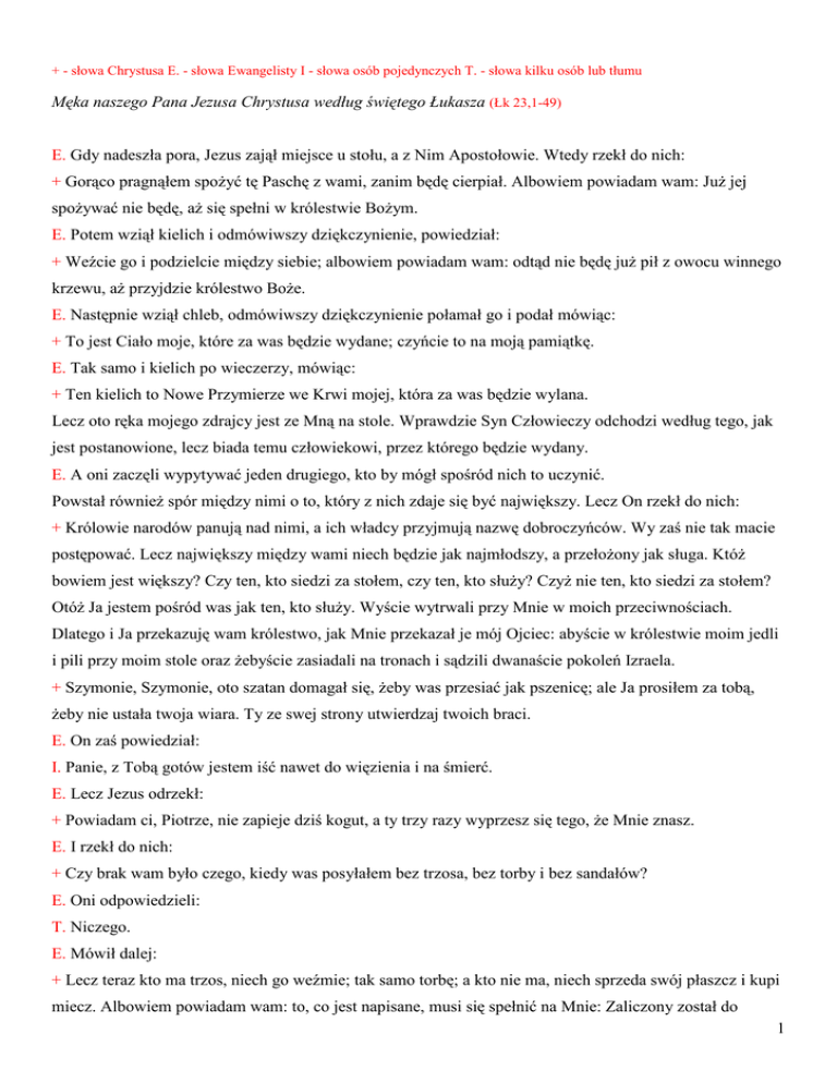 + - słowa Chrystusa E. - słowa Ewangelisty I - słowa osób pojedynczych T. - słowa kilku osób lub tłumu Męka naszego Pana Jezusa Chrystusa według świętego Łukasza (Łk 23,1-49) E. Gdy nadeszła pora, Jezus zajął miejsce u stołu, a z Nim Apostołowie. Wtedy rzekł do nich: + Gorąco pragnąłem spoŜyć tę Paschę z wami, zanim będę cierpiał. Albowiem powiadam wam: JuŜ jej spoŜywać nie będę, aŜ się spełni w królestwie BoŜym. E. Potem wziął kielich i odmówiwszy dziękczynienie, powiedział: + Weźcie go i podzielcie między siebie; albowiem powiadam wam: odtąd nie będę juŜ pił z owocu winnego krzewu, aŜ przyjdzie królestwo BoŜe. E. Następnie wziął chleb, odmówiwszy dziękczynienie połamał go i podał mówiąc: + To jest Ciało moje, które za was będzie wydane; czyńcie to na moją pamiątkę. E. Tak samo i kielich po wieczerzy, mówiąc: + Ten kielich to Nowe Przymierze we Krwi mojej, która za was będzie wylana. Lecz oto ręka mojego zdrajcy jest ze Mną na stole. Wprawdzie Syn Człowieczy odchodzi według tego, jak jest postanowione, lecz biada temu człowiekowi, przez którego będzie wydany. E. A oni zaczęli wypytywać jeden drugiego, kto by mógł spośród nich to uczynić. Powstał równieŜ spór między nimi o to, który z nich zdaje się być największy. Lecz On rzekł do nich: + Królowie narodów panują nad nimi, a ich władcy przyjmują nazwę dobroczyńców. Wy zaś nie tak macie postępować. Lecz największy między wami niech będzie jak najmłodszy, a przełoŜony jak sługa. KtóŜ bowiem jest większy? Czy ten, kto siedzi za stołem, czy ten, kto słuŜy? CzyŜ nie ten, kto siedzi za stołem? OtóŜ Ja jestem pośród was jak ten, kto słuŜy. Wyście wytrwali przy Mnie w moich przeciwnościach. Dlatego i Ja przekazuję wam królestwo, jak Mnie przekazał je mój Ojciec: abyście w królestwie moim jedli i pili przy moim stole oraz Ŝebyście zasiadali na tronach i sądzili dwanaście pokoleń Izraela. + Szymonie, Szymonie, oto szatan domagał się, Ŝeby was przesiać jak pszenicę; ale Ja prosiłem za tobą, Ŝeby nie ustała twoja wiara. Ty ze swej strony utwierdzaj twoich braci. E. On zaś powiedział: I. Panie, z Tobą gotów jestem iść nawet do więzienia i na śmierć. E. Lecz Jezus odrzekł: + Powiadam ci, Piotrze, nie zapieje dziś kogut, a ty trzy razy wyprzesz się tego, Ŝe Mnie znasz. E. I rzekł do nich: + Czy brak wam było czego, kiedy was posyłałem bez trzosa, bez torby i bez sandałów? E. Oni odpowiedzieli: T. Niczego. E. Mówił dalej: + Lecz teraz kto ma trzos, niech go weźmie; tak samo torbę; a kto nie ma, niech sprzeda swój płaszcz i kupi miecz. Albowiem powiadam wam: to, co jest napisane, musi się spełnić na Mnie: Zaliczony został do 1 złoczyńców. To bowiem, co się do Mnie odnosi, dochodzi kresu. E. Oni rzekli: T. Panie, tu są dwa miecze. E. Odpowiedział im: + Wystarczy. E. Potem wyszedł i udał się, według zwyczaju, na Górę Oliwną; towarzyszyli Mu takŜe uczniowie. Gdy przyszedł na miejsce, rzekł do nich: + Módlcie się, abyście nie ulegli pokusie. E. A sam oddalił się od nich na odległość jakby rzutu kamieniem, upadł na kolana i modlił się tymi słowami: + Ojcze, jeśli chcesz, zabierz ode Mnie ten kielich. Jednak nie moja wola, lecz Twoja niech się stanie. E. Wtedy ukazał Mu się anioł z nieba i umacniał Go. PogrąŜony w udręce jeszcze usilniej się modlił, a Jego pot był jak gęste krople krwi, sączące się na ziemię. Gdy wstał od modlitwy i przyszedł do uczniów, zastał ich śpiących ze smutku. Rzekł do nich: + Czemu śpicie? Wstańcie i módlcie się, abyście nie ulegli pokusie. E. Gdy On jeszcze mówił, oto zjawił się tłum. A jeden z Dwunastu, imieniem Judasz, szedł na ich czele i zbliŜył się do Jezusa, aby Go pocałować. Jezus rzekł do niego: + Judaszu, pocałunkiem wydajesz Syna Człowieczego? E. Towarzysze Jezusa widząc, na co się zanosi, zapytali: I. Panie, czy mamy uderzyć mieczem? E. I któryś z nich uderzył sługę najwyŜszego kapłana, i odciął mu prawe ucho. Lecz Jezus powiedział: + Przestańcie, dosyć. E. I dotknąwszy ucha, uzdrowił go. Do arcykapłanów zaś, dowódców straŜy świątynnej i starszych, którzy wyszli przeciw Niemu, Jezus rzekł: + Wyszliście z mieczami i kijami jak na zbójcę? Gdy codziennie bywałem u was w świątyni, nie podnieśliście rąk na Mnie; lecz to jest wasza godzina i panowanie ciemności. E. Schwycili Go więc, uprowadzili i zawiedli do domu najwyŜszego kapłana. A Piotr szedł z daleka. Gdy rozniecili ogień na środku dziedzińca i zasiedli wkoło, Piotr usiadł takŜe między nimi. A jakaś słuŜąca, zobaczywszy go siedzącego przy ogniu, przyjrzała mu się uwaŜnie i rzekła: I. I ten był razem z Nim. E. Lecz on zaprzeczył temu, mówiąc: I. Kobieto, nie znam Go. E. Po chwili zobaczył go ktoś inny i rzekł: I. I ty jesteś jednym z nich. E. Piotr odrzekł: I. Człowieku, nie jestem. 2 E. Po upływie prawie godziny jeszcze ktoś inny począł zawzięcie twierdzić: I. Na pewno i ten był razem z Nim; jest przecieŜ Galilejczykiem. E. Piotr zaś rzekł: I. Człowieku, nie wiem, co mówisz. E. I w tej chwili, gdy on jeszcze mówił, kogut zapiał. A Pan obrócił się i spojrzał na Piotra. Wspomniał Piotr na słowo Pana, jak mu powiedział: Dziś, zanim kogut zapieje, trzy razy się Mnie wyprzesz. Wyszedł na zewnątrz i gorzko zapłakał. E. Tymczasem ludzie, którzy pilnowali Jezusa, naigrawali się z Niego i bili Go. Zasłaniali Mu oczy i pytali: T. Powiedz, kto Cię uderzył. E. Wiele teŜ innych obelg miotali przeciw Niemu. Skoro dzień nastał, zebrała się starszyzna ludu, arcykapłani i uczeni w Piśmie i kazali przyprowadzić Go przed swoją Radę. Rzekli: T. Jeśli Ty jesteś Mesjaszem, powiedz nam. E. On im odrzekł: + Jeśli wam powiem, nie uwierzycie Mi, i jeśli was zapytam, nie dacie Mi odpowiedzi. Lecz odtąd Syn Człowieczy siedzieć będzie 