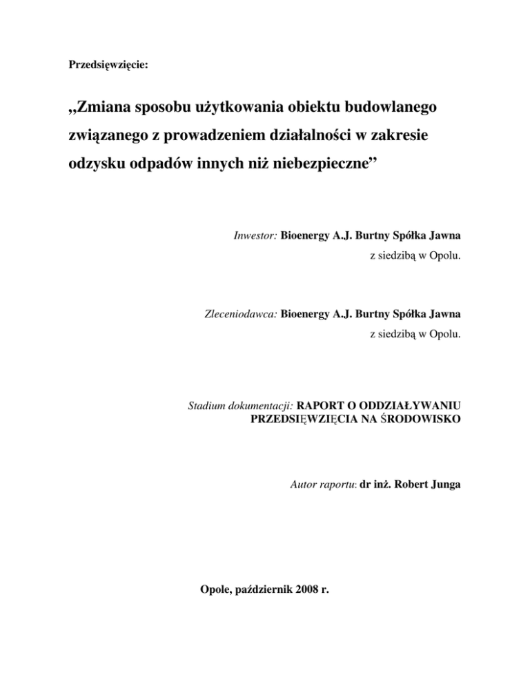 Przedsięwzięcie: „Zmiana sposobu użytkowania obiektu budowlanego związanego z prowadzeniem działalności w zakresie odzysku odpadów innych niż niebezpieczne” Inwestor: Bioenergy A.J. Burtny Spółka Jawna z siedzibą w Opolu. Zleceniodawca: Bioenergy A.J. Burtny Spółka Jawna z siedzibą w Opolu. Stadium dokumentacji: RAPORT O ODDZIAŁYWANIU PRZEDSIĘWZIĘCIA NA ŚRODOWISKO Autor raportu: dr inż. Robert Junga Opole, październik 2008 r. 1 Raport o oddziaływaniu przedsięwzięcia na środowisko SPIS TREŚCI 1. PODSTAWY PRAWNE I CEL OPRACOWANIA................................................................4 2. OPIS ELEMENTÓW PRZYRODNICZYCH ŚRODOWISKA ............................................7 2.1. Położenie gminy Gogolin ........................................................................................................7 2.2. Klimat .....................................................................................................................................9 2.2.1. Termika i opady..............................................................................................................9 2.2.2. Wilgotność .....................................................................................................................9 2.2.3. Wiatry ............................................................................................................................9 2.3. Rzeźba terenu i warunki glebowe ............................................................................................9 2.3.1. Rzeźba terenu .................................................................................................................9 2.3.2. Warunki glebowe..........................................................................................................10 2.4. Warunki geologiczne.............................................................................................................11 2.5. Wody powierzchniowe i gruntowe ........................................................................................11 2.6. Fauna i flora ..........................................................................................................................12 2.7. Obszary Natura 2000.............................................................................................................13 2.8. Zabytki w Gminie Gogolin ....................................................................................................17 3. CHARAKTERYSTYKA PLANOWANEJ INWESTYCJI ..................................................20 3.1. Stan istniejący .......................................................................................................................20 3.2. Stan projektowany.................................................................................................................21 3.3. Charakterystyka odpadów – surowców do produkcji peletu...................................................21 3.3.1. Odpady pochodzenia rolno-spożywczego .....................................................................21 3.3.2. Paliwa do produkcji energii cieplnej .............................................................................23 3.4. Technologia ..........................................................................................................................23 3.5. Przewidywany poziom zużycia surowców, paliw i energii.....................................................24 3.6. Czas pracy instalacji, zatrudnienie.........................................................................................25 3.6.1. Przewidywane zużycie wody na cele socjalno-bytowe ..................................................25 4. PRZEWIDYWANE RODZAJE I ILOŚCI ZANIECZYSZCZEŃ WPROWADZANYCH DO POWIETRZA WYNIKAJĄCYCH Z FUNKCJONOWANIA PLANOWANEGO PRZEDSIĘWZIĘCIA..........................................................................................................25 4.1. Metodyka obliczeń ................................................................................................................25 4.2. Charakterystyka źródeł emisji, emitorów oraz czasu ich pracy...............................................26 4.3. Emisja zanieczyszczeń z poszczególnych procesów ..............................................................26 4.4. Piec z podajnikiem typu Stoker .............................................................................................27 4.5. Cyklony – emitory E2 i E3 ....................................................................................................27 2 Raport o oddziaływaniu przedsięwzięcia na środowisko 4.6. Wyniki obliczeń stężeń zanieczyszczeń w powietrzu atmosferycznym ..................................28 5. PRZEWIDYWANE RODZAJE I ILOŚCI ODPADÓW POWSTAJĄCYCH W FAZIE REALIZACJI I EKSPLOATACJI PLANOWANEGO PRZEDSIĘWZIĘCIA ..............28 5.1. Rodzaje wytwarzanych odpadów...........................................................................................28 5.1.1. Odpady powstające w trakcie eksploatacji przedsięwzięcia...........................................28 5.1.2. Odpady powstające w trakcie realizacji przedsięwzięcia ...............................................30 5.2. Miejsca magazynowania wytwarzanych odpadów oraz ich kategorie.....................................30 5.3. Sposoby postępowania z wytworzonymi odpadami ...............................................................32 5.4. Wnioski.................................................................................................................................33 6. EMISJA HAŁASU DO ŚRODOWISKA Z PLANOWANEGO PRZEDSIĘWZIĘCIA.....34 6.1. Wartości dopuszczalnego poziomu hałasu w środowisku dla obszarów oddziaływania planowanego przedsięwzięcia ......................................................................................................34 6.2. Charakterystyka źródeł hałasu oraz określ