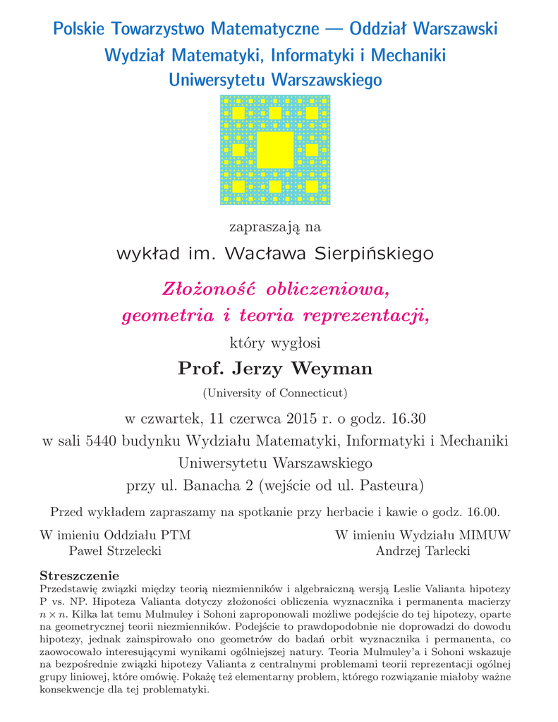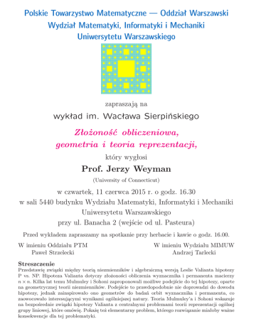 Polskie Towarzystwo Matematyczne — Oddział Warszawski Wydział Matematyki, Informatyki i Mechaniki Uniwersytetu Warszawskiego zapraszają na wykład im. Wacława Sierpińskiego Złożoność obliczeniowa, geometria i teoria reprezentacji, który wygłosi Prof. Jerzy Weyman (University of Connecticut) w czwartek, 11 czerwca 2015 r. o godz. 16.30 w sali 5440 budynku Wydziału Matematyki, Informatyki i Mechaniki Uniwersytetu Warszawskiego przy ul. Banacha 2 (wejście od ul. Pasteura) Przed wykładem zapraszamy na spotkanie przy herbacie i kawie o godz. 16.00. W imieniu Oddziału PTM Paweł Strzelecki W imieniu Wydziału MIMUW Andrzej Tarlecki Streszczenie Przedstawię związki między teorią niezmienników i algebraiczną wersją Leslie Valianta hipotezy P vs. NP. Hipoteza Valianta dotyczy złożoności obliczenia wyznacznika i permanenta macierzy n × n. Kilka lat temu Mulmuley i Sohoni zaproponowali możliwe podejście do tej hipotezy, oparte na geometrycznej teorii niezmienników. Podejście to prawdopodobnie nie doprowadzi do dowodu hipotezy, jednak zainspirowało ono geometrów do badań orbit wyznacznika i permanenta, co zaowocowało interesującymi wynikami ogólniejszej natury. Teoria Mulmuley’a i Sohoni wskazuje na bezpośrednie związki hipotezy Valianta z centralnymi problemami teorii reprezentacji ogólnej grupy liniowej, które omówię. Pokażę też elementarny problem, którego rozwiązanie miałoby ważne konsekwencje dla tej problematyki.