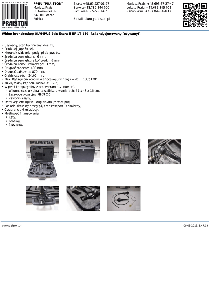PPHU "PRAISTON" Mariusz Prais ul. Górowska 32 64-100 Leszno Polska Biuro: +48.65 527-01-67 Serwis:+48.782-844-000 Fax: +48.65 527-01-67 Mariusz Prais: +48.693-37-27-47 Łukasz Prais: +48.665-345-001 Zenon Prais: +48.609-788-830 E-mail: [email protected] Wideo-bronchoskop OLYMPUS Evis Exera II BF 1T-180 (Rekondycjonowany (używany)) • Używany, stan techniczny idealny, • Produkcji japońskiej, • Kierunek widzenia: podgląd do przodu, • Średnica zewnętrzna: 6 mm, • Średnica zewnętrzna końcówki: 6 mm, • Średnica kanału roboczego: 3 mm, • Długość robocza: 600 mm, • Długość całkowita: 870 mm, • Głębia ostrości: 3-100 mm, • Max. Kąt zgięcia końcówki endoskopu w górę i w dół: 180o/130o • Maksymalny kąt pola widzenia: 120o, • W pełni kompatybilny z procesorami CV-160/140, ⚬ W komplecie oryginalna walizka o wymiarach: 59 x 43 x 16 cm, ⚬ Szczypce biopsyjne FB-36C-1, ⚬ Zaworek ssący, • Instrukcja obsługi w j. angielskim (format pdf), • Posiada aktualny przegląd, oraz Paszport Techniczny, • Gwaarancja 6-miesięcy, • Możliwość finansowania: ⚬ Raty, ⚬ Leasing, ⚬ Pożyczka. www.praiston.pl 06-09-2013, 9:47:13