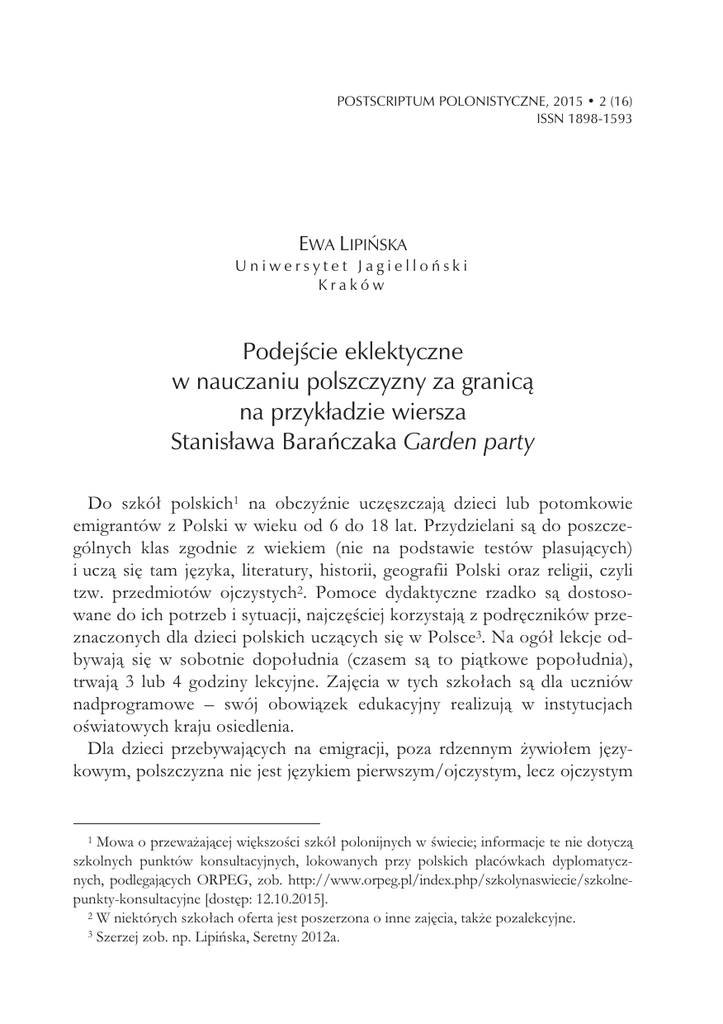 POSTSCRIPTUM POLONISTYCZNE, 2015 • 2 (16) ISSN 1898-1593 EWA LIPI SKA Uniwersytet Jagiello!ski Kraków Podej"cie eklektyczne w nauczaniu polszczyzny za granic# na przyk$adzie wiersza Stanis$awa Bara!czaka Garden party Do szkó polskich1 na obczy!nie ucz"szczaj# dzieci lub potomkowie emigrantów z Polski w wieku od 6 do 18 lat. Przydzielani s# do poszczególnych klas zgodnie z wiekiem (nie na podstawie testów plasuj#cych) i ucz# si" tam j"zyka, literatury, historii, geografii Polski oraz religii, czyli tzw. przedmiotów ojczystych2. Pomoce dydaktyczne rzadko s# dostosowane do ich potrzeb i sytuacji, najcz"$ciej korzystaj# z podr"czników przeznaczonych dla dzieci polskich ucz#cych si" w Polsce3. Na ogó lekcje odbywaj# si" w sobotnie dopo udnia (czasem s# to pi#tkowe popo udnia), trwaj# 3 lub 4 godziny lekcyjne. Zaj"cia w tych szko ach s# dla uczniów nadprogramowe – swój obowi#zek edukacyjny realizuj# w instytucjach o$wiatowych kraju osiedlenia. Dla dzieci przebywaj#cych na emigracji, poza rdzennym %ywio em j"zykowym, polszczyzna nie jest j"zykiem pierwszym/ojczystym, lecz ojczystym 1 Mowa o przewa%aj#cej wi"kszo$ci szkó polonijnych w $wiecie; informacje te nie dotycz# szkolnych punktów konsultacyjnych, lokowanych przy polskich placówkach dyplomatycznych, podlegaj#cych ORPEG, zob. http://www.orpeg.pl/index.php/szkolynaswiecie/szkolnepunkty-konsultacyjne [dost"p: 12.10.2015]. 2 W niektórych szko ach oferta jest poszerzona o inne zaj"cia, tak%e pozalekcyjne. 3 Szerzej zob. np. Lipi&ska, Seretny 2012a. 142 POSTSCRIPTUM POLONISTYCZNE, 2015 • 2 (16) jako drugim/odziedziczonym (heritage language)4. To sprawia, %e za pomoc# odpowiednich metod i technik oraz materia ów dydaktycznych powinien on by' nauczany cz"$ciowo jak j"zyk obcy, a cz"$ciowo jak rodzimy. Specyfika przyswajania j"zyka odziedziczonego powoduje, %e najwa%niejszym zadaniem szko y jest kszta towanie kompetencji j"zykowych, bez opanowania których dalsze aspekty edukacji s# utrudnione, je$li nie niemo%liwe. Kszta cenie literacko-historyczno-kulturowe powinno zajmowa' dalsze miejsce – do czasu osi#gni"cia odpowiedniego poziomu j"zykowego5 (zob. Lipi&ska, Seretny 2012a). Nie wszyscy nauczyciele s# do stosowania takiej metody przygotowani, dlatego tak wa%ne s# wszelkie kursy i szkolenia modernizuj#ce ich warsztat pracy. Za granic# niemo%liwa jest pe na realizacja programu nauczania j"zyka polskiego przewidzianego dla szkó polskich w Polsce. Musi on zosta' dopasowywany do wielu czynników szczegó owych, odnosz#cych si" do konkretnego kraju, miejsca i warunków lokalnych, oraz ogólnych, wcze$niej wspomnianych, takich jak: ograniczona liczba godzin nauki, s absza znajomo$' j"zyka rodzimego uczniów, brak odpowiednich materia ów dydaktycznych, mo%liwo$ci kadry nauczycielskiej. Nie najlepiej te% wygl#da motywacja uczniów do nauki polszczyzny, która nie pe ni funkcji j"zyka pierwszego; inaczej przebiega zapoznawanie ich z dziedzictwem kulturowym, a tak%e pog "bianie wiedzy realioznawczej. Inaczej, czyli trudniej. St#d nauka w szkole polskiej powinna by' nie tylko dostosowana do specyfiki j"zyka odziedziczonego, ale te% atrakcyjna, nowoczesna i ciekawa. Wydaje si", %e odpowiednim rozwi#zaniem jest podej$cie eklektyczne, rozumiane jako stosowanie melan%u programów, narz"dzi i metod opartych na nowoczesnych technologiach, które s# bliskie m odemu pokoleniu. W niniejszym artykule omówione zostan# te sfery glottodydaktyki, które w nauczaniu polszczyzny za granic# mog# okaza' si" najbardziej skuteczne. Jedn# z nich jest podej$cie zadaniowe, w którym ucz#cy si" s# postrzegani jako dynamiczne „jednostki spo eczne”, maj#ce do wykonania zadania (nie tylko j"zykowe), uwarunkowane kontekstem $rodowiskowym i sytuacyjnym. Chodzi tu o czynno$ci indywidulane lub (cz"$ciej) zbiorowe, w których kluczow# rol" odgrywa potencja poznawczy, emocjonalny 4 To j"zyk ojczysty imigrantów, u%ywany w $rodowisku domowym i/lub etnicznym. (#czy warto$ci rodzinne i bogactwo spu$cizny narodowej. Zob. szerzej Lipi&ska, Seretny 2012b. 5 Nie oznacza to jego pomijania, lecz ograniczanie, np. poprzez skracanie i upraszczania tekstów literackich, wielokrotne powtarzanie itp., a nawet – w pewnych sytuacjach – korzystanie z t umacze& na j"zyk kraju osiedlenia. EWA LIPI SKA: Podej"cie eklektyczne w nauczaniu polszczyzny… 143 i decyzyjny danej jednostki/danych jednostek, a tak%e ca e spektrum umiej"tno$ci, które stosuje ona/stosuj# one w %yciu (zob. Europejski system opisu kszta cenia j!zykowego, dalej: ESOKJ). Istot# dydaktyki zadaniowej jest aktywno$' uczniów, ich zaanga%owanie i wspó praca. Nauczyciel przygotowuje ich do dzia ania, motywuje do odkrywania nowych form j"zykowych, znacze& (jako elementów komunikacji) przedstawionych tekstów, regu u%ycia poznanego s ownictwa oraz rozwijania leksyki wychodz#cej poza zakres tekstu, stwarza warunki do praktykowania j"zyka w autentycznych kontekstach komunikacyjnych lub sytuacjach zbli%onych do rzeczywistych (zob. Janowska 2010). Ze wzgl"du na specyfik" nauczania polszczyzny poza Polsk# dydaktyka zadaniowa mo%e by' realizowana w formie cykli tematycznych6 i na zasadzie zintegrowanego nauczania interdyscyplinarnego (mi"dzyprzedmiotowego7). Polega to na odpowiednim powi#zaniu podsystemów oraz sprawno$ci j"zykowych, tj. dzia a& produktywnych, receptywnych, interakcyjnych i mediacyjnych. U%yteczny w tej sytuacji staje si" program autorski8, opieraj#cy si" na wspomnianym wy%ej zadaniowym podej$ciu do nauczania j"zyka obcego (zob. Janowska, Lipi&ska, Seretny 2006). Zak ada on m.in. wykorzystywanie takich pomocy dydaktycznych, które powinny zaabsorbowa' uczniów, pobudzi' ich do my$lenia i rozwi#zywania problemów. Program autorski ma niewiele mankamentów, w$ród których mo%na wymieni' czasoch onno$' jego opracowania oraz prawdopodobn# jednorazowo$' zastosowania. Posiada natomiast sporo zalet, np.: – pozwala nauczycielowi realizowa' okre$lone tre$ci w sposób zindywidualizowany, zgodny z jego zain