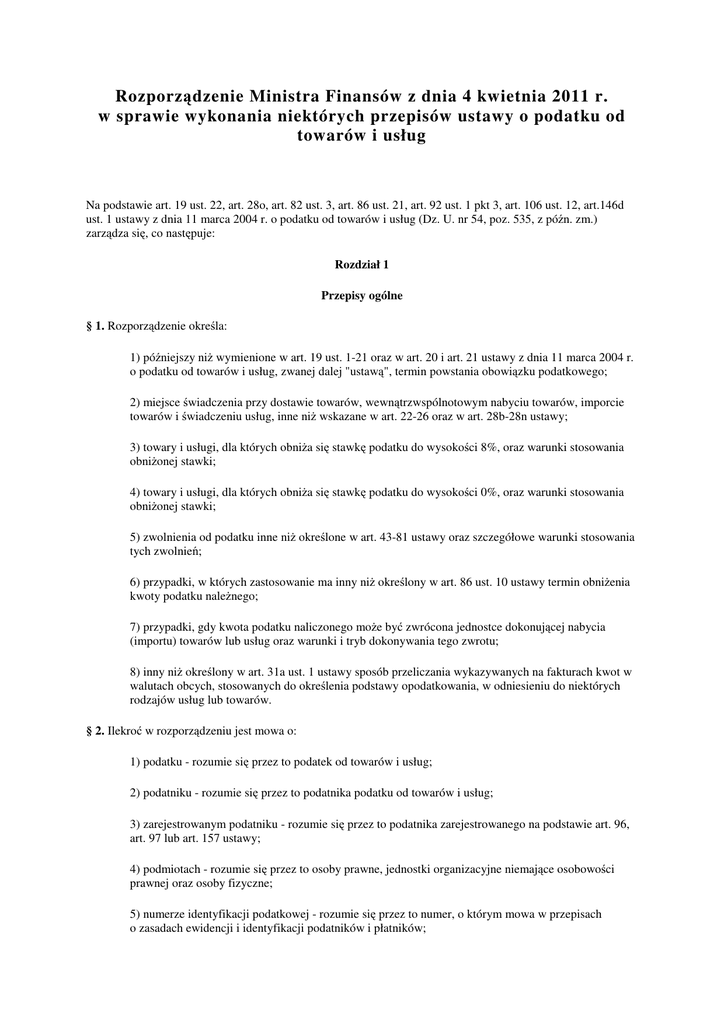 Rozporządzenie Ministra Finansów z dnia 4 kwietnia 2011 r. w sprawie wykonania niektórych przepisów ustawy o podatku od towarów i usług Na podstawie art. 19 ust. 22, art. 28o, art. 82 ust. 3, art. 86 ust. 21, art. 92 ust. 1 pkt 3, art. 106 ust. 12, art.146d ust. 1 ustawy z dnia 11 marca 2004 r. o podatku od towarów i usług (Dz. U. nr 54, poz. 535, z późn. zm.) zarządza się, co następuje: Rozdział 1 Przepisy ogólne § 1. Rozporządzenie określa: 1) późniejszy niż wymienione w art. 19 ust. 1-21 oraz w art. 20 i art. 21 ustawy z dnia 11 marca 2004 r. o podatku od towarów i usług, zwanej dalej "ustawą", termin powstania obowiązku podatkowego; 2) miejsce świadczenia przy dostawie towarów, wewnątrzwspólnotowym nabyciu towarów, imporcie towarów i świadczeniu usług, inne niż wskazane w art. 22-26 oraz w art. 28b-28n ustawy; 3) towary i usługi, dla których obniża się stawkę podatku do wysokości 8%, oraz warunki stosowania obniżonej stawki; 4) towary i usługi, dla których obniża się stawkę podatku do wysokości 0%, oraz warunki stosowania obniżonej stawki; 5) zwolnienia od podatku inne niż określone w art. 43-81 ustawy oraz szczegółowe warunki stosowania tych zwolnień; 6) przypadki, w których zastosowanie ma inny niż określony w art. 86 ust. 10 ustawy termin obniżenia kwoty podatku należnego; 7) przypadki, gdy kwota podatku naliczonego może być zwrócona jednostce dokonującej nabycia (importu) towarów lub usług oraz warunki i tryb dokonywania tego zwrotu; 8) inny niż określony w art. 31a ust. 1 ustawy sposób przeliczania wykazywanych na fakturach kwot w walutach obcych, stosowanych do określenia podstawy opodatkowania, w odniesieniu do niektórych rodzajów usług lub towarów. § 2. Ilekroć w rozporządzeniu jest mowa o: 1) podatku - rozumie się przez to podatek od towarów i usług; 2) podatniku - rozumie się przez to podatnika podatku od towarów i usług; 3) zarejestrowanym podatniku - rozumie się przez to podatnika zarejestrowanego na podstawie art. 96, art. 97 lub art. 157 ustawy; 4) podmiotach - rozumie się przez to osoby prawne, jednostki organizacyjne niemające osobowości prawnej oraz osoby fizyczne; 5) numerze identyfikacji podatkowej - rozumie się przez to numer, o którym mowa w przepisach o zasadach ewidencji i identyfikacji podatników i płatników; 6) sprzedawcy - rozumie się przez to podatnika, który wykonuje czynności, o których mowa w art. 2 pkt 22 ustawy; 7) nierezydencie - rozumie się przez to nierezydenta w znaczeniu określonym w ustawie z dnia 27 lipca 2002 r. - Prawo dewizowe (Dz. U. nr 141, poz. 1178, z późn. zm.); 8) rachunku bankowym - rozumie się przez to rachunek bankowy podatnika w banku mającym siedzibę na terytorium kraju lub rachunek podatnika w spółdzielczej kasie oszczędnościowo-kredytowej, której jest członkiem, wskazane w zgłoszeniu identyfikacyjnym, o którym mowa w odrębnych przepisach. Rozdział 2 Inne terminy powstania obowiązku podatkowego § 3. 1. W przypadku świadczenia usług turystyki opodatkowanych według szczególnej procedury, o której mowa w art. 119 ustawy, obowiązek podatkowy powstaje z chwilą ustalenia marży, nie później jednak niż 15. dnia od dnia wykonania usługi. 2. W przypadku świadczenia usług na rzecz sądów powszechnych, administracyjnych, wojskowych lub prokuratury przez osoby fizyczne, osoby prawne oraz jednostki organizacyjne niemające osobowości prawnej, którym sądy te lub prokurator, na podstawie właściwych przepisów, zleciły wykonanie określonych czynności związanych z postępowaniem sądowym lub przygotowawczym, obowiązek podatkowy powstaje z chwilą otrzymania całości lub części zapłaty. 3. W przypadku przeniesienia z nakazu organu władzy publicznej lub podmiotu działającego w imieniu takiego organu własności towarów w zamian za odszkodowanie, obowiązek podatkowy powstaje z chwilą otrzymania całości lub części zapłaty. Rozdział 3 Określenie innego miejsca świadczenia § 4. W przypadku świadczenia, środkami transportu morskiego lub lotniczego, usług międzynarodowego transportu: 1) osób lub 2) towarów na rzecz podmiotów niebędących podatnikami w rozumieniu art. 28a ustawy - miejscem świadczenia tych usług jest terytorium kraju. § 5. W przypadku świadczenia usług transportu towarów na rzecz podatnika w rozumieniu art. 28a ustawy, będącego usługobiorcą tych usług, posiadającego na terytorium kraju siedzibę, stałe miejsce zamieszkania lub stałe miejsce prowadzenia działalności, jeżeli transport ten wykonywany jest w całości poza terytorium Unii Europejskiej, miejscem świadczenia jest miejsce, gdzie odbywa się transport. § 6. W przypadku gdy nabywane usługi, o których mowa w art. 119 ust. 8 ustawy, są usługami transportu międzynarodowego świadczonymi środkami transportu morskiego lub lotniczego, usługi te dla opodatkowania stawką podatku w wysokości 0% usług turystyki uznaje się za usługi świadczone poza terytorium Unii Europejskiej. Rozdział 4 Towary i usługi, dla których obniża się stawkę podatku do wysokości 8%, oraz warunki stosowania obniżonej stawki § 7. 1. Stawkę podatku wymienioną w art. 41 ust. 1 ustawy obniża się do wysokości 8% dla: 1) towarów i usług wymienionych w załączniku nr 1 do rozporządzenia; 2) robót konserwacyjnych dotyczących budownictwa objętego społecznym programem mieszkaniowym; 3) robót konserwacyjnych dotyczących: a) obiektów budownictwa mieszkaniowego, o których mowa w art. 2 pkt 12 ustawy, lub ich części, z wyłączeniem lokali użytkowych, b) lokali mieszkalnych w budynkach niemieszkalnych sklasyfikowanych w Polskiej Klasyfikacji Obiektów Budowlanych w dziale 12 - w zakresie, w jakim wymienione roboty nie są objęte tą stawką na podstawie pkt 2. 2. Przez roboty konserwacyjne, o których mowa w ust. 1 pkt 2 i 3, rozumie się roboty mające na celu utrzymanie sprawności technicznej elementów bu