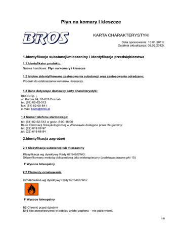 Płyn na komary i kleszcze KARTA CHARAKTERYSTYKI Data opracowania: 10.01.2011r. Ostatnia aktualizacja: 08.02.2012r. 1.Identyfikacja substancji/mieszaniny i identyfikacja przedsiębiorstwa 1.1 Identyfikator produktu: Nazwa handlowa: Płyn na komary i kleszcze 1.2 Istotne zidentyfikowane zastosowania substancji oraz zastosowania odradzane: Produkt do odstraszania komarów i kleszczy. 1.3 Dane dotyczące dostawcy karty charakterystyki: BROS Sp. j. ul. Karpia 24; 61-619 Poznań tel: (61) 82-62-512 fax: (61) 82-00-841 e-mail: [email protected] 1.4 Numer telefonu alarmowego: tel: (61) 82-62-512 w godz. 8:00-16:00 Biuro Informacji Toksykologicznej w Warszawie dostępne przez 24 godziny: tel: (22) 619 08 97 tel: (22) 619 66 54 2.Identyfikacja zagrożeń 2.1 Klasyfikacja substancji lub mieszaniny Klasyfikacja wg dyrektywy Rady 67/548/EWG: Sklasyfikowany metodą obliczeniową jako niebezpieczny (podstawa prawna pkt 15) F Wysoce łatwopalny 2.2 Elementy oznakowania Oznakowanie wg dyrektywy Rady 67/548/EWG: F Wysoce łatwopalny S2 Chronić przed dziećmi S16 Nie przechowywać w pobliżu źródeł zapłonu – nie palić tytoniu 1/8 Płyn na komary i kleszcze S23 Nie wdychać rozpylonej cieczy 2.3 Inne zagrożenia: brak 3.Skład/informacja o składnikach 3.1 Substancje: nie dotyczy 3.2 Mieszaniny: NAZWA SKŁADNIKA ilość CAS WE (EC) INDEKS 12% DEET KLASYFIKACJA KLASYFIKACJA CLP Etanol > 50% CAS WE (EC) INDEKS KLASYFIKACJA KLASYFIKACJA CLP NUMER 134-62-3 205-149-7 616-018-00-2 Xn;R22 Xi;R36/38; R52-53 Acute Tox. 4; H302 Eye Irrit. 2; H319 Skin Irrit. 2; H315 Aquatic Chronic 3; H412 64-17-5 200-578-6 603-002-00-5 F; R11 Flam. Liq. 2; H225 Międzynarodowa terminologia chemiczna: N,N-dietylo-m-toluamid; N,N-dietylo-3-metylobenzamid (DEET) Alkohol etylowy (Etanol) 4.Środki pierwszej pomocy 4.1 Opis środków pierwszej pomocy: Narażenie przez drogi oddechowe: zapewnić dostęp świeżego powietrza, przy wystąpieniu niepokojących objawów zwrócić się o pomoc lekarską. Narażenie przez kontakt ze skórą: dokładnie przemyć skórę dużą ilością wody i mydła. W przypadku wystąpienia podrażnienia skontaktować się z lekarzem. Narażenie przez kontakt z oczami: natychmiast przemyć pod bieżącą wodą i skontaktować się z lekarzem. Narażenie przez drogi pokarmowe: nie powodować wymiotów, wypłukać usta wodą. Skontaktować się z lekarzem. 4.2 Najważniejsze ostre i opóźnione objawy oraz skutki narażenia: brak danych 4.3 Wskazania dotyczące wszelkiej natychmiastowej pomocy lekarskiej i szczególnego 2/8 Płyn na komary i kleszcze postępowania z poszkodowanym: brak antidotum. Stosować leczenie objawowe. 5.Postępowanie w przypadku pożaru 5.1 Środki gaśnicze: Odpowiednie środki gaśnicze: standardowe środki gaśnicze: proszki, piana, dwutlenek węgla, rozpylona woda. Niewłaściwe środki gaśnicze: nie stosować bezpośredniego, silnego strumienia wody. 5.2 Szczególne zagrożenia związane z substancją: produkt ze względu na są postać nie jest łatwopalny lecz w warunkach pożaru ulegnie spaleniu. 5.3 Informacje dla straży pożarnej: kombinezon ochronny; rękawice, osłona twarzy; niezależny aparat oddechowy. Stosować standardowe procedury gaszenia. 6.Postępowanie w przypadku niezamierzonego uwolnienia do środowiska 6.1 Indywidualne środki ostrożności, wyposażenie ochronne i procedury w sytuacjach awaryjnych: używać środków ochrony indywidualnej: odzież i rękawice ochronne. 6.2 Środki ostrożności w zakresie ochrony środowiska: zabezpieczyć przed przedostaniem się do cieków i zbiorników wodnych. 6.3 Metody i materiały zapobiegające rozprzestrzenianiu się skażenia i służące do usuwania skażenia: zebrać ręcznie lub za pomocą sorbentu do odpowiedniego pojemnika. Jeżeli produkt nie nadaje się do użytku zutylizować. Unikać zrzutów do środowiska. Zabezpieczyć przed przedostaniem się do cieków i zbiorników wodnych. 6.4 Odniesienia do innych sekcji: patrz punkt 8 i 13 niniejszej karty charakterystyki. 7.Postępowanie z substancjami i mieszaninami oraz ich magazynowanie 7.1 Środki ostrożności dotyczące bezpiecznego postępowania: zapewnić odpowiednią wentylację, nie wdychać par. 7.2 Warunki bezpiecznego magazynowania: przechowywać w oryginalnym opakowaniu, w suchym i chłodnym miejscu. Nie przechowywać w pobliżu środków spożywczych, napojów i pasz oraz naczyń na żywność i wody pitnej. 3/8 Płyn na komary i kleszcze 7.3 Szczególne zastosowanie końcowe: brak 8.Kontrola narażenia/środki ochrony indywidualnej 8.1 Parametry dotyczące kontroli: NAZWA SKŁADNIKA/nr CAS N,N-dietylo-m-toluamid / 134-62-3 Etanol / 64-17-5 Wartość NDS Wartość NDSCh brak oznaczenia 1900 [mg/m3] brak oznaczenia brak oznaczenia 8.2 Kontrola narażenia: brak szczególnych wymagań. Zabezpieczyć przed dostępem dzieci. Produkt przeznaczony dla użytkownika powszechnego. Unikać kontaktu z oczami. 9.Właściwości fizyczne i chemiczne 9.1 Informacje na temat podstawowych właściwości fizycznych i chemicznych: Wygląd: płyn, bezbarwny Zapach: charakterystyczny (alkoholu) Próg zapachu: brak danych pH: 6-8 Temperatura topnienia / krzepnięcia: brak danych Początkowa temperatura wrzenia i zakres temperatur wrzenia: brak danych Temperatura zapłonu: brak danych Szybkość parowania: nie dotyczy Palność: palny, unikać kontaktu z otwartym ogniem Górna/dolna granica palności lub górna/dolna granica wybuchowości: nie dotyczy Prężność par: nie dotyczy Gęstość par: nie dotyczy Gęstość nasypowa [g/ml]: brak danych Rozpuszczalność: rozpuszcza się w H2O Współczynnik podziału: n-oktanol/woda: brak danych Temperatura samozapłonu: nie dotyczy Temperatura rozkładu: nie dotyczy Lepkość: brak danych Właściwości wybuchowe: nie dotyczy Właściwości utleniające: nie dotyczy 9.2 Inne informacje: brak. 10. Stabilność i reaktywność 4/8 Płyn na komary i kleszcze 10.1 Reaktywność: nie jest reaktywny 10.2 Stabilność chemiczn