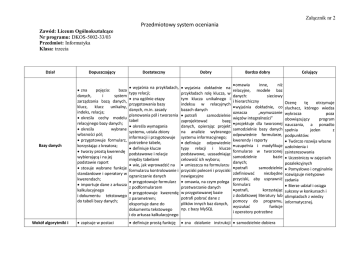 Załącznik nr 2 Przedmiotowy system oceniania Zawód: Liceum Ogólnokształcące Nr programu: DKOS-5002-33/03 Przedmiot: Informatyka Klasa: trzecia Dział Dopuszczający Bazy danych zna pojęcia: baza danych, i system zarządzania bazą danych, klucz, klucz unikalny, indeks, relacja; określa cechy modelu relacyjnego bazy danych; określa wybrane własności pól; przygotowuje formularz, korzystając z kreatora; tworzy prostą kwerendę wybierającą i na jej podstawie raport stosuje wybrane funkcje standardowe i operatory w kwerendach; importuje dane z arkusza kalkulacyjnego i dokumentu tekstowego do tabeli bazy danych; Wokół algorytmiki i zapisuje w postaci Dostateczny Dobry Bardzo dobry wyjaśnia na przykładach, typy relacji; zna ogólnie etapy przygotowania bazy danych, m.in. zasady planowania pól i tworzenia tabel określa wymagania systemu, ustala zbiory informacji i przygotowuje potrzebne tabele, definiuje klucze podstawowe i relacje między tabelami wie, jak wprowadzić na formularzu kontrolowanie i ograniczanie danych przygotowuje formularz z podformularzem przygotowuje kwerendę z parametrem; eksportuje dane do dokumentu tekstowego i do arkusza kalkulacyjnego wyjaśnia dokładnie na przykładach rolę klucza, w tym klucza unikalnego i indeksu w relacyjnych bazach danych potrafi samodzielnie zaprojektować bazę danych, opierając projekt na analizie wybranego systemu informacyjnego; definiuje odpowiednie typy relacji i klucze podstawowe, uzasadniając celowość ich wyboru; umieszcza na formularzu przyciski poleceń i przyciski nawigacyjne omawia, na czym polega przetwarzanie danych w przygotowanej bazie potrafi pobrać dane z plików innych baz danych, np. z bazy MySQL omawia inne, niż relacyjne, modele baz danych: sieciowy i hierarchiczny wyjaśnia dokładnie, co oznacza „wymuszanie więzów integralności” projektuje dla tworzonej samodzielnie bazy danych odpowiednie formularze, kwerendy i raporty uzupełnia i modyfikuje formularze w tworzonej samodzielnie bazie danych; potrafi samodzielnie zdefiniować niezbędne przyciski, aby usprawnić formularz potrafi, korzystając z dodatkowej literatury lub pomocy do programu, wyszukać funkcje i operatory potrzebne definiuje prostą funkcję zna działanie instrukcji samodzielnie dobiera Celujący Ocenę tę otrzymuje słuchacz, którego wiedza wykracza poza obowiązujący program nauczania, a ponadto spełnia jeden z podpunktów: Twórczo rozwija własne uzdolnienia i zainteresowania Uczestniczy w zajęciach pozalekcyjnych Pomysłowo i oryginalnie rozwiązuje nietypowe zadania Bierze udział i osiąga sukcesy w konkursach i olimpiadach z wiedzy informatycznej. Załącznik nr 2 programowania Algorytmika i programowanie programu algorytmy iteracyjne, w których nie jest z góry określona liczba kroków iteracji wie, jak zadeklarować i wywołać funkcję w Turbo Pascalu; potrafi przejść do trybu graficznego w Turbo Pascalu; omawia i analizuje wybrane algorytmy sortowania (przez wybór, bąbelkowy, kubełkowy) przygotowane np. w postaci gotowych schematów blokowych lub programów komputerowych wyjaśnia różnice między iteracją a rekurencją z jednym parametrem omawia iteracyjną realizację algorytmów: Euklidesa, generowania liczb Fibonacciego, schemat Hornera; wyjaśnia metodę „dziel i zwyciężaj” na przykładzie algorytmu znajdowania minimum i maksimum równocześnie stosuje w programach podstawowe procedury graficzne, korzystając z podręcznika (rysuje punkty, proste i krzywe, wypełnia barwą wyznaczony obszar) wie, na czym polega rekurencja i podaje przykłady zjawisk rekurencyjnych; iteracyjnych while i repeat; wyjaśnia, kiedy stosujemy funkcje, a kiedy procedury potrafi zapisać w języku Turbo Pascal iteracyjne wersje algorytmów, stosuje procedury graficzne w realizacji złożonych programów, np. animacji; potrafi zapisać wybrane algorytmy sortowania w postaci programów w języku Turbo Pascal potrafi zapisać algorytm rekurencyjny w postaci programu odpowiednią instrukcję iteracyjną, zależnie od warunków zadania pisze trudniejsze programy, definiując w nich odpowiednio funkcje i/lub procedury; potrafi zapisać w języku Turbo Pascal iteracyjne wersje algorytmów: Euklidesa, generowania liczb Fibonacciego, schemat Hornera i algorytm znajdowania minimum i maksimum równocześnie potrafi napisać program rysujący wykres funkcji, np. y=sin(x), spiralę Archimedesa potrafi zapisać wybrane algorytmy w postaci programów w języku Turbo Pascal w wersji rekurencyjnej, swobodnie zamienia wersję iteracyjną na rekurencyjną podaje przykłady standardowych modułów Turbo Pascala; zna podstawowe pojęcia programowania obiektowego; omawia cechy programowania wizualnego; omawia sposób tworzenia własnych modułów, omawia sposób definiowania klas w języku Turbo Pascal zna pojęcia: zdarzenie, programowanie zdarzeniowe, wizualne i wizualno-zdarzeniowe; definiuje samodzielnie klasy w języku Turbo Pascal; projektuje prosty interfejs użytkownika (formularz z komponentami), korzysta ze środowiska Delphi, posługując się dodatkową literaturą potrafi zdefiniować własne moduły i wykorzystać je w innych programach zna cechy programowania obiektowego (hermetyzacja, dziedziczenie, polimorfizm, metody wirtualne) i Ocenę tę otrzymuje słuchacz, którego wiedza wykracza poza obowiązujący program nauczania, a ponadto spełnia jeden z podpunktów: Twórczo rozwija własne uzdolnienia i zainteresowania Załącznik nr 2 Publikacje w Internecie łączy interfejs użytkownika z częścią wykonawczą programu z pomocą nauczyciela zna ogólne zasady przygotowania projektu w Delphi; wymienia najważniejsze własności algorytmów; wie, na czym polega określanie złożoności obliczeniowej i pamięciowej oraz efektywności algorytmu; potrafi, korzystając z pomocy dydaktycznych i opisu w podręczniku, omówić algorytm Wież Hanoi; dodaje do przycisków umieszczonych na formularzu obsługę zdarzeń prz
