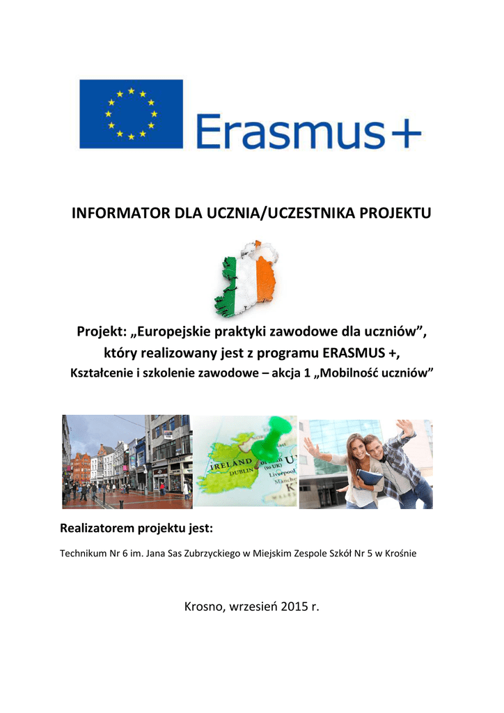 INFORMATOR DLA UCZNIA/UCZESTNIKA PROJEKTU Projekt: „Europejskie praktyki zawodowe dla uczniów”, który realizowany jest z programu ERASMUS +, Kształcenie i szkolenie zawodowe – akcja 1 „Mobilność uczniów” Realizatorem projektu jest: Technikum Nr 6 im. Jana Sas Zubrzyckiego w Miejskim Zespole Szkół Nr 5 w Krośnie Krosno, wrzesień 2015 r. Źródła finansowania projektu: Projekt jest finansowany z programu Erasmus + w ramach sektora Kształcenie i Szkolenie zawodowe – jest to sektor realizujący akcje 1 i 2 programu Erasmus + w odniesieniu do Szkół zawodowych, przedsiębiorstw oraz organizacji i instytucji związanych z kształceniem zawodowym i szkoleniami. Kontynuuje on tradycje programu Leonardo da Vinci, który działał w latach 2007 – 2013, w ramach programu „Uczenie się przez całe życie”. Nasz projekt jest realizowany w ramach akcji 1: mobilność uczniów. Strona internetowa programu Erasmus +: www.erasmusplus.org.pl Numer projektu: 2015-1-PL01-KA102-015237 Kwota dofinansowania: 40.870 EURO Czas trwania projektu: 1.06.2015 – 1.06.2016 r. Liczba osób uczestniczących: 15 uczniów, 1 opiekun. Łącznie: 16 osób. Cele i rezultaty projektu: Głównym celem projektu jest podniesienie umiejętności i kwalifikacji zawodowych uczniów techników poprzez udział w zagranicznej praktyce zawodowej . Cele szczegółowe projektu: 1) Wzrost kompetencji językowych i komunikacyjnych uczestników praktyk, 2) Nabycie nowych umiejętności zawodowych skorelowanych ze zdobywanymi kwalifikacjami w międzynarodowym środowisku pracy, 3) Wzbogacenie wiedzy o kulturze innego kraju europejskiego, 4) Kształtowanie umiejętności współpracy w grupie, radzenia sobie ze stresem 5) Podniesienie swojej samooceny zawodowej, 6) Zdobycie certyfikatów potwierdzenie nabycie nowych umiejętności oraz udział w praktyce. Rezultaty projektu: Poprzez realizację programu staży uczestnicy projektu nabędą wiedzę teoretyczną i praktyczną oraz umiejętności związane z kierunkiem kształcenia i przyszłym zawodem: · podniosą kompetencje językowe i przełamią barierę komunikowania się w języku obcym w miejscu pracy i prywatnie · nabędą kompetencje międzykulturowe (m.in. umiejętność pracy w innej kulturze, a także umiejętność pracy w zespole) · podniosą i nabędą kompetencje zawodowe · zdobędą umiejętności i kompetencje społeczne tj. umiejętność utrzymywania dobrych kontaktów z pozostałymi członkami zespołu, oraz rozwiązywania wynikłych problemów i konfliktów, · podniosą swoją motywację do zdobywania dodatkowych umiejętności i wiedzy, samoocenę i pewność siebie · wykształcą postawę otwartości na inną kulturę i kraj kwalifikacji, Uczestnicy projektu: uczniowie Technikum nr 6 w Krośnie, uczniowie kl. II technikum - 15 uczestników, kierunki: technik budownictwa, technik architektury krajobrazu, technik renowacji elementów architektury. Terminy wyjazdów i realizacji staży (planowane): Miejsce docelowe: DUBLIN (Irlandia) Przewidywany termin praktyk: 11 kwietnia 2016 – 6 maja 2016 Uwaga: w przypadku niedostępności biletów lotniczych może nastąpić przesunięcie terminu wyjazdu. Wsparcie oferowane w ramach projektu obejmuje: · · · · · · · · · · · · · bezpłatny kurs języka angielskiego fachowego ( 50 godz. lekcyjnych) zajęcia przygotowania kulturowego w kraju (5 godz. lekcyjnych) zajęcia przygotowania pedagogicznego (5 godz. lekcyjnych) mini słownik, rozmówki polsko-angielskie dla wyjeżdżających do pracy staż zawodowy 4 tygodniowy w przedsiębiorstwach, firmach w Irlandii zakwaterowanie i wyżywienie polisę ubezpieczeniową grupową transport na lotnisko i z powrotem bilet lotniczy bilet na transport lokalny w kraju stażu program kulturowy zagranicą kieszonkowe certyfikaty i dokument Europass Mobility REGULAMIN PROJEKTU I REKRUTACJI § 1 Postanowienia ogólne Niniejszy Regulamin określa zasady rekrutacji uczestników i uczestniczek projektu „EUROPEJSKIE PRAKTYKI ZAWODOWE dla uczniów”, który realizowany jest w ramach Programu Erasmus + Realizatorem projektu jest Technikum Nr 6 im. Jana Sas Zubrzyckiego w Miejski Zespół Szkół Nr 5, ul. Ks. Piotra Skargi 1 i 3, 38-400 Krosno. Partnerem projektu jest Infinity Bussines College w Dublinie, IRLANDIA. Koordynatorem projektu jest P. Monika Subik, e-mail: [email protected] § 2 Warunki uczestnictwa w projekcie Uczestnikiem projektu może być: - uczeń/uczennica Technikum Nr 6 im. Jana Sas Zubrzyckiego w Miejski Zespół Szkół Nr 5, który/a kształci się w II klasie na jednym z kierunków: technik budownictwa, technik architektury krajobrazu, technik renowacji elementów architektury. Osoba ubiegająca się o udział w projekcie zobowiązana jest złożyć formularz rekrutacyjny (APLIKACJĘ) wraz z wymaganymi dokumentami w terminie i miejscu, podanym w ogłoszeniu o rekrutacji. Ogłoszenie o rekrutacji zostanie podane do wiadomości poprzez zamieszczenie jego treści na stronie http://www.zsp6.mzs5krosno.pl/ § 3 Zasady i KRYTERIA rekrutacji do projektu Rekrutacja na staż przeprowadzona została w formie konkursu, dokona jej powołana przez Dyrektora Technikum Nr 6 - Komisja Rekrutacyjna, w skład której wejdą: Dyrektor Szkoły, koordynator projektu i 2 nauczycieli j. angielskiego. Do uczestnictwa w programie zostały zakwalifikowane osoby, które zdobędą największą ilość punktów za poniższe kryteria tj.: 1. średnia ocen ogólna oraz średnia ocen z przedmiotów zawodowych na zakończenie I klasy, ilość punktów = średnia x 2 – max 24 pkt. 2. ocena z zachowania na zakończenie I klasy, ilość punktów = poprawne - 1 pkt, dobre - 2 pkt, bardzo dobre - 3 pkt, wzorowe - 4 pkt. – max 4 pkt. 3. dodatkowe umiejętności, potwierdzone dokumentem: zaświadczenia o ukończonych kursach, warsztatach zawodowych, językowych, itp. (za każdy posiadany certyfikat 1 pkt.) – max. 5 pkt. 4. znajomość j. angielskiego (ocena końcowa 