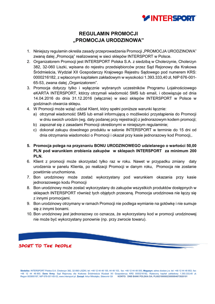 REGULAMIN PROMOCJI „PROMOCJA URODZINOWA” 1. Niniejszy regulamin określa zasady przeprowadzenia Promocji „PROMOCJA URODZINOWA” zwaną dalej „Promocją” realizowanej w sieci sklepów INTERSPORT w Polsce. 2. Organizatorem Promocji jest INTERSPORT Polska S.A. z siedzibą w Cholerzynie, Cholerzyn 382, 32-060 Liszki, wpisana do rejestru przedsiębiorców przez Sąd Rejonowy dla Krakowa Śródmieścia, Wydział XII Gospodarczy Krajowego Rejestru Sądowego pod numerem KRS: 0000216182, z wpłaconym kapitałem zakładowym w wysokości 1.393.333,40 zł, NIP 676-00165-53, zwana dalej „Organizatorem”. 3. Promocja dotyczy tylko i wyłącznie wybranych uczestników Programu Lojalnościowego eKARTA INTERSPORT, którzy otrzymali wiadomość SMS lub email, i obowiązuje od dnia 14.04.2016 do dnia 31.12.2016 (włącznie) w sieci sklepów INTERSPORT w Polsce w godzinach otwarcia sklepu. 4. W Promocji może wziąć udział Klient, który spełni poniższe warunki łącznie: a) otrzymał wiadomość SMS lub email informującą o możliwości przystąpienia do Promocji w dniu swoich urodzin (wg. daty podanej przy rejestracji) z jednorazowym kodem promocji; b) zapoznał się z zasadami Promocji określonymi w niniejszym regulaminie; c) dokonał zakupu dowolnego produktu w salonie INTERSPORT w terminie do 15 dni od dnia otrzymania wiadomości o Promocji i okazał przy kasie jednorazowy kod Promocji,. 5. Promocja polega na przyznaniu BONU URODZINOWEGO udzielanego o wartości 50,00 PLN pod warunkiem zrobienia zakupów w sklepach INTERSPORT za minimum 200 PLN. 6. Klient z promocji może skorzystać tylko raz w roku. Nawet w przypadku zmiany daty urodzenia w panelu Klienta, po realizacji Promocji w danym roku, Promocja nie zostanie powtórnie uruchomiona. 7. Bon urodzinowy może zostać wykorzystany pod warunkiem okazania przy kasie jednorazowego kodu Promocji 8. Bon urodzinowy może zostać wykorzystany do zakupów wszystkich produktów dostępnych w sklepach INTERSPORT również tych objętych przeceną. Promocja urodzinowa nie łączy się z innymi promocjami. 9. Bon urodzinowy otrzymany w ramach Promocji nie podlega wymianie na gotówkę i nie sumuje się z innymi bonami. 10. Bon urodzinowy jest jednorazowy co oznacza, że wykorzystany kod w promocji urodzinowej nie może być wykorzystany ponownie (np. przy zwrocie towaru). Siedziba: INTERSPORT Polska S.A. Cholerzyn 382, 32-060 LISZKI, tel: +48 12 44 48 100, 44 48 103, fax: +48 12 44 48 000, Magazyn: adres dostaw j.w. tel: +48 12 44 48 853, fax: +48 12 44 48 850. Dane firmy: Sąd Rejonowy dla Krakowa Śródmieścia Wydział XII Gospodarczy KRS 0000216182, Wpłacony kapitał zakładowy 1.393.333,40 zł; Regon 003900187, NIP 676-001-65-53, www.intersport.pl. Zarząd: Artur Mikołajko, Sławomir Gil KONTO: DNB BANK POLSKA SA; PL68219000023000004673920101 ZWROT TOWARU: 11. Przy zwrocie towaru mają zastosowanie przepisy regulaminu programu lojalnościowego eKARTA INTERSPORT z wyłączeniem części dotyczącej ponownego generowania bonu. W przypadku zwrotu towaru bon urodzinowy przepada (kod nie jest ponownie generowany). 12. Zwrot towaru zakupionego w ramach Promocji jest możliwy w ciągu 14 dni od daty zakupu pod warunkiem, że towar podlegający zwrotowi nie nosi oznak użytkowania. 13. Przy zwrocie towaru klient otrzymuje równowartość kwoty na paragonie. Powyższy zapis nie dotyczy zwrotów w ramach odpowiedzialności Sprzedawcy z tytułu rękojmi wynikającej z Kodeksu cywilnego. WYMIANA TOWARU: 14. Klient może w ciągu 14 dni od daty zakupu wymienić zakupiony podczas Promocji towar (w miarę dostępności na stanach magazynowych) pod warunkiem, że towar podlegający wymianie nie nosi oznak użytkowania. 15. W przypadku wymiany towaru bon urodzinowy przepada (kod nie jest ponownie generowany). REKLAMACJE: 16. W przypadku uznanej reklamacji towaru objętego Promocją, klient realizujący zakup z użyciem Bonu Urodzinowego nie może ponownie otrzymać bonu - bon przepada (kod nie jest ponownie generowany).. 17. Niniejszy regulamin jest dostępny w sklepach INTERSPORT od 14.04.2016 do 15.01.2017 r. 18. Wszelkie zapytania związane z Promocją powinny być kierowane w formie pisemnej na adres [email protected]. Siedziba: INTERSPORT Polska S.A. Cholerzyn 382, 32-060 LISZKI, tel: +48 12 44 48 100, 44 48 103, fax: +48 12 44 48 000, Magazyn: adres dostaw j.w. tel: +48 12 44 48 853, fax: +48 12 44 48 850. Dane firmy: Sąd Rejonowy dla Krakowa Śródmieścia Wydział XII Gospodarczy KRS 0000216182, Wpłacony kapitał zakładowy 1.393.333,40 zł; Regon 003900187, NIP 676-001-65-53, www.intersport.pl. Zarząd: Artur Mikołajko, Sławomir Gil KONTO: DNB BANK POLSKA SA; PL68219000023000004673920101