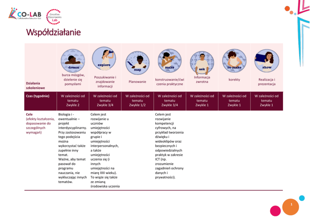 Współdziałanie Działania szkoleniowe Czas (tygodnie) Cele (efekty kształcenia, dopasowanie do szczególnych wymagań) burza mózgów, dzielenie się pomysłami Poszukiwanie i znajdowanie informacji Planowanie konstruowanie/ćwi czenia praktyczne W zależności od tematu Zwykle 2 W zależności od tematu Zwykle 3/4 W zależności od tematu Zwykle 1/2 W zależności od tematu Zwykle 3/4 Biologia i ewentualnie – projekt interdyscyplinarny. Przy zastosowaniu tego podejścia można wykorzystać także zupełnie inny temat. Ważne, aby temat pasował do programu nauczania, nie wykluczając innych tematów. Celem jest rozwijanie u uczniów umiejętności współpracy w grupie i umiejętności interpersonalnych, a także umiejętności uczenia się (i innych umiejętności na miarę XXI wieku). To wiąże się także ze zmianą środowiska uczenia Informacja zwrotna korekty Realizacja i prezentacja W zależności od tematu Zwykle 1 W zależności od tematu Zwykle 1 W zależności od tematu Zwykle 1 Celem jest rozwijanie kompetencji cyfrowych, na przykład tworzenia dźwięku i wideoklipów oraz bezpiecznych i odpowiedzialnych praktyk w zakresie ICT (np. zrozumienie zagadnień ochrony danych i prywatności). 1 Działania szkoleniowe burza mózgów, dzielenie się pomysłami Poszukiwanie i znajdowanie informacji Planowanie konstruowanie/ćwi czenia praktyczne Informacja zwrotna korekty Realizacja i prezentacja się. Opis (poszczególnych działań edukacyjnych) Uczniowie 1. Tworzą zespoły i przydzielają role (wyjaśnienie poniżej); 2. Oglądają ‘prowokacyjne ’ wideo, stanowiące bodziec do dyskusji; Nauczyciel: rzuca uczniom wyzwanie, jakim jest zbadanie kontrowersyjnej kwestii, która ich interesuje (... i która mieści się w ramach programu nauczania). Uczniowie 1. Znajdują odpowiednie informacje (w Internecie, książkach, artykułach, itp.). 2. Kierownik Badań identyfikuje osoby, które już mają wyrobiony pogląd na kwestię, którą badają; 3. Lider Zespołu przejmuje odpowiedzialność za korzystanie z mediów społecznościowych (np. Twittera) i Internetu, wybiera osoby odpowiedzialne za komunikację i publikuje listę tych osób i ich profili na blogu dotyczącym projektu; Kierownik Badań Uczniowie W czasie spotkania Kierownik Badań dzieli się wynikami poszukiwań z grupą. Uczniowie 1. Formułują pytania, które zadadzą kolegom ze szkoły i innym osobom; Tworzą ankietę online. Uczniowie 1. Zadają pytanie online lekarzowi (korzystając na przykład ze Skype ‘a); 2. Lider Zespołu przydziela każdemu członkowi zespołu określone zadanie do wykonania, w tym przeprowadzenie rozmowy z wcześniej zidentyfikowanymi lokalnymi ekspertami, np. celebrytą; kimś ze szpitala; rodzicem, który pracuje w badanym obszarze; czy wykładowcą miejscowego uniwersytetu, prowadzącym wykłady na dany temat. 3. Organizator aranżuje spotkanie poza czasem zajęć w szkole, aby uzgodnić, Uczniowie Przeprowadzają dalsze badania, w tym wysyłają zidentyfikowanym ekspertom i znanym osobom emaile, aby uzyskać od nich opinie na dany temat. Uczniowie 1. Przedstawiają sugestie dotyczące działania szkoły zdrowszej dla uczniów, nauczycieli, wspólnoty/duchown ego i rodziców 2. Zebrane informacje są wykorzystane do zaplanowania prezentacji internetowych lub debaty online, którą zaprezentują uczniom w swojej szkole. Pozostali uczniowie, którzy uczestniczą w prezentacji internetowej, mogą zabrać głos na temat dyskutowanych kwestii, a wyniki dyskusji zamieszczone zostają w raporcie końcowym. 2 Działania szkoleniowe burza mózgów, dzielenie się pomysłami Poszukiwanie i znajdowanie informacji przeprowadza wstępną analizę problemu badawczego. Planowanie konstruowanie/ćwi czenia praktyczne Informacja zwrotna korekty Realizacja i prezentacja w jaki sposób skontaktować się z wybranymi osobami. Szuka kilku lokalizacji na mapie, np. lokalnego domu kultury, i sprawdza dostępność. Przekazuje inne szczegółowe informacje za pośrednictwem bloga projektowego. Działanie może obejmować debatę online, opartą na wynikach głosowania lub ankiety lub rozmowy, która pozwoli zebrać opinie i być źródłem argumentów na rzecz określonego stanowiska. 3 Działania szkoleniowe Środowisko/a uczenia się (fizyczne i wirtualne miejsca, gdzie odbywa się nauczanie) Technologie i narzędzia cyfrowe burza mózgów, dzielenie się pomysłami 1. 2. Materialne: sala lekcyjna Wirtualne: Platforma elearningowa Tablety – zapewniają, że działanie jest bardziej efektywne i skuteczne, zwłaszcza, jeśli chodzi o współdziałanie. Czy da się to zrobić bez tabletów? Beamer Wallwisher Poszukiwanie i znajdowanie informacji 1. Materialne: sala lekcyjna/dom: wybór miejsca należy do ucznia, np. użycie tabletu w muzeum Planowanie 1. Materialne: sala lekcyjna/dom Wirtualne: Internet, Skype, Moodle konstruowanie/ćwi czenia praktyczne 1. Materialne: sala lekcyjna/dom Informacja zwrotna Materialne: sala lekcyjna/dom korekty Realizacja i prezentacja 1. 2. Materialne Online i w szkole Wirtualne 2. Wirtualne: Internet, Skype, Moodle Cobiss Bezpłatne Blogger, Glogster http://www.cobiss.si korzystanie z (bezpłatne narzędzie /cobiss_eng.html narzędzia do online) tworzenia ankiet (np. korzystanie z Quick survey) platform Dokumentacja społecznościowych oraz usług w udostępniona online chmurze, zachęcanie przed spotkaniami do współdziałąnia i wspólnego kreowania zasobów wiedzy - patrz http://net.educause. edu/ir/library/pdf/ELI 7092.pdf kalendarz online i inne narzędzia do planowania, organizacji pracy i ustanawiania Skype Online Prezentacje w szkle tworzone za pomocą aplikacji Beamer, komputera Webinar 4 Działania szkoleniowe burza mózgów, dzielenie się pomysłami Poszukiwanie i znajdowanie informacji Planowanie konstruowanie/ćwi czenia praktyczne Informacja zwrotna korekty Realizacja i prezentacja indywidualnych celów uczenia się. Role (nauczyciel, uczeń, rodzic, 