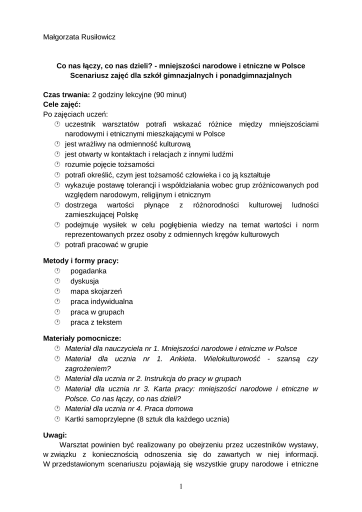Małgorzata Rusiłowicz Co nas łączy, co nas dzieli? - mniejszości narodowe i etniczne w Polsce Scenariusz zajęć dla szkół gimnazjalnych i ponadgimnazjalnych Czas trwania: 2 godziny lekcyjne (90 minut) Cele zajęć: Po zajęciach uczeń: uczestnik warsztatów potrafi wskazać różnice między mniejszościami narodowymi i etnicznymi mieszkającymi w Polsce jest wrażliwy na odmienność kulturową jest otwarty w kontaktach i relacjach z innymi ludźmi rozumie pojęcie tożsamości potrafi określić, czym jest tożsamość człowieka i co ją kształtuje wykazuje postawę tolerancji i współdziałania wobec grup zróżnicowanych pod względem narodowym, religijnym i etnicznym dostrzega wartości płynące z różnorodności kulturowej ludności zamieszkującej Polskę podejmuje wysiłek w celu pogłębienia wiedzy na temat wartości i norm reprezentowanych przez osoby z odmiennych kręgów kulturowych potrafi pracować w grupie Metody i formy pracy: pogadanka dyskusja mapa skojarzeń praca indywidualna praca w grupach praca z tekstem Materiały pomocnicze: Materiał dla nauczyciela nr 1. Mniejszości narodowe i etniczne w Polsce Materiał dla ucznia nr 1. Ankieta. Wielokulturowość - szansą czy zagrożeniem? Materiał dla ucznia nr 2. Instrukcja do pracy w grupach Materiał dla ucznia nr 3. Karta pracy: mniejszości narodowe i etniczne w Polsce. Co nas łączy, co nas dzieli? Materiał dla ucznia nr 4. Praca domowa Kartki samoprzylepne (8 sztuk dla każdego ucznia) Uwagi: Warsztat powinien być realizowany po obejrzeniu przez uczestników wystawy, w związku z koniecznością odnoszenia się do zawartych w niej informacji. W przedstawionym scenariuszu pojawiają się wszystkie grupy narodowe i etniczne 1 ujęte w wystawie. Nauczyciel w zależności od potrzeb edukacyjnych może wybrać np. kilka z nich. W związku z tym, iż uczniowie w czasie zajęć będą pracować z wywiadami przeprowadzonymi z przedstawicielami mniejszości narodowych i etnicznych w Polsce (dołączonymi do paneli indywidualnych) konieczne jest ich wcześniejsze wydrukowanie. Przebieg zajęć: 1. Zajęcia rozpocznij od ćwiczenia: wręcz każdemu uczniowi 8 samoprzylepnych kartek. Poproś, aby każdy uczeń wypisał na nich 4 przykłady tego, co łączy wszystkich Polaków oraz 4 przykłady tego, co nas różni/dzieli. Powiedz, że mogą podać np. cechy, wartości, wady i zalety itd. W czasie wykonywania zadania przez uczniów połóż na środku klasy ( na podłodze) kartki z napisami: Łączy nas Różni/ dzieli nas 2. Po zakończeniu pracy poleć, aby uczniowie podeszli do rozłożonych na podłodze kartek i przykleili własne kartki. Poinformuj, aby w czasie wykonywania zadania czytali stwierdzenia przyklejone wcześniej przez kolegów i koleżanki w celu umieszczenia ich w odpowiednim miejscu (te same lub podobne/bliskoznaczne stwierdzenia powinny tworzyć jeden promień) np: Łączy nas tradycje język święta Polska kraj Boże Narodzenie ziemia 3. Przed przejściem do kolejnego ćwiczenia zaproponuj uczniom wypełnienie ankiety Materiał dla ucznia nr 1. Ankieta. Wielokulturowość - szansą czy zagrożeniem? 4. Po wypełnieniu zbierz ankiety od uczniów. Opracuj ich wyniki, kiedy uczniowie będą pracować w grupach. 5. Podziel uczniów na 5 grup. Poproś, aby przedstawiciele każdej z nich wylosowali (przygotowane wcześniej i wydrukowane) 2 kartki z mniejszościami etnicznymi i narodowymi mieszkającymi obecnie w Polsce (Materiał dla nauczyciela nr 1. Mniejszości narodowe i etniczne w Polsce). Następnie rozdaj uczniom wydrukowane wcześniej wywiady przeprowadzone z przedstawicielami każdej z mniejszości (każda grupa otrzymuje wywiad zgodnie z wylosowanymi mniejszościami). Poinformuj, że zadaniem grup będzie opracowanie (na podstawie wystawy: paneli ogólnych i indywidualnych 2 oraz wywiadów) informacji dotyczących tego, co łączy a co różni Polaków i daną mniejszość narodową lub etniczną (Materiał dla ucznia nr 2. Instrukcja do pracy w grupach). 6. Przed prezentacją grup rozdaj każdemu uczniowi Materiał dla ucznia nr 3. Karta pracy: mniejszości narodowe i etniczne w Polsce. Co nas łączy, co nas dzieli? 7. Przedstaw uczniom wyniki ankiety przeprowadzonej na początku zajęć. Przeprowadź z uczniami krótką dyskusję na jej temat. 8. Poproś grupy o prezentację wyników pracy a pozostałych uczniów o uzupełnianie w czasie prezentacji informacji w Karcie pracy. 9. Przeprowadź z uczniami dyskusję na temat wypisanych stwierdzeń. Zapytaj, czy różnice dotyczące np. używania w domu, czy kontaktach towarzyskich języka innego niż język polski, odmiennych tradycji, różnic związanych z obrzędowością w czasie świąt religijnych, wyznawanie innej religii itd. przyczyniają się do tworzenia dystansu wobec mniejszości narodowych i etnicznych. Jeżeli tak, poproś, aby uczniowie zastanowili się nad jego źródłami (niedostateczna wiedza na temat dziedzictwa kulturowego mniejszości etnicznych i narodowych mieszkających w Polsce, brak osobistego kontaktu z mniejszościami, funkcjonowanie stereotypów, brak poszanowania w stosunku do szeroko rozumianej odmienności/ inności). 10. Powróć do wypisanych na początku lekcji stwierdzeń odnoszących się do tego, co łączy a co różni/ dzieli Polaków. Podkreśl, że różnorodność nie jest zjawiskiem negatywnym. Wręcz przeciwnie wzbogaca naszą rzeczywistość. Dlatego w tolerancyjnym społeczeństwie każda tworząca go jednostka ma prawo do wolności, w tym do swobodnego kultywowania własnej kultury, wyznawania religii. Mniejszości narodowe i etniczne więc również mają swoje prawa, które powinniśmy szanować i respektować. 11. Podsumowanie: na zakończenie zajęć przeprowadź krótką dyskusję na temat: Czy jesteśmy tolerancyjni wobec mniejszości narodowych i etnicznych mieszkających w Polsce i czy mniejszości są tolerancyjne wobec nas? Czuwaj nad właściwym przebiegiem dyskusji. Ważne,