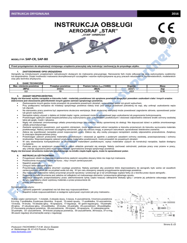 INSTRUKCJA ORYGINALNA 2016 INSTRUKCJA OBSŁUGI AEROGRAF „STAR” „STAR” AIRBRUSH MODEL/TYP: SAP-CR, SAP-B0 Przed przystąpieniem do eksploatacji niniejszego urządzenia przeczytaj całą instrukcję i zachowaj ją do przyszłego użytku. 1. ZASTOSOWANIE/ OPIS URZĄDZENIA Aerografy są miniaturowymi urządzeniami natryskowymi służącymi do malowania precyzyjnego. Nanoszenie farb może odbywać się przy wykorzystaniu szablonów lub bezpośrednio. Dzięki możliwości malowania skomplikowanych szczegółów i wzorów wykorzystywane są przy pracach retuszerskich, konserwatorskich, modelarskich oraz jako technika artystyczna. 2. DANE TECHNICZNE Max. ciśnienie powietrza (MPa) 2,2 Przepływ powietrza (l/min) 10 Poziom hałasu LwA (14462) dB(A) <70 Drgania (m/s2) <2,5 Masa (kg) 0,10 3. ZASADY BEZPIECZEŃSTWA Nigdy nie kierować wylotu narzędzia w kierunku ludzi - materiały powłokowe lub sprężone powietrze mogą być powodem uszkodzeń ciała i innych urazów. Zabronione jest stosowanie jakichkolwiek innych gazów zamiast sprężonego powietrza. Zastosowanie innych gazów może prowadzić do powstania poważnych obrażeń, spowodować pożar lub grozić wybuchem. Przy podłączaniu narzędzia do instalacji sprężonego powietrza należy brać pod uwagę przestrzeń potrzebną na wąż, aby uniknąć uszkodzenia węża lub złączek. Na stanowisku pracy powinna być zapewniona skuteczna wentylacja. Brak skutecznej wentylacji może powodować zagrożenie zdrowia, spowodować pożar lub grozić wybuchem. Narzędzie należy używać z daleka od źródeł ciepła i ognia, ponieważ może to spowodować jego uszkodzenie lub pogorszenie funkcjonowania. Przestrzegać ogólnych zasad bezpieczeństwa przy wykonywaniu prac z materiałami powłokowymi i stosować odpowiednio dobrane środki ochrony osobistej takie jak gogle, maski i rękawice. Nigdy nie zostawiać zmontowanego układu pneumatycznego bez nadzoru osoby uprawnionej do obsługi. Nie dopuszczać dzieci w pobliże zmontowanego układu pneumatycznego Zasilanie sprężonym powietrzem, pod wysokim ciśnieniem, może spowodować odrzut narzędzia w kierunku przeciwnym do kierunku wyrzucania materiału powłokowego. Należy zachować szczególną ostrożność, gdyż siły odrzutu mogą, w pewnych warunkach, spowodować wielokrotne zranienia. Zaleca się wypróbować narzędzie przed rozpoczęciem pracy. Zaleca się, aby osoby pracujące narzędziem zostały odpowiednio przeszkolone. Zwiększy to znacząco bezpieczeństwo pracy. Przestrzegać zaleceń producenta materiałów powłokowych i stosować je zgodnie z podanymi zasadami ochrony osobistej, przeciwpożarowej i ochrony środowiska. Nieprzestrzeganie zaleceń producenta materiałów powłokowych, może prowadzić do poważnych obrażeń. W celu stwierdzenia kompatybilności ze stosowanymi materiałami powłokowymi, wykaz materiałów użytych do konstrukcji narzędzia, będzie dostępny na żądanie. Podczas pracy ze sprężonym powietrzem w całym układzie gromadzi się energia. Należy zachować ostrożność, podczas pracy oraz przerw w pracy, aby uniknąć zagrożenia jakie może spowodować zgromadzona energia sprężonego powietrza. Nigdy nie kierować strumienia materiału powłokowego na źródło ciepła bądź ognia, może to spowodować pożar. 4. INSTRUKCJA UŻYTKOWANIA Przygotować obiekt do malowania powierzchnia zasłonić wszystkie obszary które nie maja być malowane. Powierzchnie musza być wolne od kurzu , rdzy i innych zanieczyszczeń. Napełnić pojemnik. Chwycić lekko aerograf w dłoń. Przyciśnięcie spustu otwiera strumień czystego powietrza. Należy pamiętać aby powietrze które doprowadzamy do aerografu było wolne od wszelkich zanieczyszczeń takich jak na przykład woda lub olej . W tym celu stosujemy zespoły przygotowania sprężonego powietrza . Aby rozpocząć malowanie należy przycisnąć przycisk spustowy i przesunąć go w tył umożliwiając wypływ farby ze z bionika przez dysze aerografu . Regulacja kształtu strumienia jest zależna od odległości od malowanego elementu i przesunięcia głównego spustu. Regulacje aerografu przeprowadzamy przez zdemontowanie tylnej części korpusu odkręcenie blokady iglicy i zmianie jej położenia odsuwając element do tylu zwiększamy otwór wylotowy materiału a przez przesuniecie do przodu zmniejszamy. Konserwacja po użyciu: Opróżnić pojemnik i przepłukać raz lub dwa razy rozpuszczalnikiem. Napełnić kubek rozpuszczalnikiem a następnie wykonywać czynności jak przy malowaniu . Wykaz części zamiennych : 1-motylek, 2-obsada dyszy, 3-dysza, 4-uszczelnienie, 5-komora powietrzna 6-o-ring, 7-podkładka, 8-pokrywa zbiornika, 9-spust, 10-zawór spustu, 11-podkładka, 12-uszczelninie, 13-śruba, 14-śruba, 15-obsada iglicy, 16-sprężyna, 17-regulacja, 18- gwint regulacyjny, 19-pokrętło 20-iglica, 21-obudowa iglicy, 22-podkładka, 23-śruba, 24-pokrętło, 25-uszczelnieni, 26-podkłądka, 27-mocowanie przyłącza powietrza, 28-uszczelnienie, 29-trzpień, 30-sprężyna, 31-zabezpieczenie 32-pokrętło, 33- uszczelnienie, 34-króciec przyłącza powietrza, 35-uszczelnienie, 36-korpus, 37-o-ring, 38-zawór regulacji strumienia(dla wersji z regulacją) Strona 1 z 2 Producent: FACHOWIEC F.H.W. Zenon Świętek ul. Stefańskiego 29, 61-415 Poznań, Polska www.fachowiec.com INSTRUKCJA ORYGINALNA 2016 DEKLARACJA ZGODNOŚCI WE (EC DECLARATION OF CONFORMITY) 001/STAR/2015 Nazwa i adres FACHOWIEC F.H.W. Zenon Świętek, ul. Stefańskiego 29, 61-415 Poznań, Polska (Name and adress) FACHOWIEC F.H.W. Zenon Świętek, Stefańskiego 29, 61-415 Poznan, Poland oświadcza, że wyroby: (declares:) Nazwa Typ/model: Dane techniczne: Aerograf airbrush SAP-CR, SAP-B0 Zasilanie: sprężone powietrzne Max. ciśnienie powietrza: 2,2 bar 2 Drgania: <2,5 m/s spełnia wymogi następujących norm i norm zharmonizowanych: EN 1953+A1:2011 ISO 9001:2008 oraz spełnia wymogi zasadnicze następujących dyrektyw: (and meets th