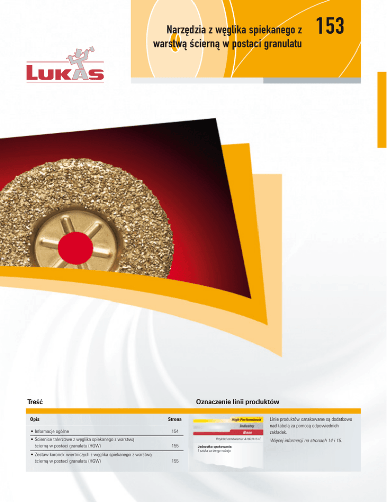 Narze˛dzia z we˛glika spiekanego z warstwa˛ ścierna˛ w postaci granulatu Treść Opis 153 Oznaczenie linii produktów Strona • Informacje ogólne 154 • Ściernice talerzowe z węglika spiekanego z warstwą ścierną w postaci granulatu (HGW) 155 • Zestaw koronek wiertniczych z węglika spiekanego z warstwą ścierną w postaci granulatu (HGW) 155 Linie produktów oznakowane są dodatkowo nad tabelą za pomocą odpowiednich zakładek. Przykład zamówienia: A18031151E Jednostka opakowania: 1 sztuka za dengo rodzaju Więcej informacji na stronach 14 i 15. 154 Narzędzia z węglika spiekanego z warstwą ścierną w postaci granulatu Informacje techniczne Granulacja i nasyp warstwy ściernej tych narzędzi są zróżnicowane i występują od bardzo zgrubnego do super drobnego, od zamkniętego do otwartego. Poszczególne stopnie uziarnienia zostały przedstawione w tabeli obok. Przykłady zastosowania Uziarnienie zgrubne nadaje się do obróbki materiałów miękkich. Im twardszy materiał, tym drobniejsze powinno być uziarnienie. Połączenie ziaren z korpusem następuje w specjalnym procesie lutowania. Generalnie można uzyskać każdy nasyp. Ponieważ jednak należy przy tym uwzględnić różne parametry techniczne, prosimy o indywidualne zapytanie. Wskazówki dotyczące bezpieczeństwa Usilnie zalecamy stosowanie napędów z regulacją prędkości obrotowej, która pozwoli na uzyskanie optymalnej prędkości pracy. W zależności od obrabianego materiału prędkość ta waha się między 10 a 50 m/s. Narzędzia z węglika spiekanego z warstwą ścierną w postaci granulatu 155 Industry Ściernice talerzowe z węglika spiekanego z warstwą ścierną w postaci granulatu, HGWT Przykład zamówienia: A18031151E Jednostka opakowania: 1 sztuka z danego rodzaju Inne wymiary i granulacja na zapytanie Skośne Oznaczenie bGranulacja b b bTyp b b bØ bmm b bOtwór bmm b bn maks. b(1/min) b bNumer artykułu b b bZalecane zastosowanie b b b b b HGWT 115 a0,3 - 0,5 E bSkośne a115 a22,2 a10.500 aA18031151E a a a a a a a a� a햺 a ■ HGWT 115 a0,8 - 1,2 E bSkośne a115 a22,2 a10.500 aA18031152E a a a a a a a a� a햺 a ■ HGWT 115 a1,2 - 1,8 E bSkośne a115 a22,2 a10.500 aA18031153E a a a a a a a a� a햺 a ■ HGWT 125 a2,5 - 3,0 E bSkośne a125 a22,2 a9.600 aA18031255E a a a a a a a a� a햺 a ■ Industry Zestaw koronek wiertniczych Przykład zamówienia: A18300012E Jednostka opakowania: 1 sztuka z danego rodzaju Oznaczenie bGranulacja b b bOpis b b bNumer artykułu b b HGWB-SET a0,8 – 1,2 E a4 koronki wiertnicze o średnicy 33, 53, 63 i 73 mm na aA18300012E a a a a a a a a� a햺 a ■ a apodstawie talerzowej z iglicą koncentrującą z węglika a a a a a a a a a a a a aspiekanego i sześciokątnym trzpieniem (SW9) a a a a a a a a a a a bZalecane zastosowanie b b b b b Warunki składania ofert, dostawy i płatności Stan: sierpień 2008 1. Poniższe warunki są ostateczne i stanowią część składową umowy. Obowiązują one w stosunku do wszystkich (także przyszłych) umów i innych usług. Podstawą wszystkich ofert są wyłącznie nasze warunki; uznaje się je za obowiązujące w momencie udzielenia zlecenia lub przyjęcia dostawy. Warunki zamawiającego, które są sprzeczne lub różnią się od naszych warunków umowy, nie są dla nas zobowiązujące, także wtedy, gdy po ich otrzymaniu ponownie nie wyraziliśmy naszego wyraźnego sprzeciwu. 2. Nie ma żadnych dodatkowych uzgodnień ustnych. Dodatkowe uzgodnienia, odstępstwa lub zmiany stają się wiążące dopiero po naszym pisemnym potwierdzeniu. Dotyczy to przede wszystkim uzgodnień dotyczących właściwości wyrobów. 3. Niniejsze warunki obowiązują wyłącznie w stosunku do przedsiębiorstw lub osób prawnych prawa publicznego lub publiczno-prawnego majątku odrębnego. 7. Nasze oferty nie są zobowiązujące. Dokumentacja należąca do oferty, jak np. rysunki, ilustracje, dane techniczne, powoływanie się na normy oraz dane w prospektach, nie stanowi uzgodnień dotyczących właściwości, chyba że zostanie to określone wyraźnie i na piśmie. 2. Nasze wzory, próbki, dane na temat składu i właściwości naszych wyrobów są oparte na naszych doświadczeniach i specjalistycznej wiedzy, nie stanowią jednak żadnej gwarancji ani innych wiążących zapewnień. 3. Do prospektów, ilustracji, rysunków, szkiców i innych dokumentów zastrzegamy sobie prawo własności i prawa autorskie; bez naszej zgody nie wolno ich powielać, kopiować z Internetu lub udostępniać osobom trzecim, a na nasze żądanie należy je nam niezwłocznie odesłać. 2. 3. III. Zawieranie umów 1. Uznaje się, że zlecenie zostało przyjęte, gdy zostanie przez nas potwierdzone na piśmie lub gdy zrealizowano dostawę. 2. Potwierdzenie zlecenia stanowi podstawę treści i zakresu zlecenia. Uzupełnienia, zmiany lub ustne porozumienia wymagają dla swojej ważności naszego pisemnego potwierdzenia. 3. Zamawiający ponosi odpowiedzialność za prawidłowość dostarczanych przez niego dokumentów takich jak rysunki, wzory itp. Ustne dane na temat wymiarów itp. wymagają pisemnego potwierdzenia. IV. Ceny 1. 2. Nasze ceny są cenami w EURO z zakładu w Engelskirchen, z wyłączeniem opakowania, opłat przewozowych, porto, opłat celnych i ubezpieczenia. Narzuty i rabaty naliczane są zawsze od ceny podstawowej. To samo dotyczy przesyłek częściowych lub ekspresowych przygotowanych na życzenie Zamawiającego. Minimalna wartość zlecenia wynosi 130,- € netto. Przy zleceniach poniżej 130,- € naliczamy opłatę manipulacyjną w wysokości 15,- €. 3. Do ceny doliczany jest podatek VAT w aktualnie obowiązującej ustawowej wysokości. 4. W przypadku dostawy do 4 miesięcy obowiązują ceny z dnia potwierdzenia zlecenia; w przypadku dłuższych terminów dostawy obowiązywać będą ceny obowiązujące w dniu dostawy, jeśli zmianie ulegną nasze koszty własne, takie jak koszty materiałowe, płacowe lub inne koszty produkcji.