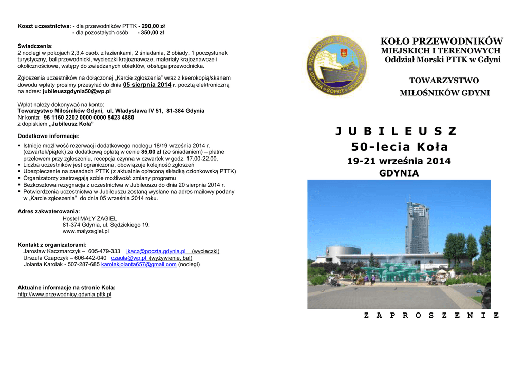 Koszt uczestnictwa: - dla przewodników PTTK - 290,00 zł - dla pozostałych osób - 350,00 zł Świadczenia: 2 noclegi w pokojach 2,3,4 osob. z łazienkami, 2 śniadania, 2 obiady, 1 poczęstunek turystyczny, bal przewodnicki, wycieczki krajoznawcze, materiały krajoznawcze i okolicznościowe, wstępy do zwiedzanych obiektów, obsługa przewodnicka. Zgłoszenia uczestników na dołączonej „Karcie zgłoszenia” wraz z kserokopią/skanem dowodu wpłaty prosimy przesyłać do dnia 05 sierpnia 2014 r. pocztą elektroniczną na adres: [email protected] Wpłat należy dokonywać na konto: Towarzystwo Miłośników Gdyni, ul. Władysława IV 51, 81-384 Gdynia Nr konta: 96 1160 2202 0000 0000 5423 4880 z dopiskiem „Jubileusz Koła” Dodatkowe informacje: Istnieje możliwość rezerwacji dodatkowego noclegu 18/19 września 2014 r. (czwartek/piątek) za dodatkową opłatą w cenie 85,00 zł (ze śniadaniem) – płatne przelewem przy zgłoszeniu, recepcja czynna w czwartek w godz. 17.00-22.00. Liczba uczestników jest ograniczona, obowiązuje kolejność zgłoszeń Ubezpieczenie na zasadach PTTK (z aktualnie opłaconą składką członkowską PTTK) Organizatorzy zastrzegają sobie możliwość zmiany programu Bezkosztowa rezygnacja z uczestnictwa w Jubileuszu do dnia 20 sierpnia 2014 r. Potwierdzenia uczestnictwa w Jubileuszu zostaną wysłane na adres mailowy podany w „Karcie zgłoszenia” do dnia 05 września 2014 roku. KOŁO PRZEWODNIKÓW MIEJSKICH I TERENOWYCH Oddział Morski PTTK w Gdyni TOWARZYSTWO MIŁOŚNIKÓW GDYNI J U B I L E U S Z 50-lecia Koła 19-21 września 2014 GDYNIA Adres zakwaterowania: Hostel MAŁY ŻAGIEL 81-374 Gdynia, ul. Sędzickiego 19. www.malyzagiel.pl Kontakt z organizatorami: Jarosław Kaczmarczyk – 605-479-333 [email protected] (wycieczki) Urszula Czapczyk – 606-442-040 [email protected] (wyżywienie, bal) Jolanta Karolak - 507-287-685 [email protected] (noclegi) Aktualne informacje na stronie Koła: http://www.przewodnicy.gdynia.pttk.pl Z A P R O S Z E N I E PROGRAM JUBILEUSZU KOŁO PRZEWODNIKÓW MIEJSKICH I TERENOWYCH 19 września 2014 r. (piątek) od godz. 7.30 - przyjmowanie i zakwaterowanie gości w Hostelu MAŁY ŻAGIEL. Oddział Morski PTTK w Gdyni PROGRAM FAKULTATYWNY: 08.50 - 12.30 – spacer z przewodnikiem brzegiem morza z Gdyni-Orłowa do hostelu MAŁY ŻAGIEL (ok. 6 km), połączony ze zwiedzaniem dzielnicy (zbiórka przed wejściem do hotelu o godz. 8.50, przejazd trolejbusem do Orłowa). mają zaszczyt zaprosić Przewodników i Sympatyków 09.00 – 12.30 - możliwość uczestniczenia w pokazach filmowych 39 Festiwalu Polskich Filmów Fabularnych (szczegółowy program na www.fpff.pl) 09.00 – 12.30 – możliwość uczestnictwa w IV Międzynarodowej Konferencji „Modernizm w Gdyni, Modernizm w Europie” – Architektura i jej waloryzacja w XX wieku. (szczegółowy program na www.gdynia.pl/modernizm/7177_.html) na Uroczystości Jubileuszowe 50-LECIA KOŁA PRZEWODNIKÓW w GDYNI które odbędą się w dniach 19 – 21 września 2014 r. w Gdyni „Gdynia i morze to jedno” (E.Kwiatkowski) 13.15 – wyjazd spod hostelu na Sesję Jubileuszową. 14.00 – uroczysta Sesja Jubileuszowa w Pomorskim Parku Naukowo Technologicznym Wystąpienia zaproszonych gości oraz prelekcje: (Sala Morska PPNT) „Na czym leżymy opalając się na plaży” - Prof. dr hab. Jan M. Węsławski (Instytut Oceanologii PAN). „Muzeum Emigracji w Gdyni – od punktu na mapie do nowego miejsca na szlaku turystycznym” – Dr Marcin Szerle (Muzeum Emigracji w Gdyni) “Ks. Hilary Jastak – król Kaszubów, kapłan niezłomny” - Mgr Robert Chrzanowski (Instytut Pamięci Narodowej Oddział w Gdańsku) “Rola trójmiejskich stoczni w nowoczesnym przemyśle morskim” – Mgr inż., MBA Adam Ślipy (Prezes Zarządu Seatech Engineering sp. z o o.) 16.00 - obiad w restauracji EUREKA na terenie Pomorskiego Parku NT. 17.00 - 18.30 - zwiedzanie Centrum Nauki EXPERYMENT ok. 19.00 – powrót do hostelu, czas wolny. 20 września 2014 r. (sobota) 8.00 - 9.00 - śniadanie 9.00 - 17.00 - autokarowa wycieczka po Gdyni ze zwiedzaniem: Ośrodka Edukacyjnego Nadleśnictwa Gdańsk na Polanie Marszewskiej, Muzeum Motoryzacji, Portu Wojennego, najstarszej dzielnicy Gdyni –Oksywia, rejs. W czasie wycieczki poczęstunek turystyczny. 19.00 - …. - BAL PRZEWODNICKI w klubie RIWIERA w stylu lat 30-tych. 21 września 2014 r. (niedziela) 7.30 - Msza Święta za przewodników w Gdyńskiej Kolegiacie NMP. 8.30 – 9.30 – śniadanie 9.45 - zwiedzanie INFOBOX-u (Obserwatorium Zmian) spacer z przewodnikiem po Kamiennej Górze. 13.00 – obiad w restauracji EL GRECCO, zakończenie, wyjazd uczestników.