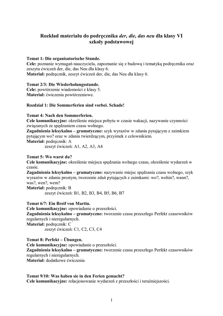 Rozkład materiału do podręcznika der, die, das neu dla klasy VI