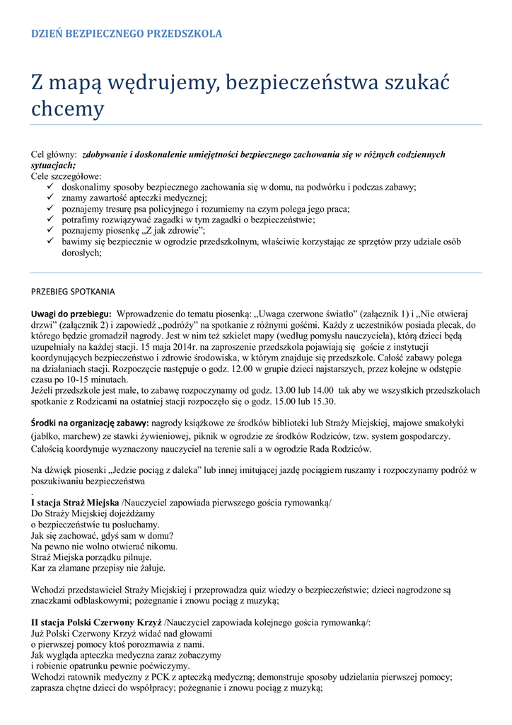DZIEŃ BEZPIECZNEGO PRZEDSZKOLA Z mapą wędrujemy, bezpieczeństwa szukać chcemy Cel główny: zdobywanie i doskonalenie umiejętności bezpiecznego zachowania się w różnych codziennych sytuacjach; Cele szczegółowe: doskonalimy sposoby bezpiecznego zachowania się w domu, na podwórku i podczas zabawy; znamy zawartość apteczki medycznej; poznajemy tresurę psa policyjnego i rozumiemy na czym polega jego praca; potrafimy rozwiązywać zagadki w tym zagadki o bezpieczeństwie; poznajemy piosenkę „Z jak zdrowie”; bawimy się bezpiecznie w ogrodzie przedszkolnym, właściwie korzystając ze sprzętów przy udziale osób dorosłych; PRZEBIEG SPOTKANIA Uwagi do przebiegu: Wprowadzenie do tematu piosenką: „Uwaga czerwone światło” (załącznik 1) i „Nie otwieraj drzwi” (załącznik 2) i zapowiedź „podróży” na spotkanie z różnymi gośćmi. Każdy z uczestników posiada plecak, do którego będzie gromadził nagrody. Jest w nim też szkielet mapy (według pomysłu nauczyciela), którą dzieci będą uzupełniały na każdej stacji. 15 maja 2014r. na zaproszenie przedszkola pojawiają się goście z instytucji koordynujących bezpieczeństwo i zdrowie środowiska, w którym znajduje się przedszkole. Całość zabawy polega na działaniach stacji. Rozpoczęcie następuje o godz. 12.00 w grupie dzieci najstarszych, przez kolejne w odstępie czasu po 10-15 minutach. Jeżeli przedszkole jest małe, to zabawę rozpoczynamy od godz. 13.00 lub 14.00 tak aby we wszystkich przedszkolach spotkanie z Rodzicami na ostatniej stacji rozpoczęło się o godz. 15.00 lub 15.30. Środki na organizację zabawy: nagrody książkowe ze środków biblioteki lub Straży Miejskiej, majowe smakołyki (jabłko, marchew) ze stawki żywieniowej, piknik w ogrodzie ze środków Rodziców, tzw. system gospodarczy. Całością koordynuje wyznaczony nauczyciel na terenie sali a w ogrodzie Rada Rodziców. Na dźwięk piosenki „Jedzie pociąg z daleka” lub innej imitującej jazdę pociągiem ruszamy i rozpoczynamy podróż w poszukiwaniu bezpieczeństwa . I stacja Straż Miejska /Nauczyciel zapowiada pierwszego gościa rymowanką/ Do Straży Miejskiej dojeżdżamy o bezpieczeństwie tu posłuchamy. Jak się zachować, gdyś sam w domu? Na pewno nie wolno otwierać nikomu. Straż Miejska porządku pilnuje. Kar za złamane przepisy nie żałuje. Wchodzi przedstawiciel Straży Miejskiej i przeprowadza quiz wiedzy o bezpieczeństwie; dzieci nagrodzone są znaczkami odblaskowymi; pożegnanie i znowu pociąg z muzyką; II stacja Polski Czerwony Krzyż /Nauczyciel zapowiada kolejnego gościa rymowanką/: Już Polski Czerwony Krzyż widać nad głowami o pierwszej pomocy ktoś porozmawia z nami. Jak wygląda apteczka medyczna zaraz zobaczymy i robienie opatrunku pewnie poćwiczymy. Wchodzi ratownik medyczny z PCK z apteczką medyczną; demonstruje sposoby udzielania pierwszej pomocy; zaprasza chętne dzieci do współpracy; pożegnanie i znowu pociąg z muzyką; III stacja Ośrodek Zdrowia /Nauczyciel zapowiada kolejnego gościa rymowanką/: W Ośrodku Zdrowia zaraz postój mamy tam o zdrowiu chętnie pielęgniarki posłuchamy. Zdrowie to podstawa człowieka szczęśliwego bezpieczeństwo jest tuż obok jako coś drugiego. Wchodzi pielęgniarka i rozmawia z dziećmi o zdrowiu w odniesieniu do bezpieczeństwa; nauczyciel proponuje piosenkę o zdrowiu pt. „Z jak zdrowie” (załącznik 3); Tutaj następuje poczęstunek – „majowe smakołyki” – marchew i jabłko do chrupania; pożegnanie i znowu pociąg z muzyką; IV stacja Biblioteka Publiczna -Nauczyciel zapowiada następnego gościa rymowanką/: Za oknem już Bibliotekę widać troszeczkę z książeczki usłyszymy o bezpieczeństwie bajeczkę. Pani bibliotekarka książeczki nam demonstruje i ich niszczenia surowo zakazuje. Książeczki to wiedzy naszej skarbnice bezpiecznego i wielkiego świata kryją tajemnice. Wchodzi pani bibliotekarka i pokazuje dzieciom zbiory książek traktujących o bezpieczeństwie, uświadamiając powagę zagadnienia; czyta tematyczny wierszyk; dzieci rozwiązują zagadki o tematyce bezpieczeństwa; pożegnanie i znowu pociąg z muzyką; V stacja Komenda Policji Wydział Prewencji /Nauczyciel zapowiada ostatniego gościa rymowanką/: Komendę Policji Wydział Prewencji już na horyzoncie widzimy tu z policjantami zasady ruchu drogowego szczegółowo omówimy. Psa policyjnego będziemy obserwować i cicho siedzieć, by go nie zdenerwować. Wchodzi policjant z Wydziału Prewencji Komendy Policji i przeprowadza z dziećmi pogadankę; dzieci utrwalają numery alarmowe, imitują rozmowę telefoniczną, jako świadkowie wypadu; Policjant z psem demonstruje tresurę i postępowanie z psem; dzieci ćwiczą pozycję bezpieczną czyli „żółwia” w sytuacji zagrożenia; pożegnanie i znowu pociąg z muzyką; VI stacja Ogród przedszkolny /Nauczyciel wypowiada rymowankę/: Ostatni przystanek to nasz ogród przedszkolny kochany w nim bawić się będziemy, bo o bezpieczeństwie już wszystko wiemy. Bezpiecznie biegamy, skaczemy, ze zjeżdżalni zjeżdżamy, bo o swoje i kolegów dobro wzajemnie dbamy. W ogrodzie zabawa to super sprawa. Ruch to zdrowie, każdy Ci to powie. Nauczyciel proponuje wyjście do ogrodu, gdzie przygotowany jest we współpracy z Rodzicami piknik przedszkolny: ognisko i pieczenie kiełbasek, zabawy ruchowe z muzyką i chustą Klanzy; zaśpiewanie piosenek przewodnich: „Uwaga czerwone światło”, „Nie otwieraj drzwi”. Podsumowanie w ogrodzie przez gości z pięciu stacji; wręczenie z tej okazji Dyplomu dla każdego uczestnika; wykonanie wystawki map sporządzonych przez dzieci (w wyznaczonym uprzednio miejscu). Wspólna zabawa integrująca społeczność przedszkolną i środowisko lokalne. Opublikowanie Raportu ze spotkania „Z mapą wędrujemy, bezpieczeństwa szukać chcemy” na stronie internetowej przez przedszkole. Autorki: ALFREDA LUDWICZYŃSKA-POPERA, ELŻBIETA FAŁAT-MUSIAŁ z Prz