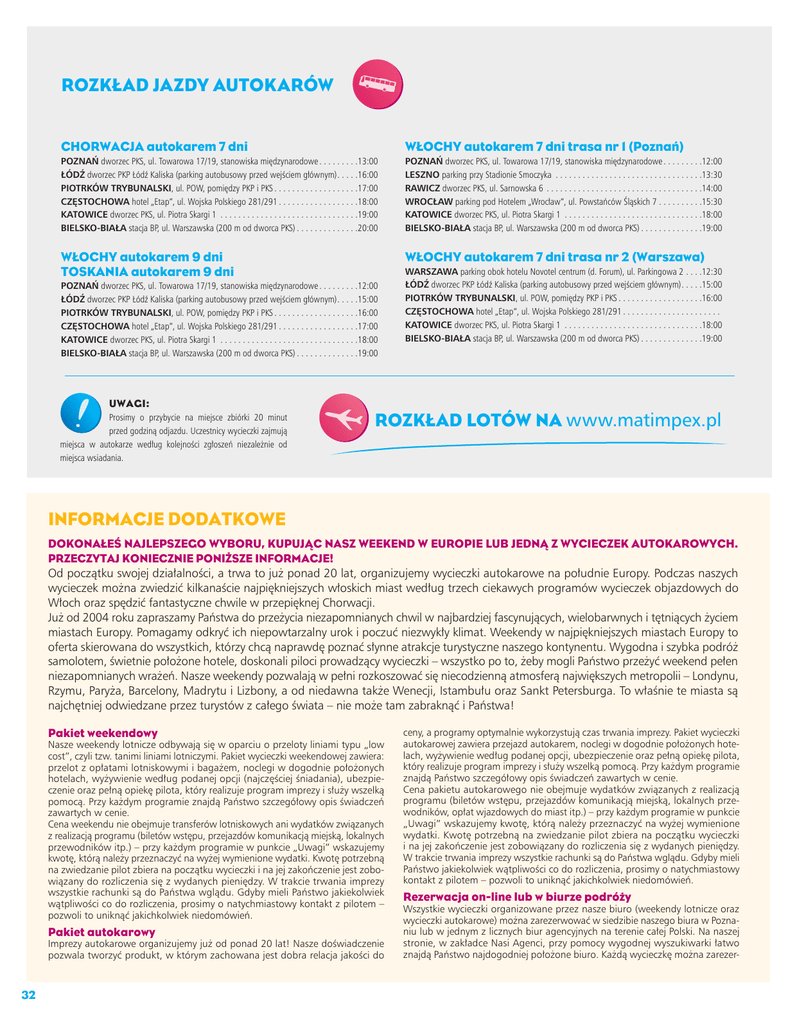 ROZKŁAD JAZDY AUTOKARÓW Chorwacja autokarem 7 dni Poznań dworzec PKS, ul. Towarowa 17/19, stanowiska międzynarodowe . . . . . . . . Łódź dworzec PKP Łódź Kaliska (parking autobusowy przed wejściem głównym) . . . . Piotrków Trybunalski, ul. POW, pomiędzy PKP i PKS . . . . . . . . . . . . . . . . . . Częstochowa hotel „Etap”, ul. Wojska Polskiego 281/291 . . . . . . . . . . . . . . . . . Katowice dworzec PKS, ul. Piotra Skargi 1 . . . . . . . . . . . . . . . . . . . . . . . . . . . . . . . Bielsko-Biała stacja BP, ul. Warszawska (200 m od dworca PKS) . . . . . . . . . . . . . Włochy autokarem 7 dni trasa nr 1 (Poznań) 13:00 16:00 17:00 18:00 19:00 20:00 Włochy autokarem 9 dni Toskania autokarem 9 dni Poznań dworzec PKS, ul. Towarowa 17/19, stanowiska międzynarodowe . . . . . . . . Łódź dworzec PKP Łódź Kaliska (parking autobusowy przed wejściem głównym) . . . . Piotrków Trybunalski, ul. POW, pomiędzy PKP i PKS . . . . . . . . . . . . . . . . . . Częstochowa hotel „Etap”, ul. Wojska Polskiego 281/291 . . . . . . . . . . . . . . . . . Katowice dworzec PKS, ul. Piotra Skargi 1 . . . . . . . . . . . . . . . . . . . . . . . . . . . . . . . Bielsko-Biała stacja BP, ul. Warszawska (200 m od dworca PKS) . . . . . . . . . . . . . UWAGI: Prosimy o przybycie na miejsce zbiórki 20 minut przed godziną odjazdu. Uczestnicy wycieczki zajmują miejsca w autokarze według kolejności zgłoszeń niezależnie od miejsca wsiadania. Poznań dworzec PKS, ul. Towarowa 17/19, stanowiska międzynarodowe . . . . . . . . 12:00 Leszno parking przy Stadionie Smoczyka . . . . . . . . . . . . . . . . . . . . . . . . . . . . . . . . . 13:30 Rawicz dworzec PKS, ul. Sarnowska 6 . . . . . . . . . . . . . . . . . . . . . . . . . . . . . . . . . . . 14:00 Wrocław parking pod Hotelem „Wrocław”, ul. Powstańców Śląskich 7 . . . . . . . . . .15:30 Katowice dworzec PKS, ul. Piotra Skargi 1 . . . . . . . . . . . . . . . . . . . . . . . . . . . . . . . 18:00 Bielsko-Biała stacja BP, ul. Warszawska (200 m od dworca PKS) . . . . . . . . . . . . . 19:00 Włochy autokarem 7 dni trasa nr 2 (Warszawa) 12:00 15:00 16:00 17:00 18:00 19:00 Warszawa parking obok hotelu Novotel centrum (d. Forum), ul. Parkingowa 2 . . . . 12:30 Łódź dworzec PKP Łódź Kaliska (parking autobusowy przed wejściem głównym) . . . . 15:00 Piotrków Trybunalski, ul. POW, pomiędzy PKP i PKS . . . . . . . . . . . . . . . . . . 16:00 Częstochowa hotel „Etap”, ul. Wojska Polskiego 281/291 . . . . . . . . . . . . . . . . . . . . . . Katowice dworzec PKS, ul. Piotra Skargi 1 . . . . . . . . . . . . . . . . . . . . . . . . . . . . . . . 18:00 Bielsko-Biała stacja BP, ul. Warszawska (200 m od dworca PKS) . . . . . . . . . . . . . 19:00 ROZKŁAD LOTÓW NA www.matimpex.pl INFORMACJE DODATKOWE Dokonałeś najlepszego wyboru, kupując nasz weekend w Europie lub jedną z wycieczek autokarowych. przeczytaj koniecznie poniższe informacje! Od początku swojej działalności, a trwa to już ponad 20 lat, organizujemy wycieczki autokarowe na południe Europy. Podczas naszych wycieczek można zwiedzić kilkanaście najpiękniejszych włoskich miast według trzech ciekawych programów wycieczek objazdowych do Włoch oraz spędzić fantastyczne chwile w przepięknej Chorwacji. Już od 2004 roku zapraszamy Państwa do przeżycia niezapomnianych chwil w najbardziej fascynujących, wielobarwnych i tętniących życiem miastach Europy. Pomagamy odkryć ich niepowtarzalny urok i poczuć niezwykły klimat. Weekendy w najpiękniejszych miastach Europy to oferta skierowana do wszystkich, którzy chcą naprawdę poznać słynne atrakcje turystyczne naszego kontynentu. Wygodna i szybka podróż samolotem, świetnie położone hotele, doskonali piloci prowadzący wycieczki – wszystko po to, żeby mogli Państwo przeżyć weekend pełen niezapomnianych wrażeń. Nasze weekendy pozwalają w pełni rozkoszować się niecodzienną atmosferą największych metropolii – Londynu, Rzymu, Paryża, Barcelony, Madrytu i Lizbony, a od niedawna także Wenecji, Istambułu oraz Sankt Petersburga. To właśnie te miasta są najchętniej odwiedzane przez turystów z całego świata – nie może tam zabraknąć i Państwa! Pakiet weekendowy Nasze weekendy lotnicze odbywają się w oparciu o przeloty liniami typu „low cost”, czyli tzw. tanimi liniami lotniczymi. Pakiet wycieczki weekendowej zawiera: przelot z opłatami lotniskowymi i bagażem, noclegi w dogodnie położonych hotelach, wyżywienie według podanej opcji (najczęściej śniadania), ubezpieczenie oraz pełną opiekę pilota, który realizuje program imprezy i służy wszelką pomocą. Przy każdym programie znajdą Państwo szczegółowy opis świadczeń zawartych w cenie. Cena weekendu nie obejmuje transferów lotniskowych ani wydatków związanych z realizacją programu (biletów wstępu, przejazdów komunikacją miejską, lokalnych przewodników itp.) – przy każdym programie w punkcie „Uwagi” wskazujemy kwotę, którą należy przeznaczyć na wyżej wymienione wydatki. Kwotę potrzebną na zwiedzanie pilot zbiera na początku wycieczki i na jej zakończenie jest zobowiązany do rozliczenia się z wydanych pieniędzy. W trakcie trwania imprezy wszystkie rachunki są do Państwa wglądu. Gdyby mieli Państwo jakiekolwiek wątpliwości co do rozliczenia, prosimy o natychmiastowy kontakt z pilotem – pozwoli to uniknąć jakichkolwiek niedomówień. Pakiet autokarowy Imprezy autokarowe organizujemy już od ponad 20 lat! Nasze doświadczenie pozwala tworzyć produkt, w którym zachowana jest dobra relacja jakości do 32 ceny, a programy optymalnie wykorzystują czas trwania imprezy. Pakiet wycieczki autokarowej zawiera przejazd autokarem, noclegi w dogodnie położonych hotelach, wyżywienie według podanej opcji, ubezpieczenie oraz pełną opiekę pilota, który realizuje program imprezy i służy wszelką pomocą. Przy każdym programie znajdą Państwo szczegółowy o