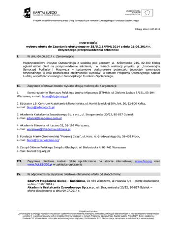 Projekt współfinansowany przez Unię Europejską w ramach Europejskiego Funduszu Społecznego Elbląg, dnia 11.07.2014 PROTOKÓŁ wyboru oferty do Zapytania ofertowego nr 35/5.2.1/PiM/2014 z dnia 25.06.2014 r. dotyczącego przeprowadzenia szkolenia: I. W dniu 04.06.2014 r. Zamawiający: Międzynarodowy Instytut Outsourcingu z siedzibą pod adresem ul. Królewiecka 215, 82-300 Elbląg ogłosił nabór ofert na przeprowadzenie szkolenia, w ramach realizacji projektu pt. „Innowacyjny Samorząd Podlasia i Mazowsza – systemowe doskonalenie potencjału jednostek samorządu terytorialnego w celu podniesienia efektywności wyników” w ramach Programu Operacyjnego Kapitał Ludzki, współfinansowanego z Europejskiego Funduszu Społecznego. II. Zapytanie ofertowe zostało wysłane drogą mailową do 4 organizacji: 1. Stowarzyszenie Tłumaczy Polskiego Języka Migowego (STPJM), ul. Zielone Zacisze 3/151, 03-294 Warszawa, e-mail: [email protected] 2. Educator L.B. Centrum Kształcenia Liliana Kaleta, ul. Hanki Sawickiej 50A, lok. 20, 62-800 Kalisz, e-mail: [email protected] 3. Akademia Kształcenia Zawodowego Sp. z o.o., ul. Straganiarska 20/22, 80-837 Gdańsk e-mail: [email protected] 4. Akademia Zdrowia, ul. Leszno 21, 01-199 Warszawa, e-mail: [email protected] 5. Fundacja Marty Chojnowskiej "Przerwij Ciszę", ul. Harc. A. Gradowskiego 3a, 09-402 Płock, e-mail: [email protected]' 6. Zarząd Główny Polskiego Związku Głuchych, ul. Białostocka 4, 03-741 Warszawa e-mail: [email protected] III. Zapytanie ofertowe zostało także upublicznione na stronie internetowej www.fioi.org oraz www.fioi.82-300.pl w zakładce ogłoszenia IV. W odpowiedzi na zapytanie ofertowe otrzymano oferty od dwóch firmy: EduPJM Magdalena Bielak – Kościńska, 03-984 Warszawa, ul Pisarska 4/6 – ofertę dostarczono w dniu 10.07.2014 r. Akademia Kształcenia Zawodowego Sp.z.o.o., ul. Stragarniarska 20/22, 80-837 Gdańsk – ofertę dostarczono w dniu 09.07.2014 r. Projekt pod tytułem „Innowacyjny Samorząd Podlasia i Mazowsza– systemowe doskonalenie potencjału jednostek samorządu terytorialnego w celu podniesienia efektywności wyników”, współfinansowany jest ze środków Unii Europejskiej w ramach Programu Operacyjnego Kapitał Ludzki, Priorytet V. Dobre rządzenie, Działanie 5.2 Wzmocnienie potencjału administracji samorządowej, Poddziałanie 5.2.1 Modernizacja zarządzania w administracji samorządowej. Projekt współfinansowany przez Unię Europejską w ramach Europejskiego Funduszu Społecznego V. Ocena ofert 1. Ocena ofert została dokonana zgodnie z kryteriami opisanymi w sekcji II.5 zapytania ofertowego: 1) Cena oferty na poszczególne tematy szkoleniowe - punkty przyznawane są za cenę i obliczane są w sposób następujący: Najniższa oferowana cena _______________________________ X100 Cena Oferenta 2) doświadczenie w prowadzeniu szkoleń dla JST, zgodnych z tematyką zapytania ofertowego – kryterium to będzie oceniane na podstawie przedstawionych dokumentów potwierdzających prawidłowe wykonanie usługi na rzecz pracowników Jednostek Samorządu Terytorialnego, w sposób następujący: 1-5 dokumentów – 5 pkt 6-10 dokumentów – 10 pkt 11-15 dokumentów – 15 pkt 16-20 dokumentów – 20 pkt 21 i więcej dokumentów – 30 pkt 3) doświadczenie wykładowcy wyznaczonego do przeprowadzenia szkolenia. W ramach tego kryterium będą przyznawane punkty od 0 do 10, według zasady: a) wykazanie doświadczenia w przeprowadzeniu szkoleń w zakresie zgodnym z tematyką szkolenia w ilości poniżej 40 godzin – 0 pkt. b) wykazanie doświadczenia w przeprowadzeniu szkoleń w zakresie zgodnym z tematyką szkolenia w ilości 41 – 80 godzin– 5 pkt. c) wykazanie doświadczenia w przeprowadzeniu szkoleń w zakresie zgodnym z tematyką szkolenia Postępowania w ilości powyżej 81– 10 pkt. 4) Maksymalna ilość punktów możliwych uzyskania dla każdego tematu szkolenia wynosi 140. VI. Wybór ofert Nazwa Firmy EduPJM Magdalena Bielak-Kościńska Akademia Kształcenia Zawodowego Sp.z.o.o. Doświadczenie w prowadzeniu szkoleń dla jednostek samorządu terytorialnego, zgodnych z tematyką zapytania ofertowego. Cena cena oferty punkty ilość usług punkty 32 970 100 1 5 38 600 zł 85,42 1 5 Doświadczenie wykładowcy wyznaczonego do przeprowadzenia szkolenia Punkty razem punkty 10 115 10 100,42 W wyniku przeprowadzonej oceny za najkorzystniejszą ofertę uznaje się ofertę firmy EduPJM Magdalena Bielak – Kościńska, 03-984 Warszawa, ul Pisarska 4/6 Projekt pod tytułem „Innowacyjny Samorząd Podlasia i Mazowsza– systemowe doskonalenie potencjału jednostek samorządu terytorialnego w celu podniesienia efektywności wyników”, współfinansowany jest ze środków Unii Europejskiej w ramach Programu Operacyjnego Kapitał Ludzki, Priorytet V. Dobre rządzenie, Działanie 5.2 Wzmocnienie potencjału administracji samorządowej, Poddziałanie 5.2.1 Modernizacja zarządzania w administracji samorządowej.
