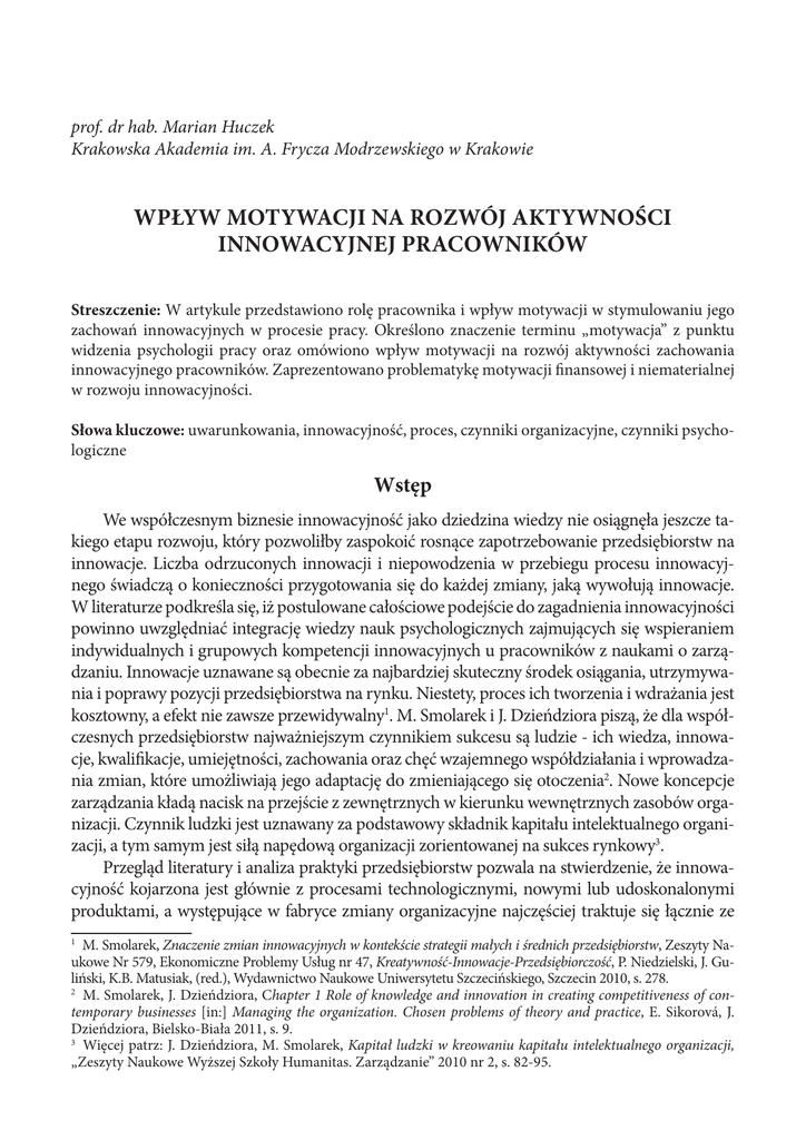 prof. dr hab. Marian Huczek Krakowska Akademia im. A. Frycza Modrzewskiego w Krakowie WPŁYW MOTYWACJI NA ROZWÓJ AKTYWNOŚCI INNOWACYJNEJ PRACOWNIKÓW Streszczenie: W artykule przedstawiono rolę pracownika i wpływ motywacji w stymulowaniu jego zachowań innowacyjnych w procesie pracy. Określono znaczenie terminu „motywacja” z punktu widzenia psychologii pracy oraz omówiono wpływ motywacji na rozwój aktywności zachowania innowacyjnego pracowników. Zaprezentowano problematykę motywacji finansowej i niematerialnej w rozwoju innowacyjności. Słowa kluczowe: uwarunkowania, innowacyjność, proces, czynniki organizacyjne, czynniki psychologiczne Wstęp We współczesnym biznesie innowacyjność jako dziedzina wiedzy nie osiągnęła jeszcze takiego etapu rozwoju, który pozwoliłby zaspokoić rosnące zapotrzebowanie przedsiębiorstw na innowacje. Liczba odrzuconych innowacji i niepowodzenia w przebiegu procesu innowacyjnego świadczą o konieczności przygotowania się do każdej zmiany, jaką wywołują innowacje. W literaturze podkreśla się, iż postulowane całościowe podejście do zagadnienia innowacyjności powinno uwzględniać integrację wiedzy nauk psychologicznych zajmujących się wspieraniem indywidualnych i grupowych kompetencji innowacyjnych u pracowników z naukami o zarządzaniu. Innowacje uznawane są obecnie za najbardziej skuteczny środek osiągania, utrzymywania i poprawy pozycji przedsiębiorstwa na rynku. Niestety, proces ich tworzenia i wdrażania jest kosztowny, a efekt nie zawsze przewidywalny1. M. Smolarek i J. Dzieńdziora piszą, że dla współczesnych przedsiębiorstw najważniejszym czynnikiem sukcesu są ludzie - ich wiedza, innowacje, kwalifikacje, umiejętności, zachowania oraz chęć wzajemnego współdziałania i wprowadzania zmian, które umożliwiają jego adaptację do zmieniającego się otoczenia2. Nowe koncepcje zarządzania kładą nacisk na przejście z zewnętrznych w kierunku wewnętrznych zasobów organizacji. Czynnik ludzki jest uznawany za podstawowy składnik kapitału intelektualnego organizacji, a tym samym jest siłą napędową organizacji zorientowanej na sukces rynkowy3. Przegląd literatury i analiza praktyki przedsiębiorstw pozwala na stwierdzenie, że innowacyjność kojarzona jest głównie z procesami technologicznymi, nowymi lub udoskonalonymi produktami, a występujące w fabryce zmiany organizacyjne najczęściej traktuje się łącznie ze 1 M. Smolarek, Znaczenie zmian innowacyjnych w kontekście strategii małych i średnich przedsiębiorstw, Zeszyty Naukowe Nr 579, Ekonomiczne Problemy Usług nr 47, Kreatywność-Innowacje-Przedsiębiorczość, P. Niedzielski, J. Guliński, K.B. Matusiak, (red.), Wydawnictwo Naukowe Uniwersytetu Szczecińskiego, Szczecin 2010, s. 278. 2 M. Smolarek, J. Dzieńdziora, Chapter 1 Role of knowledge and innovation in creating competitiveness of contemporary businesses [in:] Managing the organization. Chosen problems of theory and practice, E. Sikorová, J. Dzieńdziora, Bielsko-Biała 2011, s. 9. 3 Więcej patrz: J. Dzieńdziora, M. Smolarek, Kapitał ludzki w kreowaniu kapitału intelektualnego organizacji, „Zeszyty Naukowe Wyższej Szkoły Humanitas. Zarządzanie” 2010 nr 2, s. 82-95. 32 Zeszyty Naukowe Wyższej Szkoły Humanitas. Zarządzanie zmianami w technice. Nie docenia się w procesach zachodzących w przedsiębiorstwie roli człowieka i jego możliwości oraz ograniczeń natury psychologicznej. S. Borkowska pisze, że „nie jest natomiast zrozumiałe niedocenianie roli czynników miękkich, czyli zasobów ludzkich. Powszechnym wręcz zjawiskiem jest marnotrawienie ich wiedzy, kreatywności, otwartości na zmiany, zdolności ciągłego uczenia się, otwartej komunikacji i współpracy zespołowej […]. Wobec niedostatku zasobów rzeczowych i finansowych tym większe znaczenie ma mądre spożytkowanie zasobów ludzkich w rozwoju innowacyjności”4. A. Wojtczuk-Turek podkreśla ważność związku innowacyjności przedsiębiorstwa z czynnikami psychologicznymi, do których m.in. należą: cechy osobowości, kapitał psychologiczny, wiedza, kompetencje osobiste oraz motywacja i zaangażowanie innowacyjne5. Czynniki te silnie oddziaływają na aktywność innowacyjną pracowników w przedsiębiorstwie. Zachowania o charakterze twórczym prowadzące do powstawania innowacji będą efektem synergii poszczególnych czynników psychologicznych, które ujawniać się będą w kontekście organizacyjnym. Duże znaczenie w rozwoju aktywności zawodowej pracownika ma jego kapitał psychologiczny, którego charakteryzują przekonania o własnej skuteczności działania, optymizm, nadzieja oraz odporność psychiczna. Przekonanie o skuteczności spełnia funkcję samoregulacji podejmowanych działań i ma związek z utrzymaniem motywacji do ich wykonania oraz przyczynia się do wydajności pracownika. Natomiast optymizm pozwala na budowanie wiary we własny sukces obecnie i w przyszłości. Nadzieja pozwala na budowanie wiary we własne zdolności radzenia sobie z wyzwaniami, jednak w oparciu o realizm. Przyszłość jest dla jednostki głównym obszarem motywacyjnym i to właśnie perspektywa przyszłości stwarza przestrzeń dla ujawniania się zarówno optymizmu, jak i nadziei. Odporność psychiczna jest zdolnością powrotu do stanu równowagi („dojścia do siebie”) po doświadczonych przeciwnościach losu, porażkach, kryzysach, lub nawet po pozytywnych wydarzeniach. Z punktu widzenia stymulowania zachowań innowacyjnych u pracowników bardzo istotna jest znajomość specyfiki czynników, które motywują do podejmowania i realizowania zachowań o charakterze twórczym. System motywacyjny ma podstawowe znaczenie we wzbudzaniu zachowań innowacyjnych; spełnia swoją rolę wówczas, gdy zawiera różnorodne narzędzia i jest elastyczny. 1. Istota motywowania Motywowanie pracowników należy do głównego obszaru zarządzania zasobami ludzkimi. Wiedza dotycząca system
