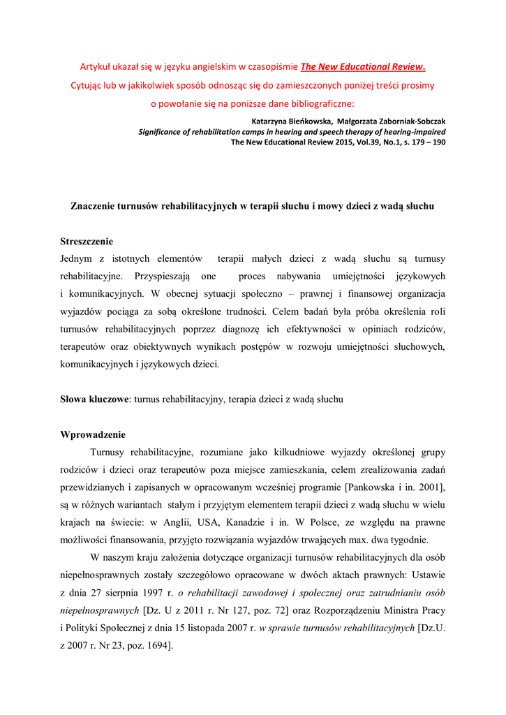 Artykuł ukazał się w języku angielskim w czasopiśmie The New Educational Review. Cytując lub w jakikolwiek sposób odnosząc się do zamieszczonych poniżej treści prosimy o powołanie się na poniższe dane bibliograficzne: Katarzyna Bieńkowska, Małgorzata Zaborniak-Sobczak Significance of rehabilitation camps in hearing and speech therapy of hearing-impaired The New Educational Review 2015, Vol.39, No.1, s. 179 – 190 Znaczenie turnusów rehabilitacyjnych w terapii słuchu i mowy dzieci z wadą słuchu Streszczenie Jednym z istotnych elementów rehabilitacyjne. Przyspieszają terapii małych dzieci z wadą słuchu są turnusy one proces nabywania umiejętności językowych i komunikacyjnych. W obecnej sytuacji społeczno – prawnej i finansowej organizacja wyjazdów pociąga za sobą określone trudności. Celem badań była próba określenia roli turnusów rehabilitacyjnych poprzez diagnozę ich efektywności w opiniach rodziców, terapeutów oraz obiektywnych wynikach postępów w rozwoju umiejętności słuchowych, komunikacyjnych i językowych dzieci. Słowa kluczowe: turnus rehabilitacyjny, terapia dzieci z wadą słuchu Wprowadzenie Turnusy rehabilitacyjne, rozumiane jako kilkudniowe wyjazdy określonej grupy rodziców i dzieci oraz terapeutów poza miejsce zamieszkania, celem zrealizowania zadań przewidzianych i zapisanych w opracowanym wcześniej programie [Pankowska i in. 2001], są w różnych wariantach stałym i przyjętym elementem terapii dzieci z wadą słuchu w wielu krajach na świecie: w Anglii, USA, Kanadzie i in. W Polsce, ze względu na prawne możliwości finansowania, przyjęto rozwiązania wyjazdów trwających max. dwa tygodnie. W naszym kraju założenia dotyczące organizacji turnusów rehabilitacyjnych dla osób niepełnosprawnych zostały szczegółowo opracowane w dwóch aktach prawnych: Ustawie z dnia 27 sierpnia 1997 r. o rehabilitacji zawodowej i społecznej oraz zatrudnianiu osób niepełnosprawnych [Dz. U z 2011 r. Nr 127, poz. 72] oraz Rozporządzeniu Ministra Pracy i Polityki Społecznej z dnia 15 listopada 2007 r. w sprawie turnusów rehabilitacyjnych [Dz.U. z 2007 r. Nr 23, poz. 1694]. Szczegółowe, praktyczne informacje na temat organizacji turnusów rehabilitacyjnych dla dzieci i młodzieży z wadą słuchu: ich cele, sugestie dotyczące optymalnej liczby uczestników, ich kwalifikacji, doboru kadry, programu oraz metod pracy, a także wyboru miejsca, odnaleźć można w opracowaniu Pankowskiej, Kosmalowej i Szuchnik [2001]. Ideą turnusów rehabilitacyjnych dla dzieci z wadą słuchu jest kształtowanie otoczenia w taki sposób, by skutecznie można było trenować umiejętności słuchowe, komunikacyjne i językowe. W trakcie terapii szczególny nacisk jest kładziony na uspołecznianie, budowanie relacji w grupie, organizację aktywnego i efektywnego czasu wolnego oraz poznanie indywidualnych możliwości słuchowych. Ciągłość i powtarzalność doświadczeń komunikacyjnych w wyniku odpowiedzi na proces uczenia się i zapamiętywania oraz adaptację organizmu do nowych warunków środowiska pozwala na szybsze tworzenie nowych połączeń w tkance nerwowej. Wykorzystanie procesów adaptacyjnych i wysokiej sprawność neuroplastycznej do siódmego roku życia umożliwia nabywanie i kodowanie na stałe kluczowych umiejętności. Ilość, jakość i rodzaj bodźców (wzrokowych, czuciowych, smakowych, słuchowych, komunikacyjnych i in) ma kluczowe znaczenie dla wytworzenia właściwej odpowiedzi zapisanej w mózgu m.in języka [m. in. Flexer 2011]. Ważnym aspektem turnusów rehabilitacyjnych jest aktywny udział rodziców lub opiekunów dziecka [Pankowska i in. 2001]. Podczas turnusu mają oni możliwość obserwacji zajęć prowadzonych przez terapeutów oraz poszerzania zakresu umiejętności, pozwalających na rozwijanie języka u dzieci. Opiekunowie otrzymują specjalistyczne wsparcie psychologiczno-pedagogiczne, w formie konsultacji indywidualnych lub grup wsparcia 1. Finansowanie Środki przeznaczone na organizację turnusów rehabilitacyjnych pochodzą między innymi z Państwowego Funduszu Rehabilitacji Osób Niepełnosprawnych [www.pfron.org.pl]. Nie bez znaczenia pozostaje jednak rola finansująca organizacji pozarządowych, takich jak Fundacja Polsat, Fundacja TVN, Fundacja Orange, i in.. W ramach działalności własnej organizacje pozarządowe pozyskują także środki na turnusy z innych źródeł m.in. funduszy unijnych. Szacunkowo w 2014 roku fundusze niezbędne do pokrycia realnych kosztów dla dziecka i jednego opiekuna wahały się w granicach od 3700 zł do 4500 zł (880 – 1070 Euro). Koszty ponoszone przez poszczególne rodziny zależą od możliwości pozyskania sponsorów 1 Jest to obecnie ważny aspekt szeroko rozumianej rehabilitacji dzieci, młodzieży i osób dorosłych z głębokimi uszkodzeniami narządu słuchu. Należy rozważyć indywidualne potrzeby opiekunów w zależności od wieku dzieci, głębokości ich ubytku słuchu, stopnia oswojenia z niepełnosprawnością dziecka i in. Np. w turnusach uczestniczą także osoby niesłyszące, które rehabilitują swoje niesłyszące dzieci. Należy modyfikować odpowiednio zasoby kadrowe (przykładowo zatrudniając tłumacza języka migowego). przez organizatora oraz możliwości finansowych rodziny. Istnieją możliwości wyjazdu bezpłatnego (Fundacja Orange) lub pozyskania indywidualnego dofinasowania (np. ze środków PFRON i in.), wiele rodzin pokrywa jednak koszty w całości samodzielnie. W Polsce organizatorami turnusów dla dzieci i młodzieży z wadą słuchu odbywających się najczęściej w okresie wakacyjnym, w roku 2014, były między innymi: Fundacja Orange, Instytut Głuchoniemych w Warszawie oraz warszawskie Stowarzyszenie Rodziców i Przyjaciół Dzieci i Młodzieży z Wadą Słuchu „Usłyszeć świat”, Polska Fundacja Pomocy Dzieciom Niedosłyszącym ECHO, wrocławski ośrodek Orator i krośnieńskie Stowarzyszenie Rodziców 