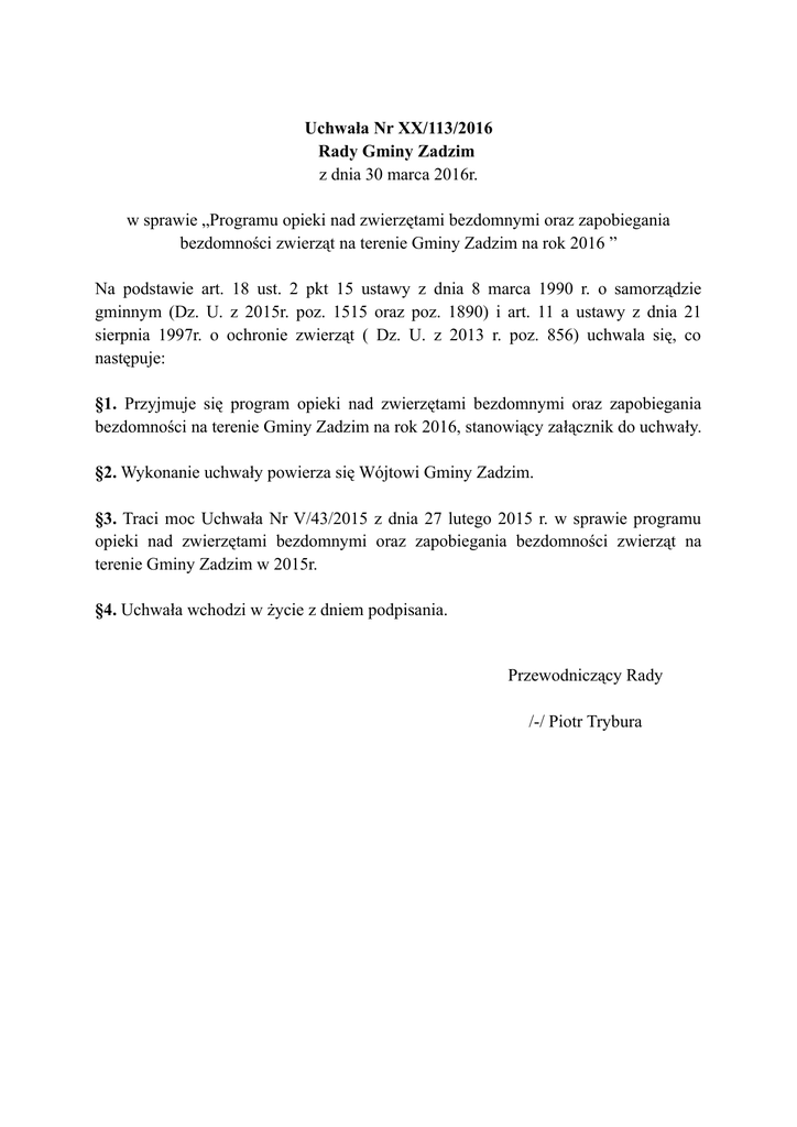 Uchwała Nr XX/113/2016 Rady Gminy Zadzim z dnia 30 marca 2016r. w sprawie „Programu opieki nad zwierzętami bezdomnymi oraz zapobiegania bezdomności zwierząt na terenie Gminy Zadzim na rok 2016 ” Na podstawie art. 18 ust. 2 pkt 15 ustawy z dnia 8 marca 1990 r. o samorządzie gminnym (Dz. U. z 2015r. poz. 1515 oraz poz. 1890) i art. 11 a ustawy z dnia 21 sierpnia 1997r. o ochronie zwierząt ( Dz. U. z 2013 r. poz. 856) uchwala się, co następuje: §1. Przyjmuje się program opieki nad zwierzętami bezdomnymi oraz zapobiegania bezdomności na terenie Gminy Zadzim na rok 2016, stanowiący załącznik do uchwały. §2. Wykonanie uchwały powierza się Wójtowi Gminy Zadzim. §3. Traci moc Uchwała Nr V/43/2015 z dnia 27 lutego 2015 r. w sprawie programu opieki nad zwierzętami bezdomnymi oraz zapobiegania bezdomności zwierząt na terenie Gminy Zadzim w 2015r. §4. Uchwała wchodzi w życie z dniem podpisania. Przewodniczący Rady /-/ Piotr Trybura Program opieki nad zwierzętami bezdomnymi na terenie Gminy Zadzim Załącznik do uchwały nr XX/113/2016 Rady Gminy Zadzim z dnia 30 marca 2016 r. PROGRAM OPIEKI NAD ZWIERZĘTAMI BEZDOMNYMI ORAZ ZAPOBIEGANIA BEZDOMNOŚCI ZWIERZĄT NA TERENIE GMINY ZADZIM NA ROK 2016 Gmina Zadzim 1 Program opieki nad zwierzętami bezdomnymi na terenie Gminy Zadzim SPIS TREŚCI 1.PRZEDMIOT OPRACOWANIA.....................................................................................................................3 2.ZAKRES PROGRAMU.................................................................................................................................3 3.CEL PROGRAMU........................................................................................................................................4 4.PODSTAWA PRAWNA................................................................................................................................5 5.ODPOWIEDZIALNOŚĆ ZA DZIAŁANIA ZWIĄZANE Z REALIZACJĄ PROGRAMU............................................6 6.WYJAŚNIENIA............................................................................................................................................6 7.DZIAŁANIA DOTYCZĄCE ZAPOBIEGANIA BEZDOMNOŚCI ZWIERZĄT.........................................................7 9)OPIEKA NAD WOLNO ŻYJĄCYMI KOTAMI..................................................................................................9 10)ODŁAWIANIE BEZDOMNYCH ZWIERZĄT I ICH OBLIGATORYJNA STERYLIZACJA LUB KASTRACJA...........10 11)EDUKACJA.............................................................................................................................................10 5)ZAPEWNIENIE MIEJSCA DLA ZWIERZĄT GOSPODARSKICH......................................................................11 6)ZAPEWNIENIE CAŁODOBOWEJ OPIEKI WETERYNARYJNEJ W PRZYPADKU ZDARZEŃ DROGOWYCH.......12 7)FINANSOWANIE PROGRAMU.................................................................................................................12 2 Program opieki nad zwierzętami bezdomnymi na terenie Gminy Zadzim 1. PRZEDMIOT OPRACOWANIA §1 Przedmiotem niniejszego opracowania jest „Program opieki nad zwierzętami bezdomnymi oraz zapobiegania bezdomności zwierząt na terenie Gminy Zadzim na rok 2016”. 2. ZAKRES PROGRAMU §2 Zakres niniejszego programu odpowiada art. 11a ust.2 ustawy z dnia 21 sierpnia 1997 r. o ochronie zwierząt ( Dz.U. z 2013r. poz. 856 z późń. zm. ). W związku z powyższym obejmuje on: 1) zapewnienie bezdomnym zwierzętom z terenu Gminy Zadzim miejsca w schronisku dla zwierząt; 2) opiekę nad wolno żyjącymi kotami, w tym ich dokarmianie; 3) zapewnienie bezpieczeństwa mieszkańcom Gminy poprzez odławianie bezdomnych zwierząt 4) zmniejszenie populacji bezdomnych zwierząt poprzez: a) obligatoryjną sterylizację czy też kastrację zwierząt w schronisku dla zwierząt, b) poszukiwanie właścicieli dla bezdomnych zwierząt, c) usypianie ślepych miotów; 5) wskazanie gospodarstwa rolnego w celu zapewnienia miejsca dla zwierząt gospodarskich 6) zapewnienie całodobowej opieki weterynaryjnej w przypadkach zdarzeń drogowych z udziałem zwierząt. 3. CEL PROGRAMU §3 Celem programu „Program opieki nad zwierzętami bezdomnymi oraz zapobiegania bezdomności zwierząt na terenie Gminy Zadzim” jest zapewnienie opieki bezdomnym zwierzętom z terenu Gminy. Zadanie to będzie realizowane poprzez: 1) Zapewnienie bezdomnym zwierzętom opieki; 2) Zmniejszenie populacji bezdomnych zwierząt; 3) Zwiększenie liczby adopcji zwierząt domowych; 3 Program opieki nad zwierzętami bezdomnymi na terenie Gminy Zadzim 4) Edukację mieszkańców na temat humanitarnego traktowania zwierząt i obowiązków spoczywających na właścicielach psów i kotów 5) Promowanie prawidłowych postaw i zachowań człowieka w stosunku do zwierząt §4 W rozumieniu art. 4 pkt. 17 ustawy z dnia 21 sierpnia 1997 r. o ochronie zwierząt ( Dz. U. z 2013 r. poz. 856 z późń. zm. ) „zwierzęta domowe” to „zwierzęta tradycyjnie przebywające wraz z człowiekiem w jego domu lub innym odpowiednim pomieszczeniu, utrzymywane przez człowieka w charakterze towarzysza”. Program ma zastosowanie do zwierząt domowych w szczególności psów i kotów, w tym kotów wolno żyjących czy zwierząt gospodarskich. §5 Większość działań określonych w niniejszym Programie dotyczy psów i kotów znajdujących się na terenie Gminy Zadzim, ponieważ skala bezdomności tych zwierząt jest niezwykle ważna oraz szczególnie zauważalna w kontekście zmagań z ww. problemem w skali całego kraju. Niemniej jednak w przypadku innego zwierzęcia bezdomnego, należy postępować analogicznie jak w sposób opisany w Programie dla bezdomnych psów i kotów lecz odpowiednio dla danego zwierzęcia. §6 Opieka nad bezdomnymi zwierzętami na terenie Gminy Zadzim obejmować będzie w szczególności współdziałanie z wybranym Schroniskiem poprzez wyłapywanie bezdom