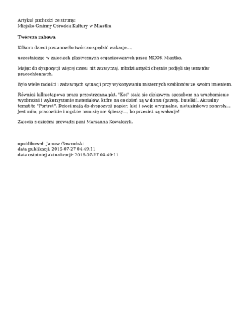Artykuł pochodzi ze strony: Miejsko-Gminny Ośrodek Kultury w Miastku Twórcza zabawa Kilkoro dzieci postanowiło twórczo spędzić wakacje..., uczestnicząc w zajęciach plastycznych organizowanych przez MGOK Miastko. Mając do dyspozycji więcej czasu niż zazwyczaj, młodzi artyści chętnie podjęli się tematów pracochłonnych. Było wiele radości i zabawnych sytuacji przy wykonywaniu misternych szablonów ze swoim imieniem. Również kilkuetapowa praca przestrzenna pkt. "Kot" stała się ciekawym sposobem na uruchomienie wyobraźni i wykorzystanie materiałów, które na co dzień są w domu (gazety, butelki). Aktualny temat to "Portret". Dzieci mają do dyspozycji papier, klej i swoje oryginalne, nietuzinkowe pomysły... Jest miło, pracowicie i nigdzie nam się nie śpieszy..., bo przecież są wakacje! Zajęcia z dziećmi prowadzi pani Marzanna Kowalczyk. opublikował: Janusz Gawroński data publikacji: 2016-07-27 04:49:11 data ostatniej aktualizacji: 2016-07-27 04:49:11