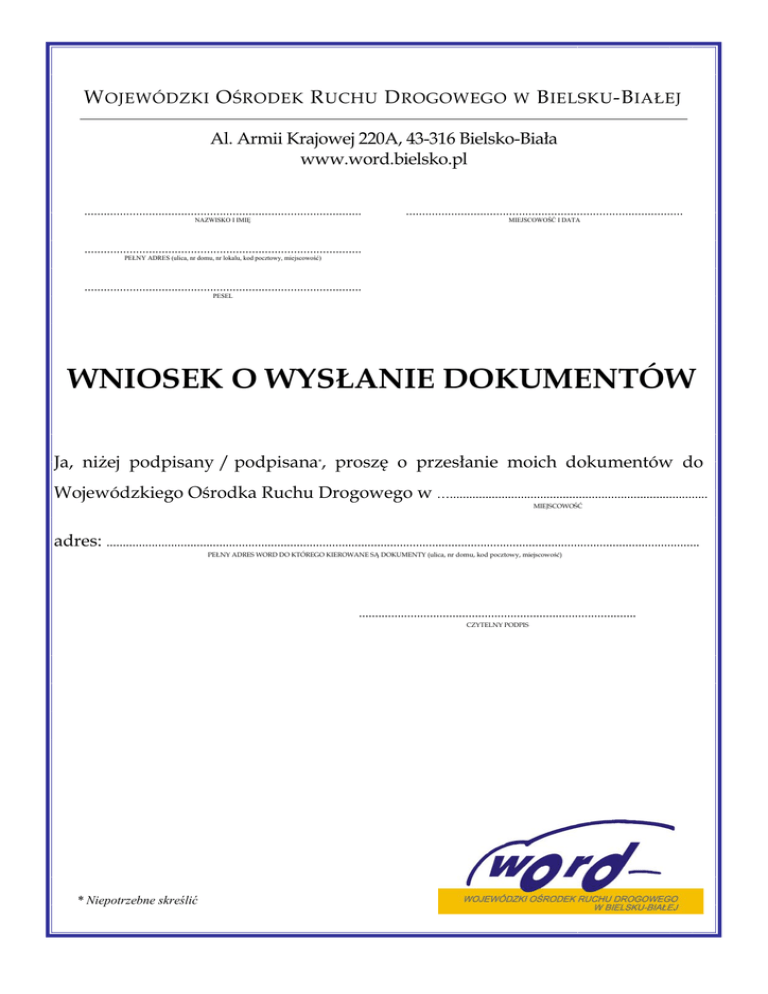 W OJEWÓDZKI O ŚRODEK R UCHU D ROGOWEGO W B IELSKU -B IAŁEJ Al. Armii Krajowej 220A, 43-316 Bielsko-Biała www.word.bielsko.pl ...................................................................................... NAZWISKO I IMIĘ ...................................................................................... MIEJSCOWOŚĆ I DATA ...................................................................................... PEŁNY ADRES (ulica, nr domu, nr lokalu, kod pocztowy, miejscowość) ...................................................................................... PESEL WNIOSEK O WYSŁANIE DOKUMENTÓW Ja, niżej podpisany / podpisana*, proszę o przesłanie moich dokumentów do Wojewódzkiego Ośrodka Ruchu Drogowego w …................................................................................ MIEJSCOWOŚĆ adres: ........................................................................................................................................................................................ PEŁNY ADRES WORD DO KTÓREGO KIEROWANE SĄ DOKUMENTY (ulica, nr domu, kod pocztowy, miejscowość) ...................................................................................... CZYTELNY PODPIS * Niepotrzebne skreślić