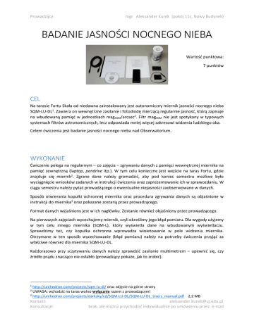 Prowadzący: mgr Aleksander Kurek (pokój 11c, Nowy Budynek) BADANIE JASNOŚCI NOCNEGO NIEBA Wartość punktowa: 7 punktów CEL Na tarasie Fortu Skała od niedawna zainstalowany jest autonomiczny miernik jasności nocnego nieba SQM-LU-DL1. Zawiera on wewnętrzne zasilanie i fotodiodę mierzącą regularnie jasność, którą zapisuje na wbudowaną pamięć w jednostkach magSQM/arcsec2. Filtr magSQM nie jest spotykany w typowych systemach filtrów astronomicznych, lecz odpowiada mniej więcej zakresowi widzenia ludzkiego oka. Celem ćwiczenia jest badanie jasności nocnego nieba nad Obserwatorium. WYKONANIE Ćwiczenie polega na regularnym – co zajęcia – zgrywaniu danych z pamięci wewnętrznej miernika na pamięć zewnętrzną (laptop, pendrive itp.). W tym celu konieczne jest wejście na taras Fortu, gdzie znajduje się miernik2. Zgrane dane należy gromadzić, aby pod koniec semestru możliwe było wyciągnięcie wniosków zadanych w instrukcji ćwiczenia oraz zaprezentowanie ich w sprawozdaniu. W ciągu semestru należy pytać prowadzącego o ewentualne niejasności zaobserwowane w danych. Sposób otwierania kopułki ochronnej miernika oraz procedura zgrywania danych są objaśnione w instrukcji do miernika3 oraz pokazane zostaną przez prowadzącego. Format danych wyjaśniony jest w ich nagłówku. Zostanie również objaśniony przez prowadzącego. Na pierwszych zajęciach wycechujemy miernik, czyli określimy jego błąd pomiaru. Dla wygody użyjemy w tym celu innego miernika (SQM-L), który wyświetla dane na wbudowanym wyświetlaczu. Sprawdzimy też, czy kopułka ochronna wprowadza winietowanie w pole widzenia miernika. Otrzymane w ten sposób wycechowanie (błąd pomiaru) należy na potrzeby ćwiczenia przyjąć za właściwe również dla miernika SQM-LU-DL. Każdorazowo przy sczytywaniu danych należy sprawdzić zasilanie multimetrem – upewnić się, czy źródło prądu znacząco nie osłabło (prowadzący pokaże, jak to zrobić). 1 http://unihedron.com/projects/sqm-lu-dl/ oraz zdjęcie na górze strony UWAGA: wchodzić na taras wolno wyłącznie razem z prowadzącym! 3 http://unihedron.com/projects/darksky/cd/SQM-LU-DL/SQM-LU-DL_Users_manual.pdf 2,2 MB 2 Kontakt: Konsultacje: [email protected] brak, ale można przychodzić indywidualnie po umówieniu przez e-mail Prowadzący: mgr Aleksander Kurek (pokój 11c, Nowy Budynek) PREZENTACJA WYNIKÓW Miernik jest ustawiony na dokonywanie pomiaru co 5 minut i tak powinno zostać. Nie należy też zmieniać nic w nagłówku. W sprawozdaniu należy zamieścić następujące wnioski. Każdy z wykresów ma zawierać słupki błędów. Należy pamiętać, że z danych można cokolwiek wywnioskować tylko, jeśli zaobserwowane zmiany wychodzą poza granice błędu pomiaru. 1. Jak zmienia się jasność nocnego nieba (dalej: „zaświetlenie”) we funkcji czasu od zachodu słońca do wschodu. Należy również określić, jakie zmiany powoduje zapadnięcie zmierzchu (oraz nastanie świtu) cywilnego, nautycznego oraz astronomicznego4 (zrobić wykresy) 2. Odpowiedzieć na pytanie: czy na podstawie danych można wnioskować o zachmurzeniu lub jego braku. Jeśli tak, to na ile wiarygodne jest takie wnioskowanie (pole widzenia miernika podane jest w instrukcji) (jeden wykres porównujący zaświetlenie dnia zachmurzonego oraz nocy fotometrycznej) 3. Jak zmienia się zaświetlenie we funkcji dnia tygodnia. Jakie mogą być przyczyny ewentualnej zmiany 4. Jak zmienia się zaświetlenie wraz z porą roku (kolejnymi miesiącami) (wykres) 5. Czy aktywność słoneczna ma wpływ na rejestrowane dane. Jeśli tak, to jaki (wykres) 6. Sklasyfikować niebo nad Obserwatorium na skali Bortle`a oraz na skali Berry`ego 7. Czy na podstawie danych z miernika można powiedzieć cokolwiek o zmianach zaświetlenia we filtrze SDDS i oraz z ? Ponadto – czy jest możliwa prosta fizyczna ingerencja w miernika, aby mierzył on również zaświetlenie w bliskiej podczerwieni? Jeśli tak, to jaka. Na te pytania pozwala odpowiedzieć informacja o czułości spektralnej miernika zawarta w monografii „Zanieczyszczenie świetlne nocnego nieba na obszarze aglomeracji krakowskiej”5 – udostępni ją prowadzący 8. Jak bardzo ciemne obiekty można obserwować w świetlne widzialnym w OA UJ? Należy przyjąć, że turbulencja atmosferyczna rozmywa PSF Airy`ego na 9 pikseli kamery. W tym punkcie należy podać wartość przybliżoną (tutaj oceniane będzie prawidłowe rozumowanie, nie sam wynik liczbowy). 4 http://app.photoephemeris.com/?ll=50.053574,19.824945¢er=50.0535,19.8241&z=16&spn=0.00,0.02 Pod tym adresem dostępne są dokładne czasy tych zjawisk dla OA UJ 5 T. Ściężor et al., PK 2010 Kontakt: Konsultacje: [email protected] brak, ale można przychodzić indywidualnie po umówieniu przez e-mail