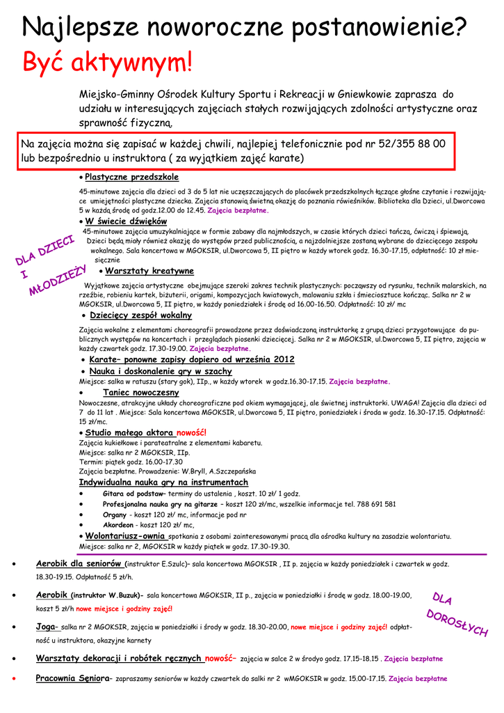 Najlepsze noworoczne postanowienie? Być aktywnym! Miejsko-Gminny Ośrodek Kultury Sportu i Rekreacji w Gniewkowie zaprasza do udziału w interesujących zajęciach stałych rozwijających zdolności artystyczne oraz sprawność fizyczną. Na zajęcia można się zapisać w każdej chwili, najlepiej telefonicznie pod nr 52/355 88 00 lub bezpośrednio u instruktora ( za wyjątkiem zajęć karate) Plastyczne przedszkole 45-minutowe zajęcia dla dzieci od 3 do 5 lat nie uczęszczających do placówek przedszkolnych łączące głośne czytanie i rozwijające umiejętności plastyczne dziecka. Zajęcia stanowią świetną okazję do poznania rówieśników. Biblioteka dla Dzieci, ul.Dworcowa 5 w każdą środę od godz.12.00 do 12.45. Zajęcia bezpłatne. W świecie dźwięków A DL I I IEC Z D Y Warsztaty kreatywne IEŻ Z D Wyjątkowe zajęcia artystyczne obejmujące szeroki zakres technik plastycznych: począwszy od rysunku, technik malarskich, na O MŁ 45-minutowe zajęcia umuzykalniające w formie zabawy dla najmłodszych, w czasie których dzieci tańczą, ćwiczą i śpiewają. Dzieci będą miały również okazję do występów przed publicznością, a najzdolniejsze zostaną wybrane do dziecięcego zespołu wokalnego. Sala koncertowa w MGOKSIR, ul.Dworcowa 5, II piętro w każdy wtorek godz. 16.30-17.15, odpłatność: 10 zł miesięcznie rzeźbie, robieniu kartek, biżuterii, origami, kompozycjach kwiatowych, malowaniu szkła i śmieciosztuce kończąc. Salka nr 2 w MGOKSIR, ul.Dworcowa 5, II piętro, w każdy poniedziałek i środę od 16.00-16.50. Odpłatność: 10 zł/ mc Dziecięcy zespół wokalny Zajęcia wokalne z elementami choreografii prowadzone przez doświadczoną instruktorkę z grupą dzieci przygotowujące do publicznych występów na koncertach i przeglądach piosenki dziecięcej. Salka nr 2 w MGOKSIR, ul.Dworcowa 5, II piętro, zajęcia w każdy czwartek godz. 17.30-19.00. Zajęcia bezpłatne. Karate– ponowne zapisy dopiero od września 2012 Nauka i doskonalenie gry w szachy Miejsce: salka w ratuszu (stary gok), IIp., w każdy wtorek w godz.16.30-17.15. Zajęcia bezpłatne. Taniec nowoczesny Nowoczesne, atrakcyjne układy choreograficzne pod okiem wymagającej, ale świetnej instruktorki. UWAGA! Zajęcia dla dzieci od 7 do 11 lat . Miejsce: Sala koncertowa MGOKSIR, ul.Dworcowa 5, II piętro, poniedziałek i środa w godz. 16.30-17.15. Odpłatność: 15 zł/mc. Studio małego aktora nowość! Zajęcia kukiełkowe i parateatralne z elementami kabaretu. Miejsce: salka nr 2 MGOKSIR, IIp. Termin: piątek godz. 16.00-17.30 Zajęcia bezpłatne. Prowadzenie: W.Bryll, A.Szczepańska Indywidualna nauka gry na instrumentach Gitara od podstaw– terminy do ustalenia , koszt. 10 zł/ 1 godz. Profesjonalna nauka gry na gitarze – koszt 120 zł/mc, wszelkie informacje tel. 788 691 581 Organy - koszt 120 zł/ mc, informacje pod nr Akordeon - koszt 120 zł/ mc, Wolontariusz-ownia spotkania z osobami zainteresowanymi pracą dla ośrodka kultury na zasadzie wolontariatu. Miejsce: salka nr 2, MGOKSIR w każdy piątek w godz. 17.30-19.30. Aerobik dla seniorów (instruktor E.Szulc)– sala koncertowa MGOKSIR , II p. zajęcia w każdy poniedziałek i czwartek w godz. 18.30-19.15. Odpłatność 5 zł/h. Aerobik (instruktor W.Buzuk)- sala koncertowa MGOKSIR, II p., zajęcia w poniedziałki i środę w godz. 18.00-19.00, koszt 5 zł/h nowe miejsce i godziny zajęć! Joga– salka nr 2 MGOKSIR, zajęcia w poniedziałki i środy w godz. 18.30-20.00, nowe miejsce i godziny zajęć! odpłat- DLA DO ROS ność u instruktora, okazyjne karnety Warsztaty dekoracji i robótek ręcznych nowość– zajęcia w salce 2 w środyo godz. 17.15-18.15 . Zajęcia bezpłatne Pracownia Sęniora– zapraszamy seniorów w każdy czwartek do salki nr 2 wMGOKSIR w godz. 15.00-17.15. Zajęcia bezpłatne ŁYC H