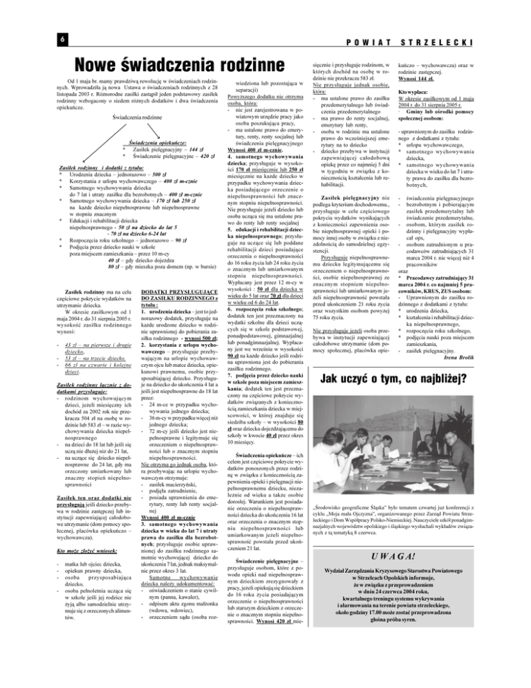 6 P O W I A T Nowe wiadczenia rodzinne Od 1 maja br. mamy prawdziw¹ rewolucjê w wiadczeniach rodzinnych. Wprowadzi³a j¹ nowa wiedziona lub pozostaj¹ca w Ustawa o wiadczeniach rodzinnych z 28 listopada 2003 r. Ró¿norodne zasi³ki zast¹pi³ jeden podstawowy zasi³ek rodzinny wzbogacony o siedem ró¿nych dodatków i dwa wiadczenia opiekuñcze. separacji) Powy¿szego dodatku nie otrzyma osoba, która: - osoba poszukuj¹ca pracy, - ma ustalone prawo do emerytury, renty, renty socjalnej lub wiadczenia opiekuñcze: Zasi³ek rodzinny * Zasi³ek pielêgnacyjny 144 z³ * wiadczenie pielêgnacyjne 420 z³ i dodatki z tytu³u: Korzystania z urlopu wychowawczego 400 z³ m-cznie Samotnego wychowywania dziecka do 7 lat i utraty zasi³ku dla bezrobotnych 400 z³ m-cznie Samotnego wychowywania dziecka 170 z³ lub 250 z³ ka¿de dziecko niepe³nosprawne lub niepe³nosprawne w stopniu znacznym * 4. samotnego wychowywania ci 170 z³ miesiêcznie lub 250 z³ * na Wynosi 400 z³ m-cznie. dziecka; przys³uguje w wysoko- Urodzenia dziecka jednorazowo 500 z³ * miesiêcznie na ka¿de dziecko w przypadku wychowywania dziecka posiadaj¹cego orzeczenie o niepe³nosprawnoci lub znacznym stopniu niepe³nosprawnoci. Nie przys³uguje je¿eli dziecko lub osoba ucz¹ca siê ma ustalone pra- Edukacji i rehabilitacji dziecka wo do renty lub renty socjalnej niepe³nosprawnego - 50 z³ na dziecko do lat 5 5. - 70 z³ na dziecko 6-24 lat * Rozpoczêcia roku szkolnego jednorazowo 90 z³ * Podjêcia przez dziecko nauki w szkole edukacji i rehabilitacji dziec- ka niepe³nosprawnego; przys³uguje na ucz¹ce siê lub poddane rehabilitacji dzieci posiadaj¹ce poza miejscem zamieszkania przez 10 m-cy orzeczenia o niepe³nosprawnoci 40 z³ gdy dziecko doje¿dza 80 z³ gdy mieszka poza domem (np. w bursie) do 16 roku ¿ycia lub 24 roku ¿ycia o znacznym lub umiarkowanym stopniu niepe³nosprawnoci. Wyp³acany jest przez 12 m-cy w Zasi³ek rodzinny ma na celu DODATKI PRZYS£UGUJ¥CE czêciowe pokrycie wydatków na DO ZASI£KU RODZINNEGO z utrzymanie dziecka. tytu³u : W okresie zasi³kowym od 1 1. urodzenia dziecka jest to jed- maja 2004 r. do 31 sierpnia 2005 r. norazowy dodatek, przys³uguje na wysokoæ ka¿de urodzone dziecko w rodzi- zasi³ku rodzinnego nie uprawnionej do pobierania za- wynosi: si³ku rodzinnego - - wynosi 500 z³; 43 z³ na pierwsze i drugie 2. korzystania z urlopu wycho- dziecko , wawczego przys³uguje przeby- - 53 z³ na trzecie dziecko, waj¹cym na urlopie wychowaw- - 66 z³ na czwarte i kolejne czym ojcu lub matce dziecka, opie- dzieci. kunowi prawnemu, osobie przysposabiaj¹cej dziecko. Przys³ugu- Zasi³ek rodzinny ³¹cznie z do- je na dziecko do ukoñczenia 4 lat a datkami przys³uguje: jeli jest niepe³nosprawne do 18 lat - rodzinom wychowuj¹cym dzieci, je¿eli miesiêczny ich przez: - kracza 504 z³ na osobê w ro- - - - 36 m-cy w przypadku wiêcej ni¿ jednego dziecka; dzinie lub 583 z³ w razie wychowywania dziecka niepe³- 24 m-ce w przypadku wychowywania jednego dziecka; dochód za 2002 rok nie prze- - 72 m-cy jeli dziecko jest nie- nosprawnego pe³nosprawne i legitymuje siê na dzieci do 18 lat lub jeli siê orzeczeniem o niepe³nospraw- ucz¹ nie d³u¿ej ni¿ do 21 lat, noci lub o znacznym stopniu na ucz¹ce siê niepe³nosprawnoci. dziecko niepe³- do 24 lat, gdy ma Nie otrzyma go jednak osoba, któ- orzeczony umiarkowany lub ra przebywaj¹c na urlopie wycho- znaczny wawczym otrzymuje: nosprawne stopieñ niepe³no- sprawnoci Zasi³ek ten oraz dodatki nie - zasi³ek macierzyñski, - podjê³a zatrudnienie, - posiada uprawnienia do eme- przys³uguj¹ jeli dziecko przeby- rytury, renty lub renty socjal- wa w rodzinie zastêpczej lub in- nej stytucji zapewniaj¹cej ca³odobo- Wynosi 400 z³ m-cznie we utrzymanie (dom pomocy spo- 3. ³ecznej, placówka opiekuñczo dziecka w wieku do lat 7 i utraty wychowawcza). prawa do zasi³ku dla bezrobot- s a mo tn e g o wy c h o wy wa n i a nych; przys³uguje osobie uprawKto mo¿e z³o¿yæ wniosek: nionej do zasi³ku rodzinnego samotnie wychowuj¹cej dziecko do - matka lub ojciec dziecka, ukoñczenia 7 lat, jednak maksymal- - opiekun prawny dziecka, nie przez okres 3 lat. - osoba - Samotne przysposabiaj¹ca wychowywanie dziecko, dziecka nale¿y udokumentowaæ: osoba pe³noletnia ucz¹ca siê - ¿yj¹ albo samodzielnie utrzy- - odpisem aktu zgonu ma³¿onka (wdowa, wdowiec), muje siê z orzeczonych alimentów. owiadczeniem o stanie cywilnym (panna, kawaler), w szkole jeli jej rodzice nie - kuñczo wychowawcza) oraz w rodzinie zastêpczej. dzinie nie przekracza 583 z³. Wynosi 144 z³. Nie przys³uguje jednak osobie, która: Kto wyp³aca: - W okresie zasi³kowym od 1 maja orzeczeniem s¹du (osoba roz- wysokoci : 50 z³ dla dziecka w wieku do 5 lat oraz 70 z³ dla dzieci w wieku od 6 do 24 lat. 6. rozpoczêcia roku szkolnego; dodatek ten jest przeznaczony na wydatki szkolne dla dzieci ucz¹cych siê w szkole podstawowej, ponadpodstawowej, gimnazjalnej lub ponadgimnazjalnej. Wyp³acany jest we wrzeniu w wysokoci 90 z³ na ka¿de dziecko jeli rodzi- ma ustalone prawo do zasi³ku przedemerytalnego lub wiad- 2004 r. do 31 sierpnia 2005 r. czenia przedemerytalnego · - ma prawo do renty socjalnej, spo³ecznej osobom: - osoba w rodzinie ma ustalone - uprawnionym do zasi³ku prawo do wczeniejszej eme- nego Gminy lub orodki pomocy emerytury lub renty, wiadczenia pielêgnacyjnego * * siêcznie i przys³uguje rodzinom, w których dochód na osobê w ro- nie jest zarejestrowana w powiatowym urzêdzie pracy jako wiadczenia rodzinne S T R Z E L E C K I - rytury na to dziecko * urlopu wychowawczego, dziecko przebywa w instytucji * samotnego zapewniaj¹cej ca³odobow¹ opiekê przez co najmniej 5 dni 7. podjêcia przez dziecko nauki w szkole poza miejscem zamiesz- wychowywania dziecka, * samotnego wychowywania w tygodniu w zwi¹zku z ko- dziecka w wieku do lat 7 i utra- niecznoci¹ kszta³cenia lub re- ty prawa do zasi³ku dla bezro- habilitacji. botnych, nie - wiadczeni
