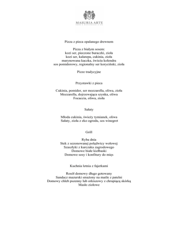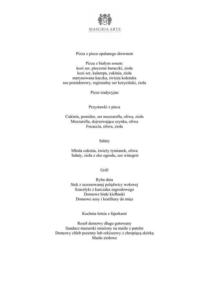 Pizza z pieca opalanego drewnem Pizza z białym sosem: kozi ser, pieczone buraczki, zioła kozi ser, kalarepa, cukinia, zioła marynowana kaczka, świeża kolendra sos pomidorowy, regionalny ser koryciński, zioła Pizze tradycyjne Przystawki z pieca Cukinia, pomidor, ser mozzarella, oliwa, zioła Mozzarella, dojrzewająca szynka, oliwa Focaccia, oliwa, zioła Sałaty Młoda cukinia, świeży tymianek, oliwa Sałaty, zioła z eko ogrodu, sos winegret Grill Ryba dnia Stek z sezonowanej polędwicy wołowej Szaszłyki z kurczaka zagrodowego Domowe białe kiełbaski Domowe sosy i konfitury do mięs Kuchnia letnia z fajerkami Rosół domowy długo gotowany Sandacz mazurski smażony na maśle z patelni Domowy chleb pszenny lub orkiszowy z chrupiącą skórką Masło ziołowe