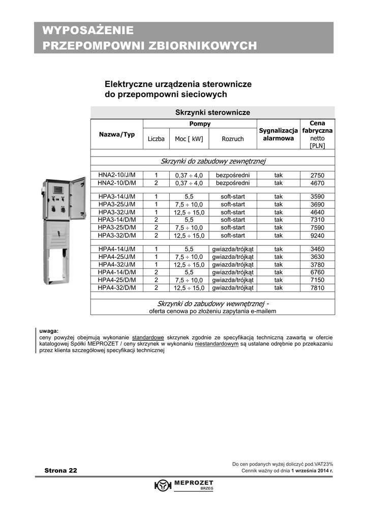 WYPOSAŻENIE PRZEPOMPOWNI ZBIORNIKOWYCH Elektryczne urządzenia sterownicze do przepompowni sieciowych Skrzynki sterownicze Pompy Nazwa/Typ Liczba Moc [ kW] Rozruch Cena Sygnalizacja fabryczna alarmowa netto [PLN] Skrzynki do zabudowy zewnętrznej HNA2-10/J/M HNA2-10/D/M 1 2 0,37 4,0 0,37 4,0 bezpośredni bezpośredni tak tak 2750 4670 HPA3-14/J/M HPA3-25/J/M HPA3-32/J/M HPA3-14/D/M HPA3-25/D/M HPA3-32/D/M 1 1 1 2 2 2 5,5 7,5 10,0 12,5 15,0 5,5 7,5 10,0 12,5 15,0 soft-start soft-start soft-start soft-start soft-start soft-start tak tak tak tak tak tak 3590 3690 4640 7310 7590 9240 HPA4-14/J/M HPA4-25/J/M HPA4-32/J/M HPA4-14/D/M HPA4-25/D/M HPA4-32/D/M 1 1 1 2 2 2 5,5 7,5 10,0 12,5 15,0 5,5 7,5 10,0 12,5 15,0 gwiazda/trójkąt gwiazda/trójkąt gwiazda/trójkąt gwiazda/trójkąt gwiazda/trójkąt gwiazda/trójkąt tak tak tak tak tak tak 3460 3630 3780 6760 7150 7810 Skrzynki do zabudowy wewnętrznej oferta cenowa po złożeniu zapytania e-mailem uwaga: ceny powyżej obejmują wykonanie standardowe skrzynek zgodnie ze specyfikacją techniczną zawartą w ofercie katalogowej Spółki MEPROZET / ceny skrzynek w wykonaniu niestandardowym są ustalane odrębnie po przekazaniu przez klienta szczegółowej specyfikacji technicznej Do cen podanych wyżej doliczyć pod.VAT23% Cennik ważny od dnia 1 września 2014 r. Strona 22 MEPROZET BRZEG