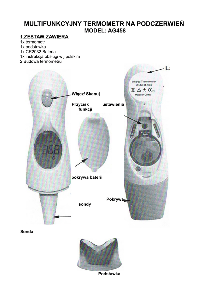 MULTIFUNKCYJNY TERMOMETR NA PODCZERWIEŃ MODEL: AG458 1.ZESTAW ZAWIERA 1x termometr 1x podstawka 1x CR2032 Bateria 1x instrukcja obsługi w j polskim 2.Budowa termometru Włącz/ Skanuj Przycisk funkcji ustawienia pokrywa baterii Pokrywa sondy Sonda Podstawka 2.ZNACZENIE SYMBOLI Pomiar temperatury w trakcie Tryb pomiaru UCHO Tryb pomiaru CZOŁO Gorączka Skala Celsjusza Skala Fahrenheit Zegar Niski poziom baterii Ostatni pomiar temperatury 3.USTAWIENIA Aby ustawić funkcje, zdejmij pokrywę baterii, usuń folię zabezpieczającą z baterii, wciśnij przycisk Power/Scan na przednim panelu a następnie czarnym przyciskiem znajdującym się nad baterią wybierz funkcję którą chcesz ustawić. Wciśnij czarny przycisk aby wejść w tryb ustawień, odczekaj 2 sek aby wejść w sub menu automatycznie. Poniżej znajduje się lista i ustawień: F-1 skala Celsjusza/ Fahrenheita- ustawiamy jednostkę w której ma być podana temperatura F-2 ustawiamy miejsce pomiaru - Tryb FACE- do mierzenia temperatury obiektów, Tryb BODY do mierzenia temperatury ciała w uchu lub na czole. F-3 ustawienie czasu- gdy ustawisz czas temperatura w pomieszczeniu i czas wyświetlać się będą na zmianę F-4 zakres temperatury – pomiar od 0.1 dla trybu pomiaru temperatury Ucho/Czoła F-5 podświetlenie wyświetlacza pomarańczowe- ustawienie fabryczne-wyświetlacz podświetli się na pomarańczowo w zakresie temperatury od 37,5 do 37,9, kiedy temperatura osiągnie ten poziom od razu zauważysz zmianę koloru wyświetlacza na pomarańczowy. F-6 podświetlenie wyświetlacza czerwoneustawienie fabryczne -wyświetlacz podświetli się na czerwono w zakresie od 38,0st C do 42,9 st C, kiedy temperatura osiągnie osiągnie ten poziom od razu zaważysz zmianę koloru podświetlenia na czerwone. Próg zmiany koloru wyświetlacza można ustawiać w zależności o potrzeb, możesz ustawić pomarańczowe podświetlenie np. od temperatury 37,9 st C a czerwone od temperatury 38,7 st C. 4.POMIAR TEMPERATURY Kiedy pokrywa sondy jest założona pomiar ustawiony w trybie F-2 BODY(patrz pkt.3) na wyświetlaczu pojawi się tryb pomiaru CZOŁO, wtedy termometr jest w trybie pomiaru temperatury z czoła, kiedy zdejmiemy pokrywę sondy tryb zmienia się na pomiar temperatury z ucha. JAK MIERZYC TEMPERATURĘ? CZOŁO Włączony termometr przyłóż do skroni, wciśnij przycisk ,,Włącz/Skanuj'' przytrzymując przycisk przeciągnij termometr delikatnie po czole, zwolnij przycisk ,,Włącz/Skanuj'', termometr wyda dźwięk dając sygnał że pomiar został zakończony UCHO Włącz termometr, zdejmij pokrywę sondy, termometr przestawi się na tryb pomiaru z ucha, włóż sondę do ucha na tyle ile pozwala rozmiar ucha, wciśnij przycisk ,,Włącz/Skanuj" jeden raz. Termometr wyda dźwięk dając sygnał, że pomiar temperatury został zakończony. OBIEKT Ustaw na termometrze z nałożoną pokrywą sondy tryb pomiaru FACE ( patrz pkt. 3 tryb F-2). Aby dokonać pomiaru temperatury obiektu przybliż termometr do obiektu na odległość ok 1 cm, wciśnij przycisk ,,Włącz/Skanuj'' i przytrzymaj ok 3 sek, po tym czasie termometr wyda dźwięk dając sygnał ze pomiar został zakończony. 5. WYMIANA BATERII Niski poziom baterii będzie wskazany na ikonce która pojawi się w dole ekranu. Należy wymienić baterię w jak najszybszym czasie, pomimo tego iż termometr będzie jeszcze działał jakiś czas. Całkowite wyczerpanie baterii będzie zasygnalizowane poprzez miganie ikonki baterii, na ekranie wyświetli się komunikat ,,Lo'', pojawi się również sygnał dźwiękowy alarmujący o skrajnym poziomie wyczerpania. Termometr się wyłączy automatycznie. Aby wymienić baterię należy otworzyć pokrywę baterii znajdującą się z tyłu urządzenia, wyciągnąć baterię, włożyć nowa baterię tego samego typu. 6.ŚRODKI OSTROŻNOŚCI Przed użyciem włóż baterię do termometru, usuń foliowe zabezpieczenie z gniazda baterii. Zapoznaj się z instrukcją. Po użyciu termometr powinien być wyczyszczony, użyj środka dezynfekującego lub lekko zwilżonej alkoholem bawełnianej szmatki. Termometr nie jest wodoodporny, ani wodoszczelny, nie umieszczaj w wodzie, nie mierz temperatury podczas kąpieli. Nie narażaj termometru na ekstremalne (zbyt niskie i zbyt wysokie) temperatury. Przechowywać termometr należy w temperaturze pokojowej. Nie rzucać, nie upuszczać, termometr jest wrażliwy na wstrząsy. Unikać dotykania palcami końcówki sondy. Nie demontować urządzenia. W zestawie nie ma nakładek douszne na sondę, należy utrzymywać sondę w czystości, oczyszczać z woskowiny, innych wydzielin i zabrudzeń. Nie dokonywać pomiaru w ciągu 30 min po posiłku, ćwiczeniach czy kąpieli Kiedy występują duże wahania temperatury otoczenia,przed pomiarem należy odczekać 30 min aby termometr ustabilizował temperaturę i następnie dokonać pomiaru. Czas pomiędzy pomiarami powinien wynosić nie mniej niż 10 sek