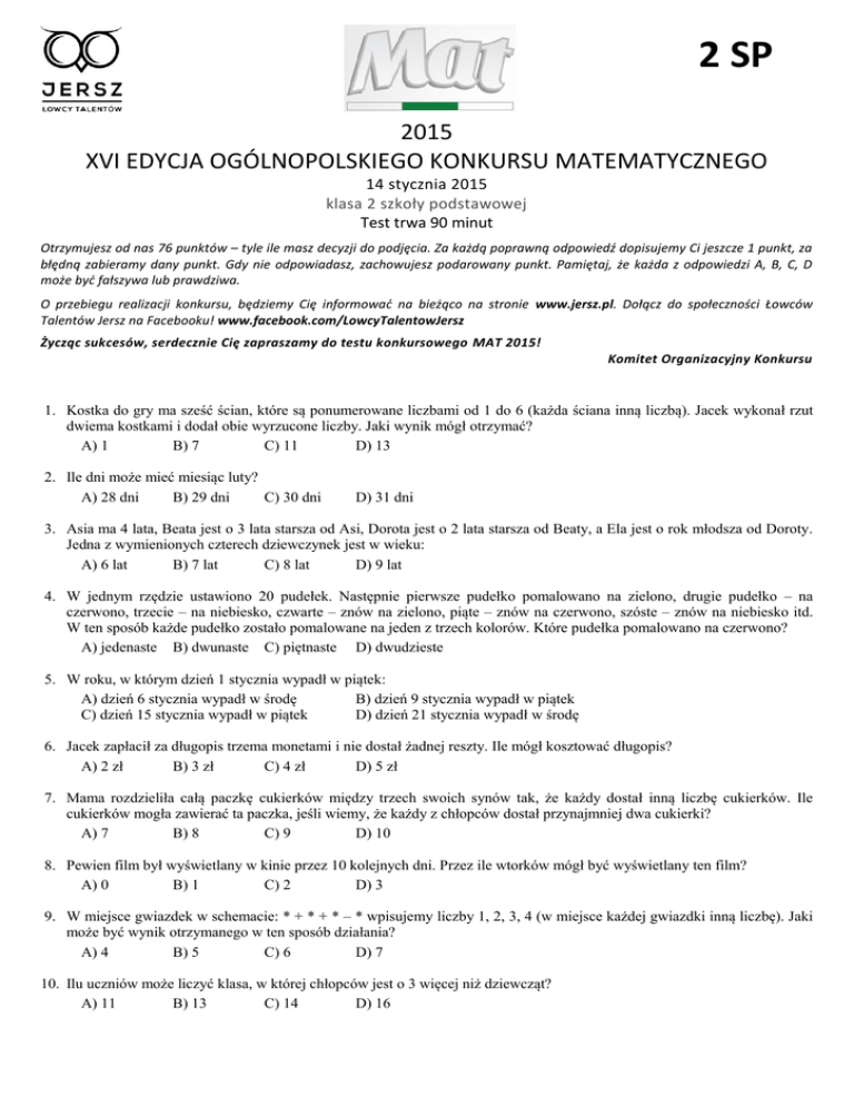 2 SP 0d 2015 XVI EDYCJA OGÓLNOPOLSKIEGO KONKURSU MATEMATYCZNEGO 14 stycznia 2015 klasa 2 szkoły podstawowej Test trwa 90 minut Otrzymujesz od nas 76 punktów – tyle ile masz decyzji do podjęcia. Za każdą poprawną odpowiedź dopisujemy Ci jeszcze 1 punkt, za błędną zabieramy dany punkt. Gdy nie odpowiadasz, zachowujesz podarowany punkt. Pamiętaj, że każda z odpowiedzi A, B, C, D może być fałszywa lub prawdziwa. O przebiegu realizacji konkursu, będziemy Cię informować na bieżąco na stronie www.jersz.pl. Dołącz do społeczności Łowców Talentów Jersz na Facebooku! www.facebook.com/LowcyTalentowJersz Życząc sukcesów, serdecznie Cię zapraszamy do testu konkursowego MAT 2015! Komitet Organizacyjny Konkursu 1. Kostka do gry ma sześć ścian, które są ponumerowane liczbami od 1 do 6 (każda ściana inną liczbą). Jacek wykonał rzut dwiema kostkami i dodał obie wyrzucone liczby. Jaki wynik mógł otrzymać? A) 1 B) 7 C) 11 D) 13 2. Ile dni może mieć miesiąc luty? A) 28 dni B) 29 dni C) 30 dni D) 31 dni 3. Asia ma 4 lata, Beata jest o 3 lata starsza od Asi, Dorota jest o 2 lata starsza od Beaty, a Ela jest o rok młodsza od Doroty. Jedna z wymienionych czterech dziewczynek jest w wieku: A) 6 lat B) 7 lat C) 8 lat D) 9 lat 4. W jednym rzędzie ustawiono 20 pudełek. Następnie pierwsze pudełko pomalowano na zielono, drugie pudełko – na czerwono, trzecie – na niebiesko, czwarte – znów na zielono, piąte – znów na czerwono, szóste – znów na niebiesko itd. W ten sposób każde pudełko zostało pomalowane na jeden z trzech kolorów. Które pudełka pomalowano na czerwono? A) jedenaste B) dwunaste C) piętnaste D) dwudzieste 5. W roku, w którym dzień 1 stycznia wypadł w piątek: A) dzień 6 stycznia wypadł w środę B) dzień 9 stycznia wypadł w piątek C) dzień 15 stycznia wypadł w piątek D) dzień 21 stycznia wypadł w środę 6. Jacek zapłacił za długopis trzema monetami i nie dostał żadnej reszty. Ile mógł kosztować długopis? A) 2 zł B) 3 zł C) 4 zł D) 5 zł 7. Mama rozdzieliła całą paczkę cukierków między trzech swoich synów tak, że każdy dostał inną liczbę cukierków. Ile cukierków mogła zawierać ta paczka, jeśli wiemy, że każdy z chłopców dostał przynajmniej dwa cukierki? A) 7 B) 8 C) 9 D) 10 8. Pewien film był wyświetlany w kinie przez 10 kolejnych dni. Przez ile wtorków mógł być wyświetlany ten film? A) 0 B) 1 C) 2 D) 3 9. W miejsce gwiazdek w schemacie: * + * + * – * wpisujemy liczby 1, 2, 3, 4 (w miejsce każdej gwiazdki inną liczbę). Jaki może być wynik otrzymanego w ten sposób działania? A) 4 B) 5 C) 6 D) 7 10. Ilu uczniów może liczyć klasa, w której chłopców jest o 3 więcej niż dziewcząt? A) 11 B) 13 C) 14 D) 16 11. Biało-czarna szachownica o wymiarach 6×6 składa się z 6 rzędów pól, po 6 pól w każdym rzędzie. Jeśli wszystkie pola leżące na brzegu szachownicy (tzn. pola w pierwszym i w szóstym rzędzie oraz pola w pierwszej i w szóstej kolumnie) pomalujemy na niebiesko, to na szachownicy tej będzie: A) dokładnie 10 pól białych B) dokładnie 10 pól czarnych C) dokładnie 10 pól niebieskich D) tyle samo pól białych co pól czarnych 12. Dwa lata temu Agata miała mniej niż 10 lat, a za dwa lata Agata będzie miała więcej niż 12 lat. Ile lat może mieć Agata? A) 9 lat B) 10 lat C) 11 lat D) 12 lat 13. Do sklepu przywieziono 22 kg bananów w kilku skrzynkach. Każda ze skrzynek zawierała 3 kg bananów albo 4 kg bananów. Jaka mogła być liczba skrzynek przywiezionych do sklepu? A) 6 B) 7 C) 8 D) 9 14. Na każdej z sześciu ścian kostki do gry jest od 1 do 6 oczek (na każdej ścianie inna liczba oczek). Wiadomo, że łączna liczba oczek na każdych dwóch leżących naprzeciw siebie ścianach jest taka sama. W takim razie: A) naprzeciw ściany z 2 oczkami jest ściana z 5 oczkami B) naprzeciw ściany z 3 oczkami jest ściana z 6 oczkami C) naprzeciw ściany z 1 oczkiem jest ściana z 4 oczkami D) naprzeciw ściany z 4 oczkami jest ściana z 3 oczkami 15. Jacek ma 12 kolorowych żetonów. Cztery z nich mają jedną stronę czerwoną, a drugą zieloną. Pięć spośród żetonów ma jedną stronę zieloną, a drugą niebieską. Pozostałe trzy żetony mają jedną stronę niebieską, a drugą czerwoną. Jacek rozłożył żetony tak, że 7 z nich leżało stroną czerwoną do góry, a 5 leżało stroną zieloną do góry. Beata wszystkie 12 żetonów odwróciła na drugą stronę. Teraz: A) dokładnie 4 żetony leżą stroną zieloną do góry B) dokładnie 4 żetony leżą stroną czerwoną do góry C) dokładnie 8 żetonów leży stroną niebieską do góry D) dokładnie 4 żetony leżą stroną niebieską do góry 16. Karolina i Marta mają łącznie tyle lat co Staszek. Za ile lat Karolina i Marta będą mieć łącznie o 2 lata więcej niż Staszek? A) za rok B) za 2 lata C) za 3 lata D) za 4 lata 17. Każdy smok zamieszkujący pewną krainę ma dwie nogi i dwie albo trzy głowy. Jeśli wszystkie smoki żyjące w tej krainie mają łącznie 12 nóg i 15 głów, to są tam: A) więcej niż 2 dwugłowe smoki B) więcej niż 3 dwugłowe smoki C) więcej niż 2 trzygłowe smoki D) więcej niż 3 trzygłowe smoki 18. Agata ma taką samą kwotę pieniędzy co Beata, przy czym Agata ma same dwuzłotówki, zaś Beata – same pięciozłotówki. Ile monet mogą mieć łącznie obie dziewczynki? A) 6 B) 7 C) 8 D) 9 19. Jacek ma trzy skarbonki. W pierwszej przechowuje tylko pięciozłotówki, w drugiej – tylko dwuzłotówki, a w trzeciej – tylko monety jednozłotowe. W pierwszej i drugiej skarbonce jest łącznie 5 monet, w drugiej i trzeciej – też jest łącznie 5 monet, zaś w pierwszej i trzeciej skarbonce są łącznie 4 monety. Wobec tego: A) we wszystkich trzech skarbonkach jest łącznie 7 monet B) łączna wartość wszystkich monet Jacka to 18 zł C) w trzeciej skarbonce są 3 monety D) w drugiej skarbonce są 3 monety PATRONI I PARTNER